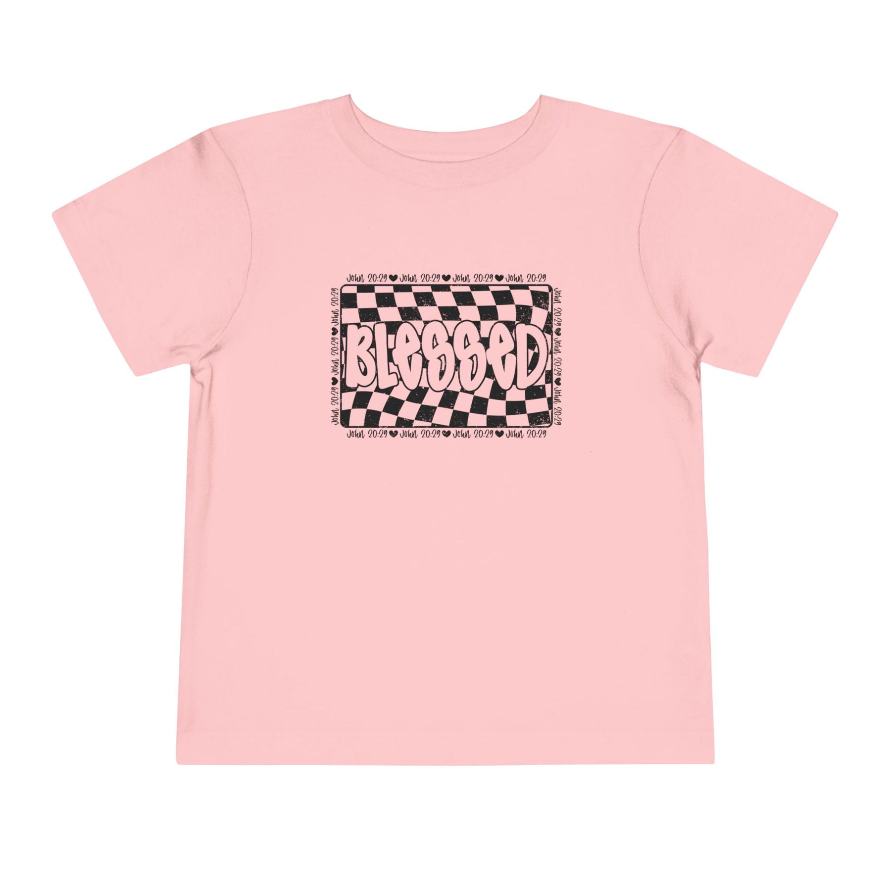 Blessed Toddler Tee, a pink short sleeve t-shirt with black and white checkered design, made from soft cotton for comfort. Ideal for adding style to toddlers' daily wear.