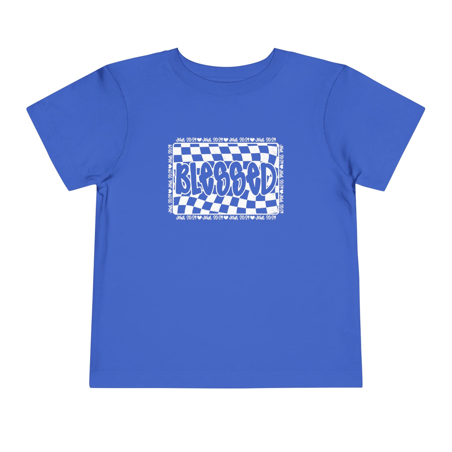 Blessed Toddler Tee: A blue checkered design short sleeve t-shirt for toddlers, made of 100% Airlume cotton, featuring a comfortable tear-away label.