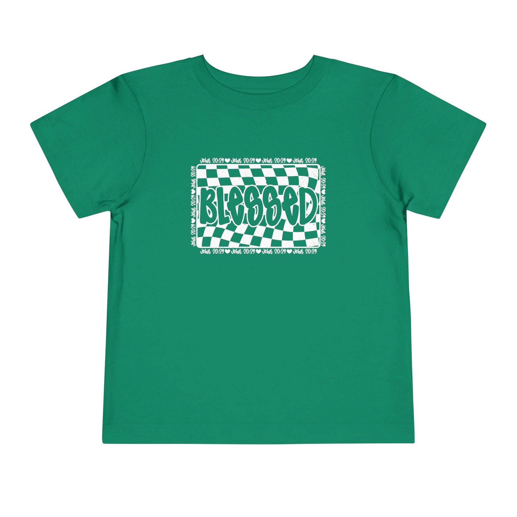 Blessed Toddler Tee: A green t-shirt with white text, designed for toddlers, made of 100% Airlume combed cotton for comfort.