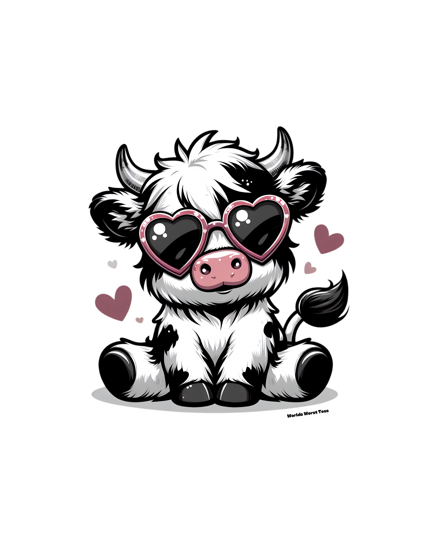 Toddler hoodie featuring a cartoon cow wearing sunglasses. Jersey-lined hood, cover-stitched details, and side seam pockets for durability and coziness. Cute Cow Toddler Hoodie by Worlds Worst Tees.