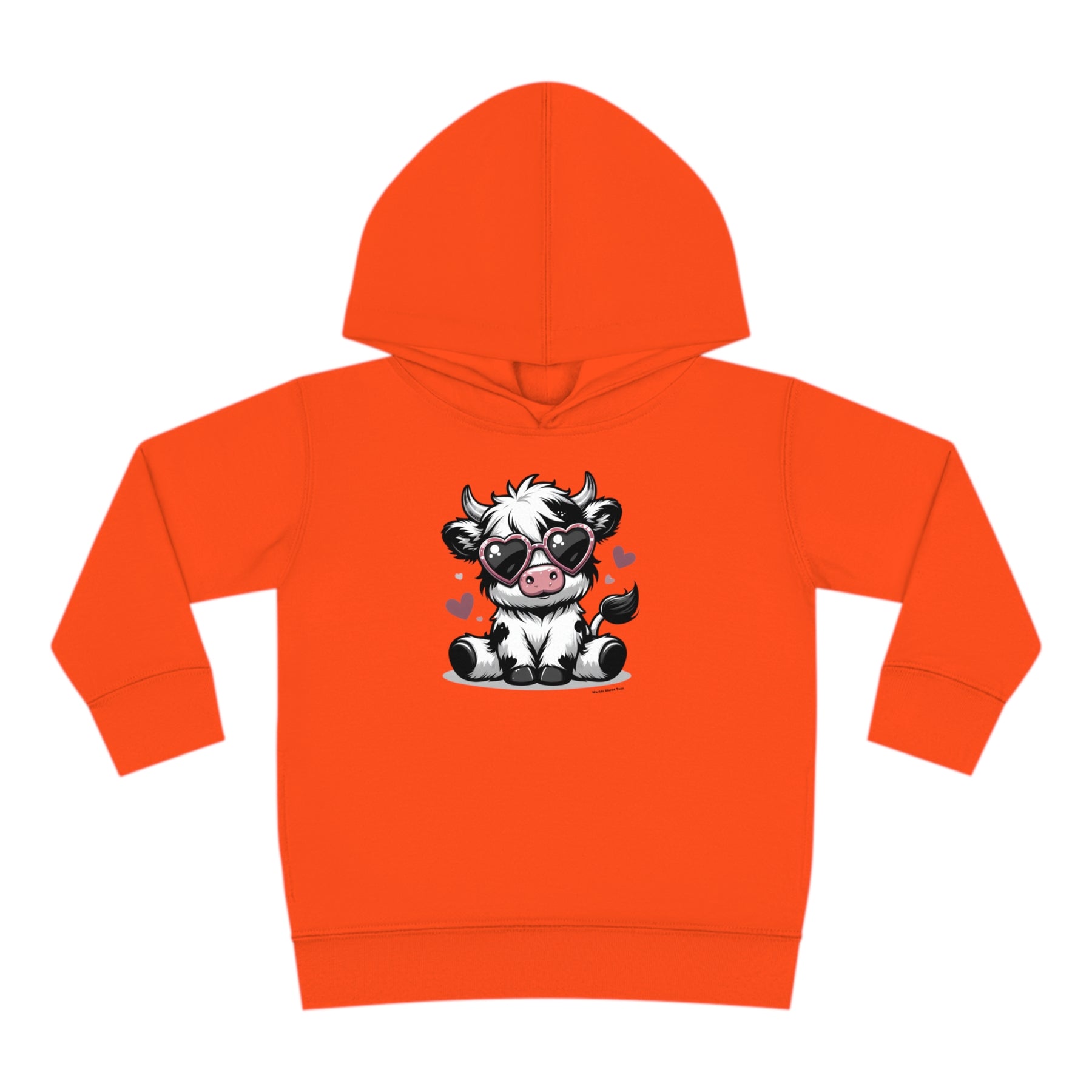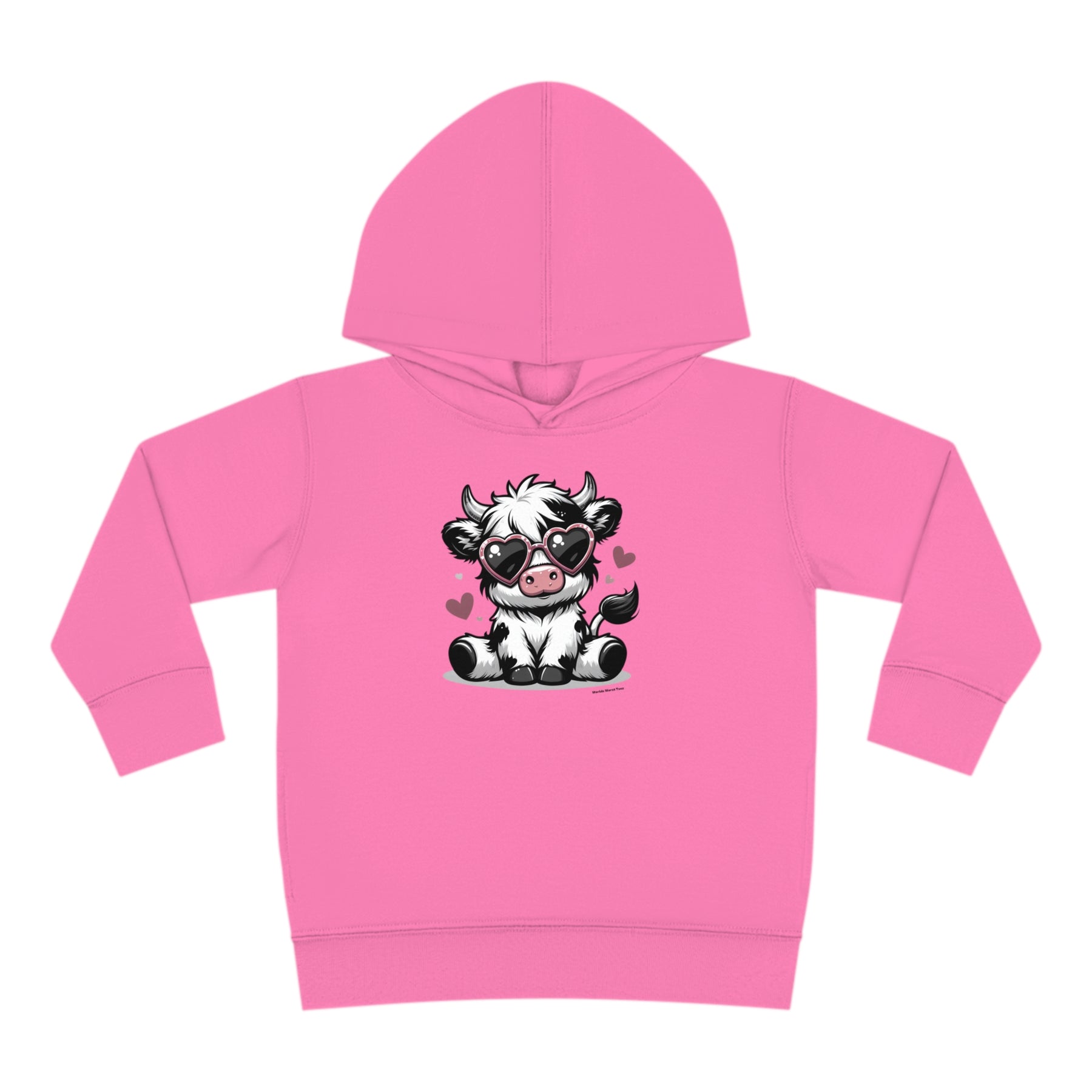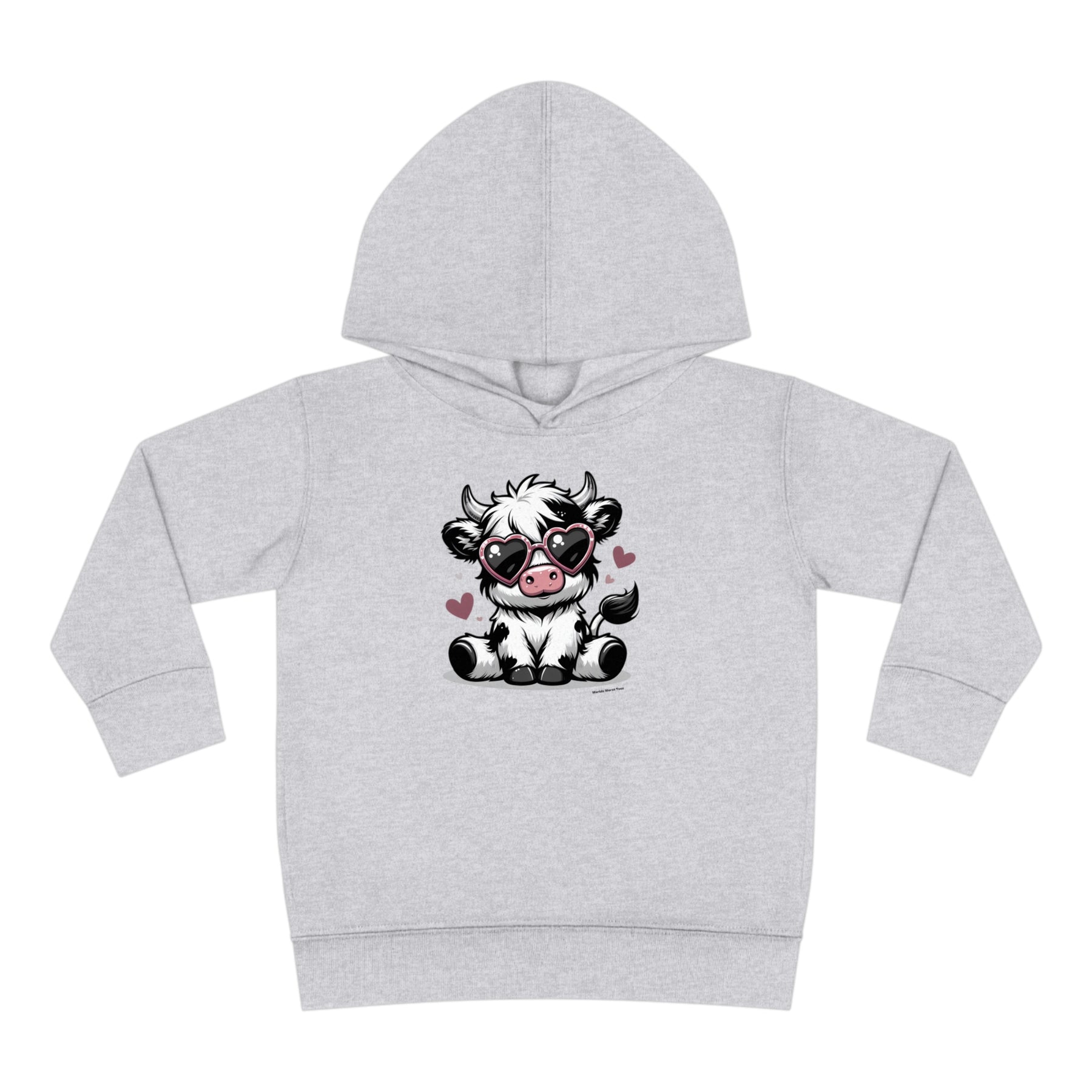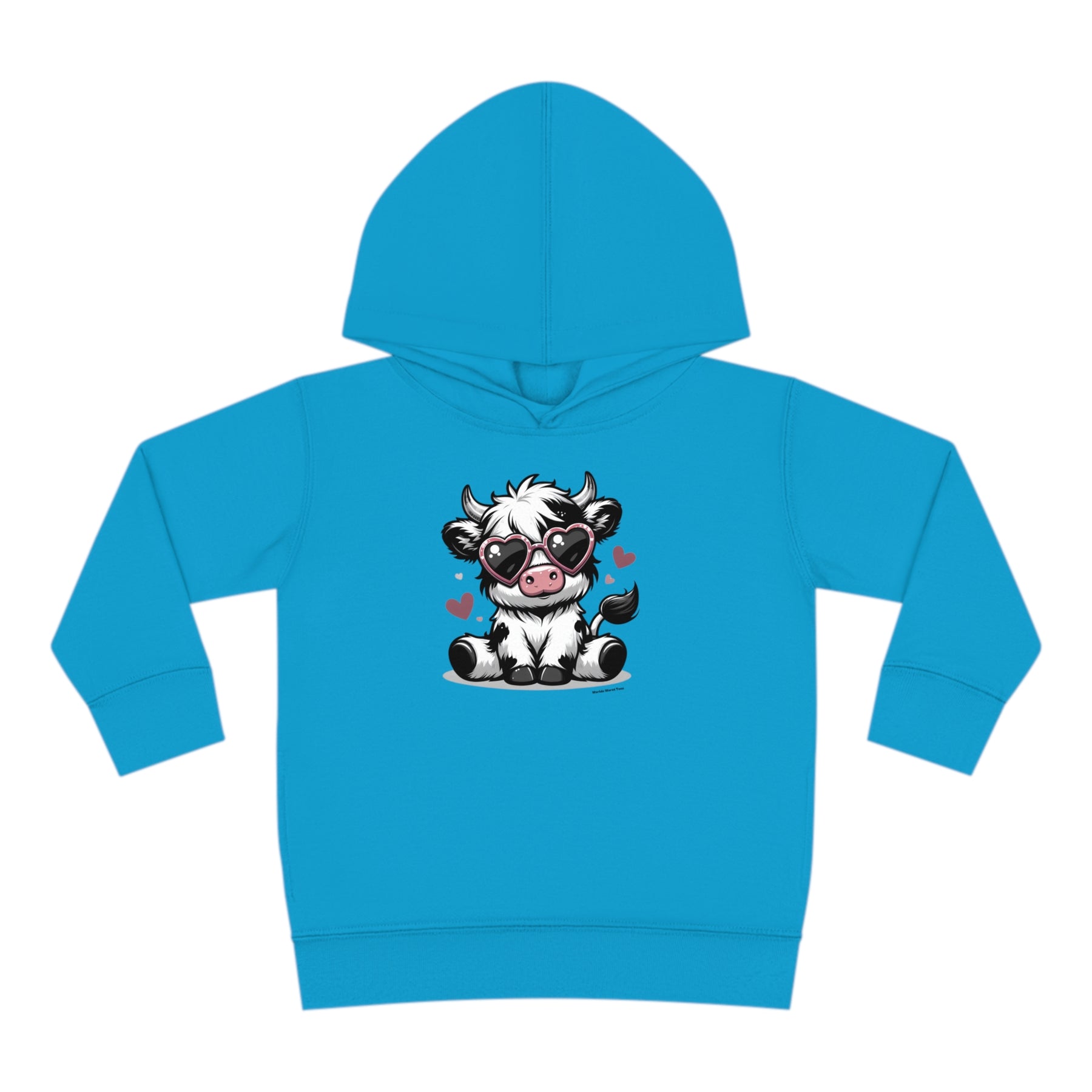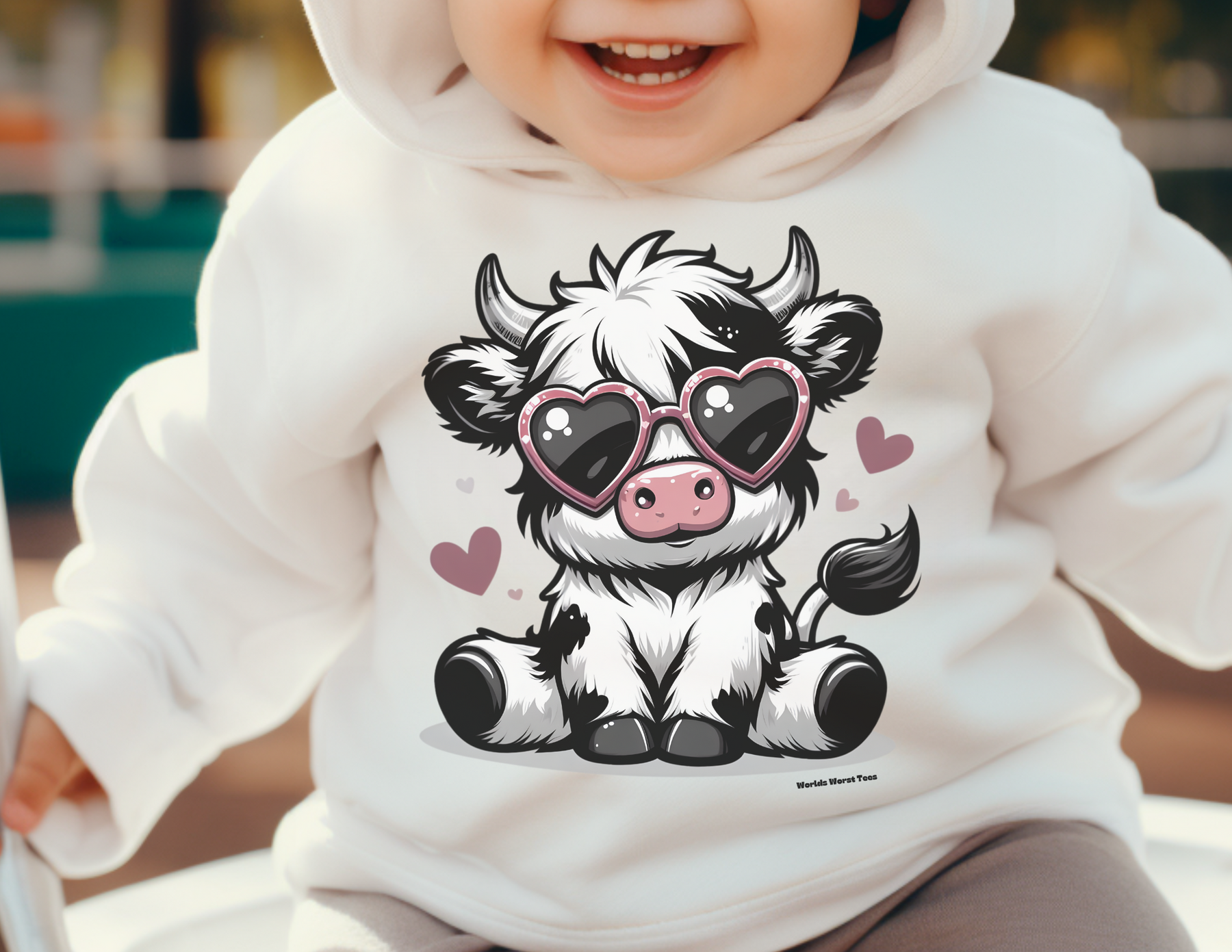 A cute cow toddler hoodie featuring a cartoon cow wearing sunglasses. Designed for comfort with jersey-lined hood and durable stitching. Perfect for cozy days.