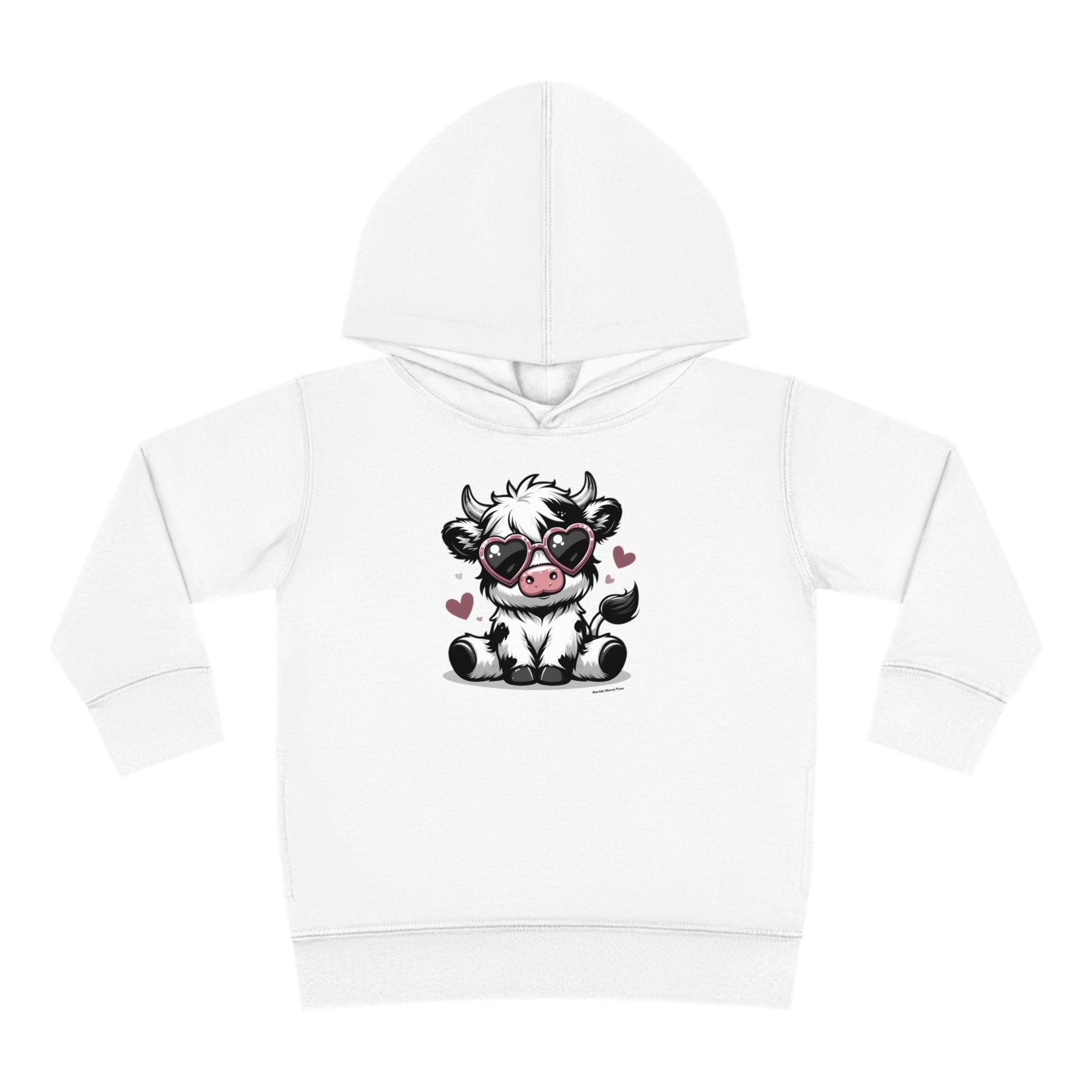 Cute Cow Toddler Hoodie with cartoon cow and sunglasses design, featuring durable hood and side seam pockets for cozy comfort. Ideal for playful kids.