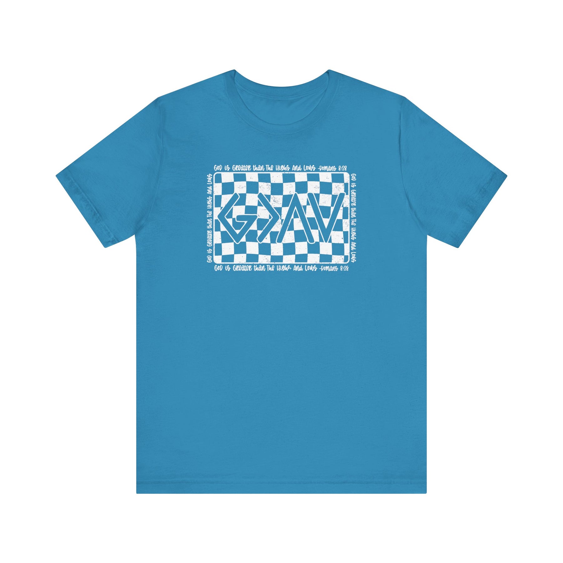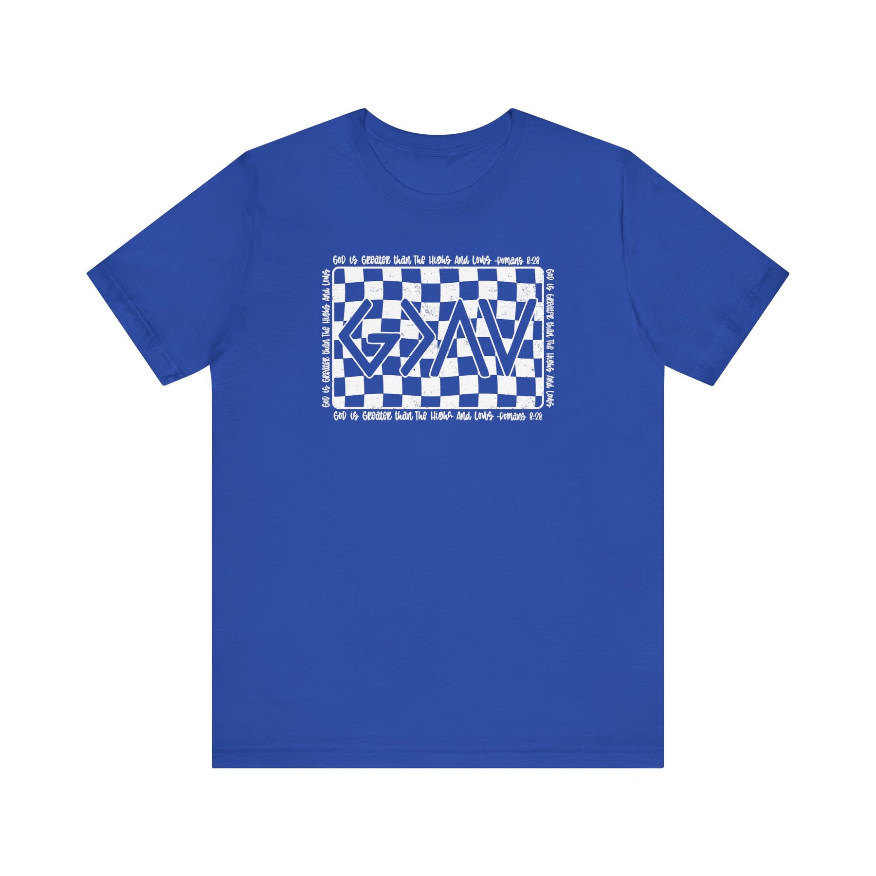 God Highs and Lows Tee: Unisex blue t-shirt with white checkered pattern, featuring soft cotton material and ribbed knit collars for lasting shape and comfort.