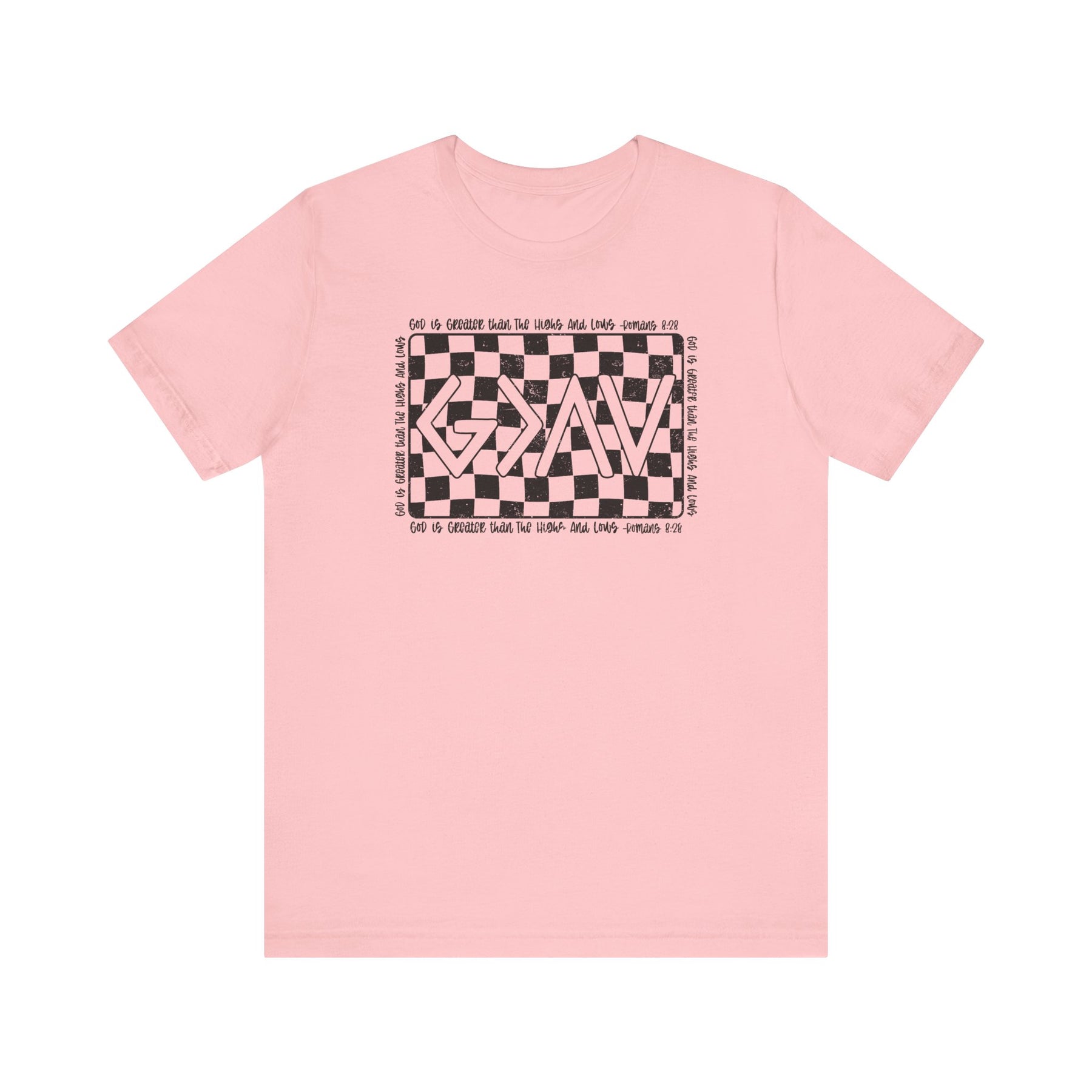 God Highs and Lows Tee featuring a pink base with a black and white checkered pattern. This unisex jersey short sleeve tee offers a soft and comfortable fit.