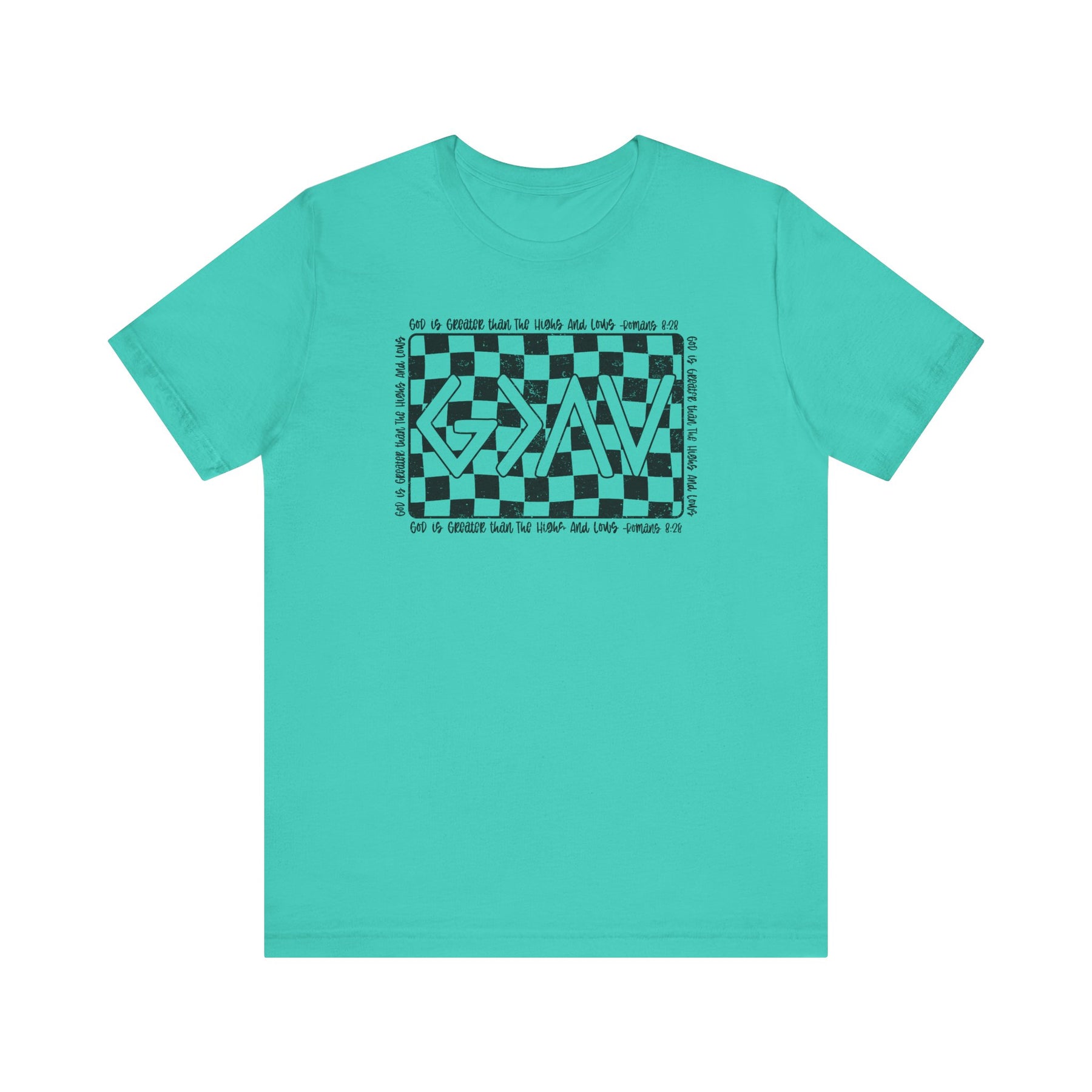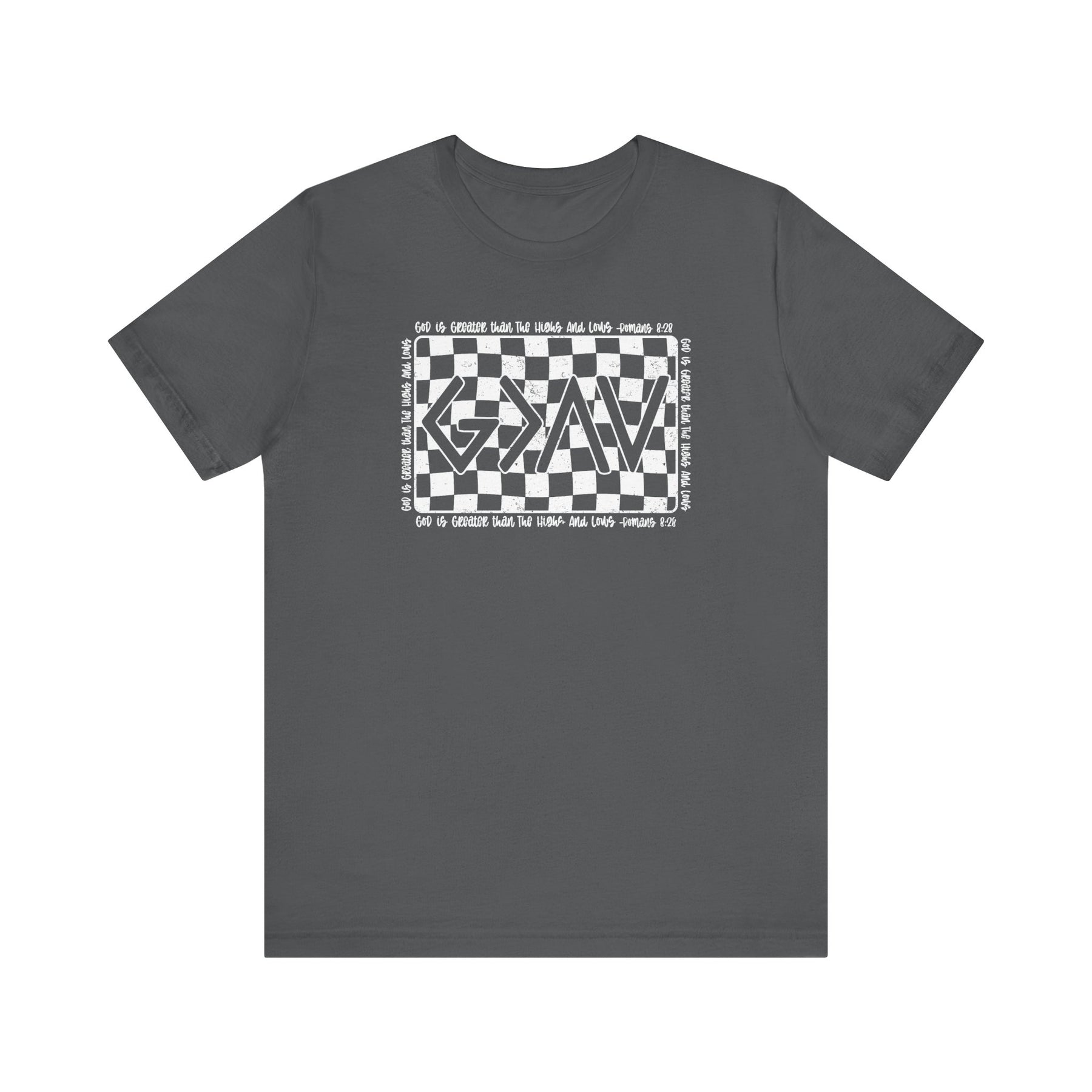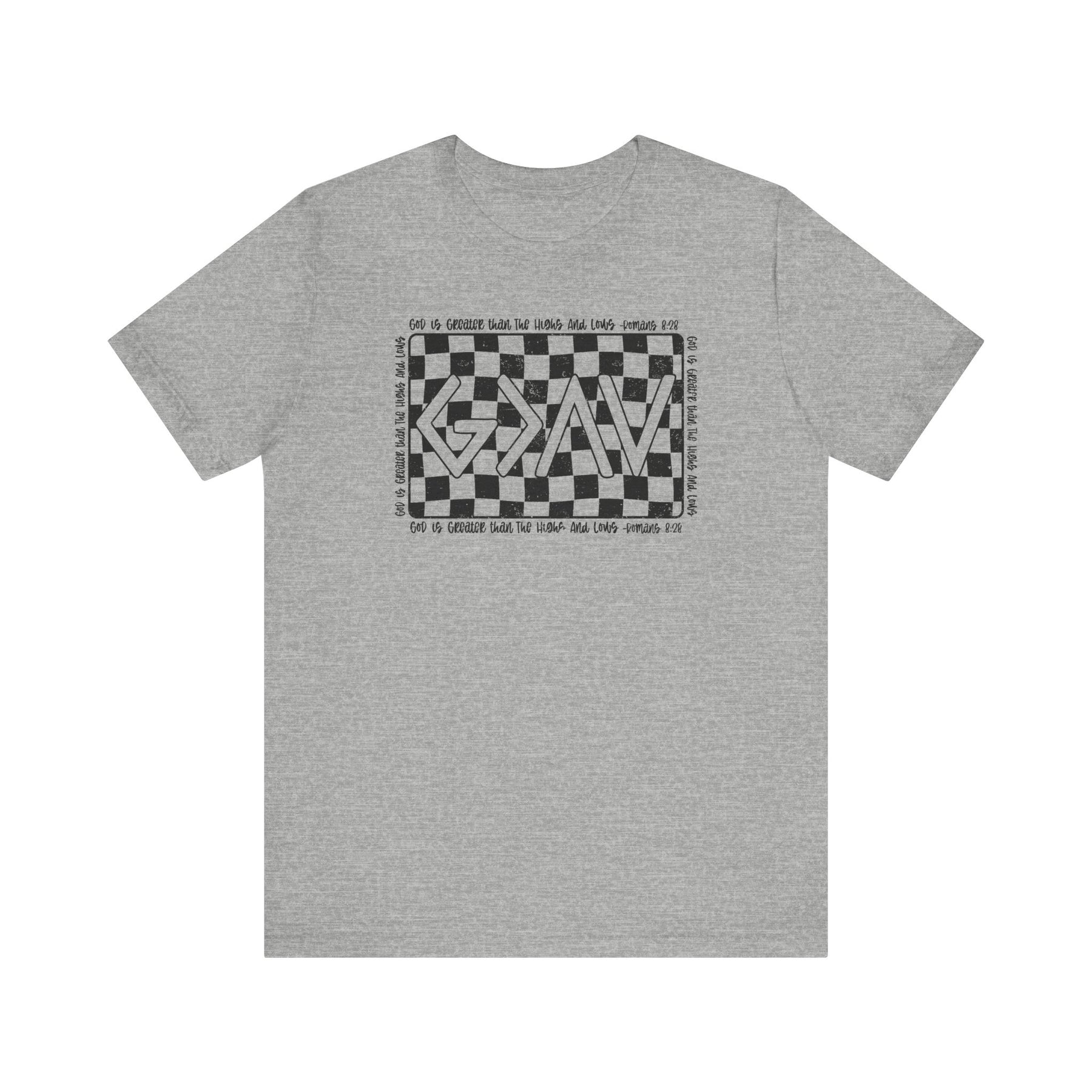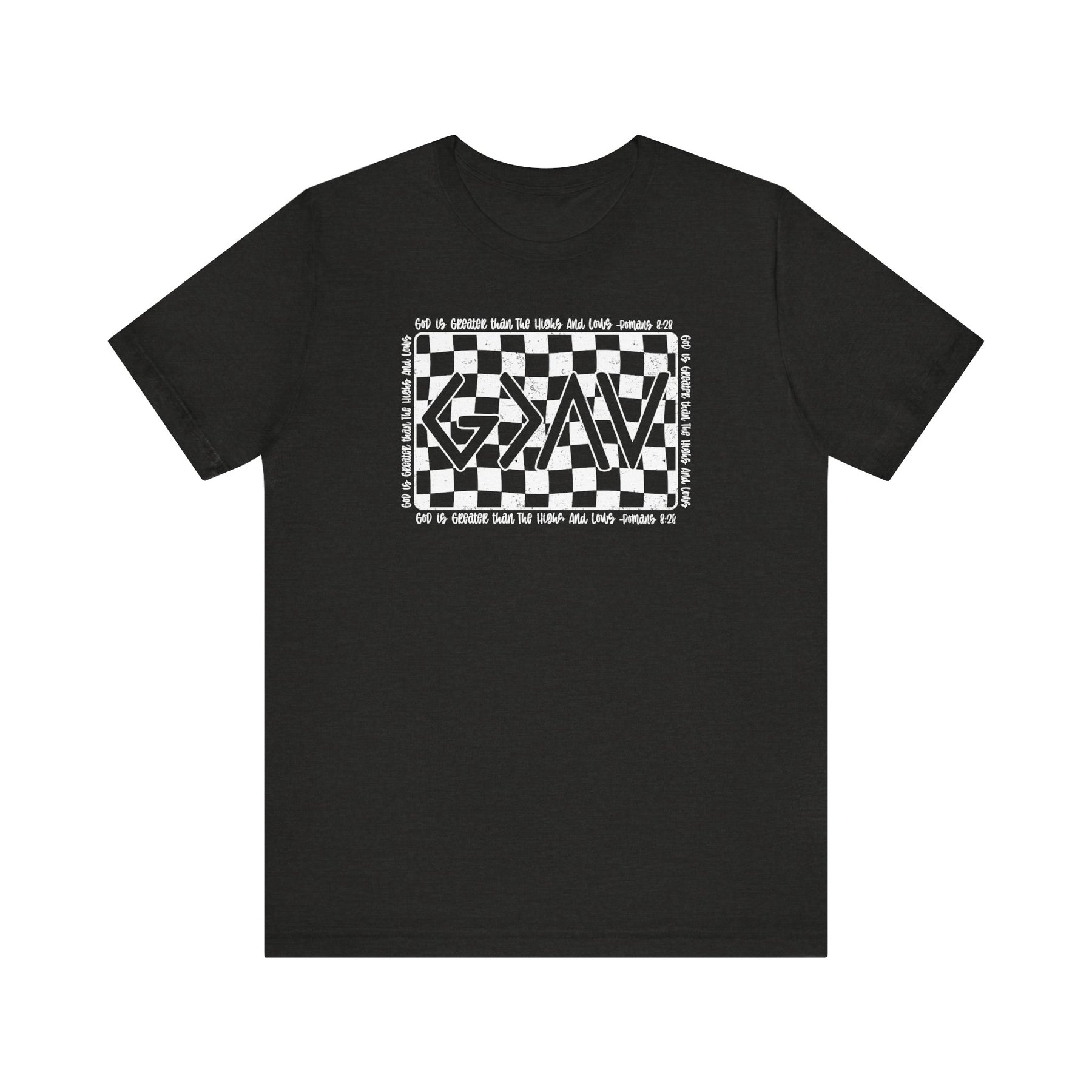 God Highs and Lows Tee: Classic unisex jersey with black and white checkered design, short sleeves, ribbed knit collars, and durable dual side seams.