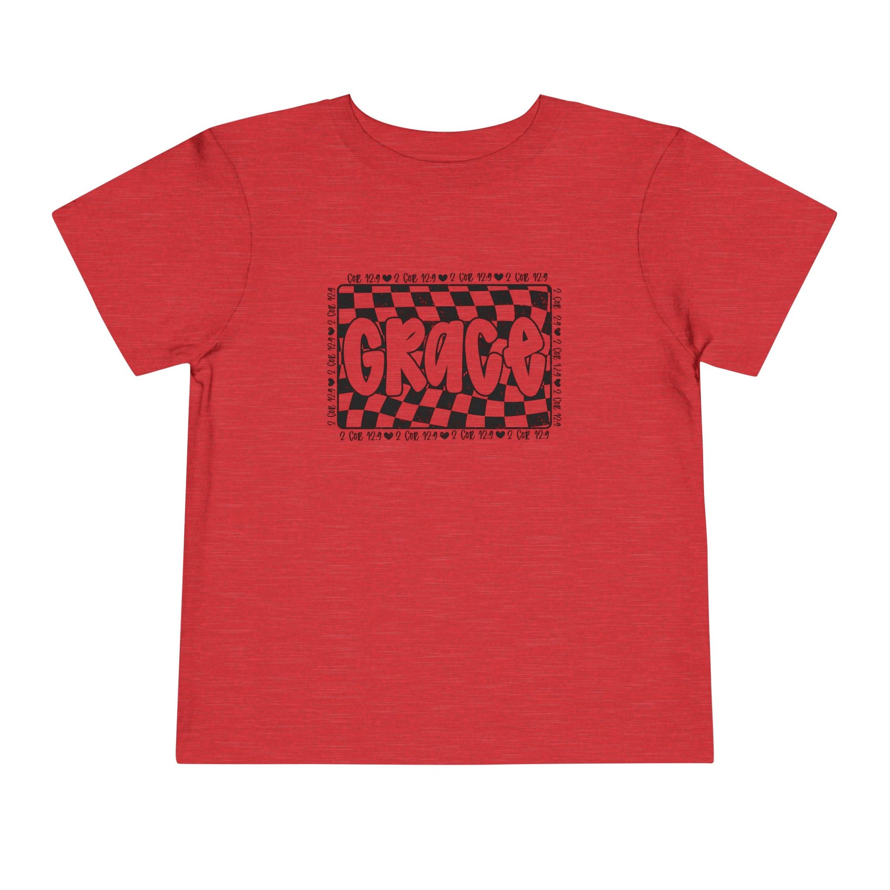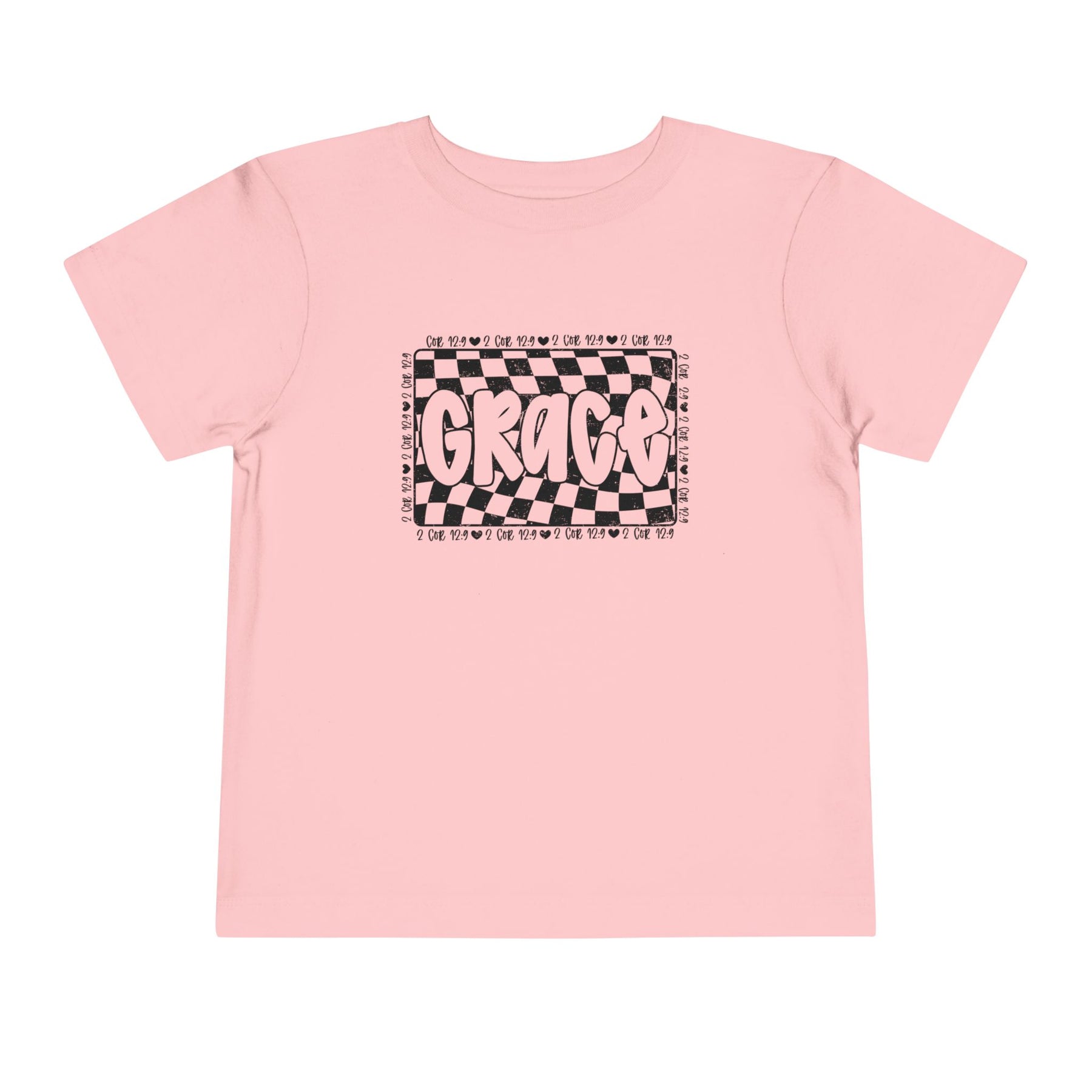 Grace Toddler Tee featuring a black and white checkered design with text, ideal for everyday comfort with its soft, breathable cotton fabric.