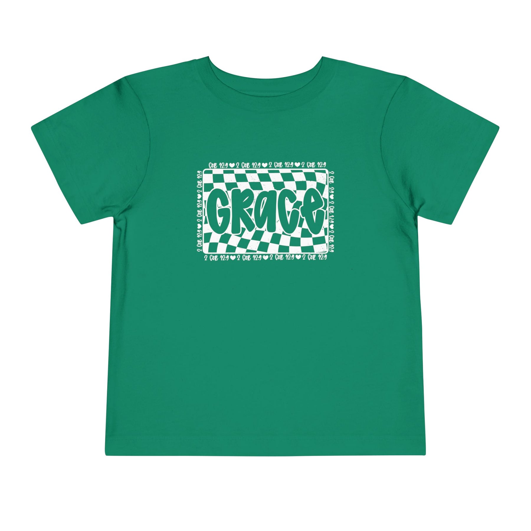 Grace Toddler Tee: A green shirt featuring white text, crafted from 100% Airlume combed cotton for toddlers, offering comfort with a tear-away label.
