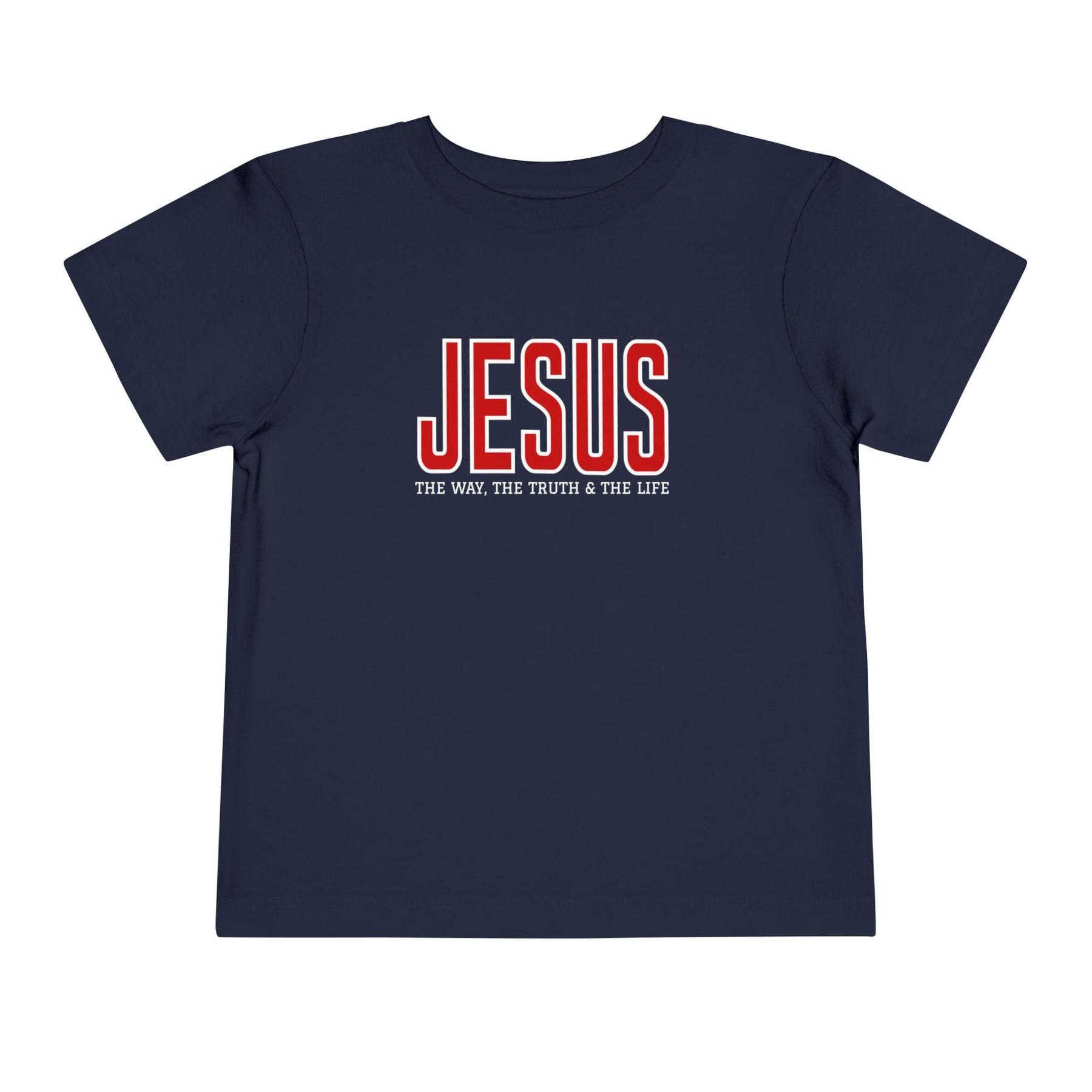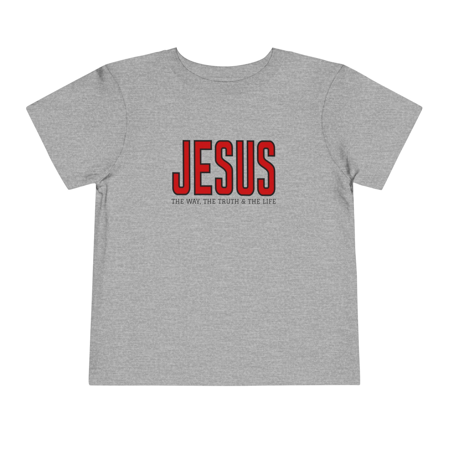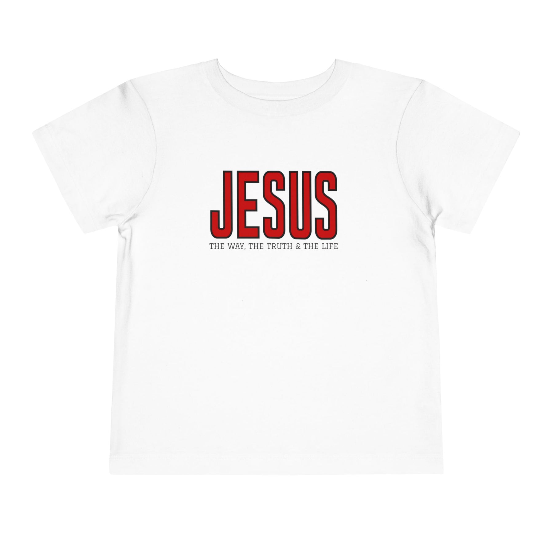 Toddler tee featuring JESUS in red and THE WAY, THE TRUTH & THE LIFE in black, crafted from soft cotton for everyday wear.