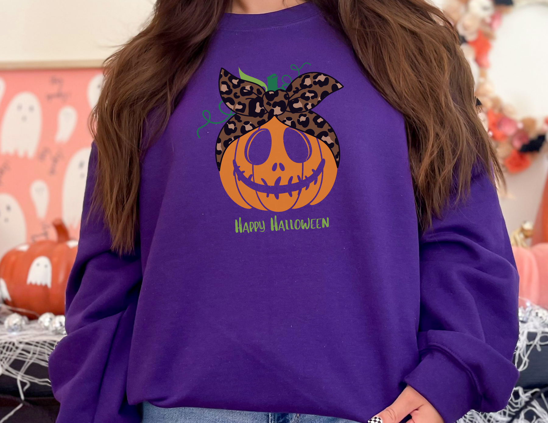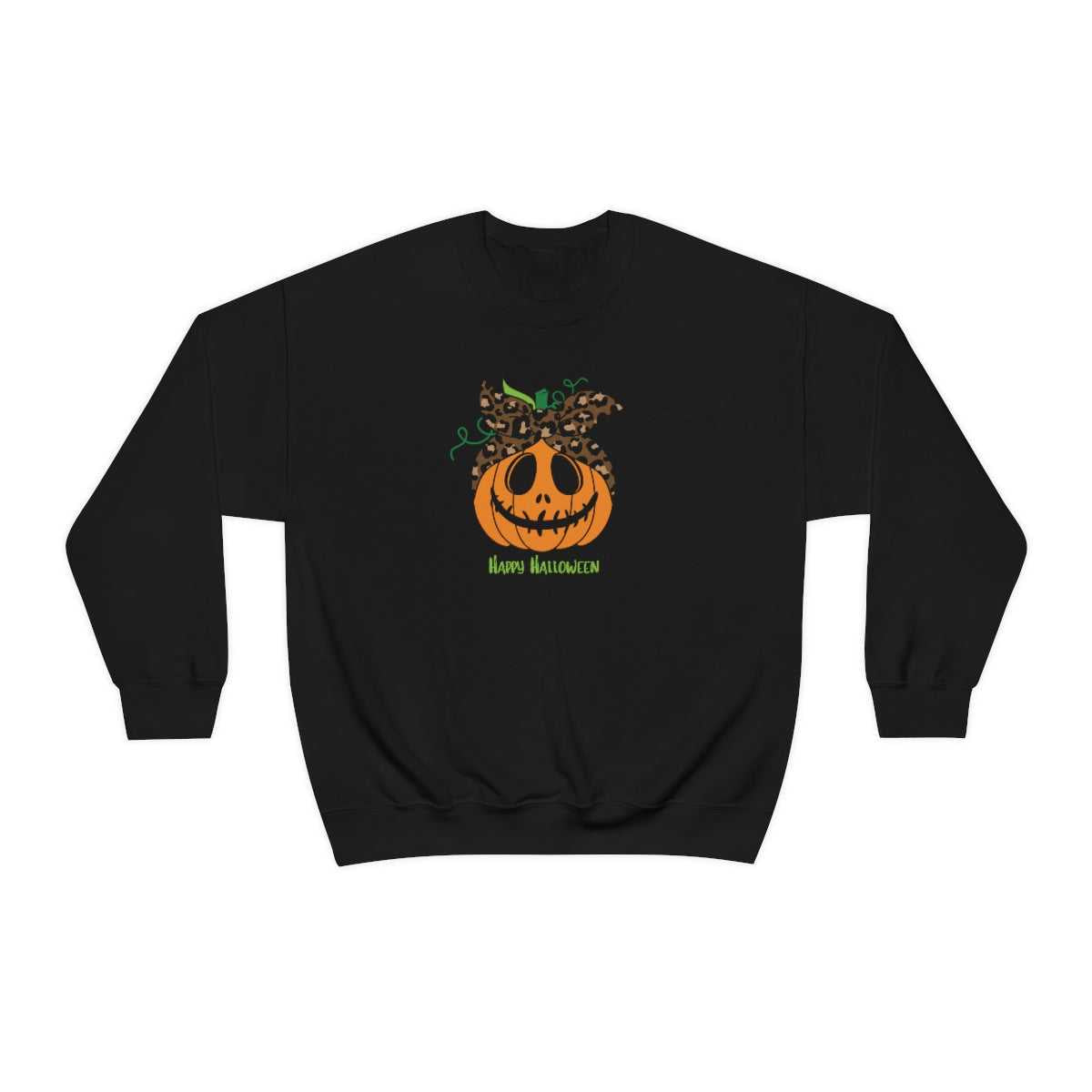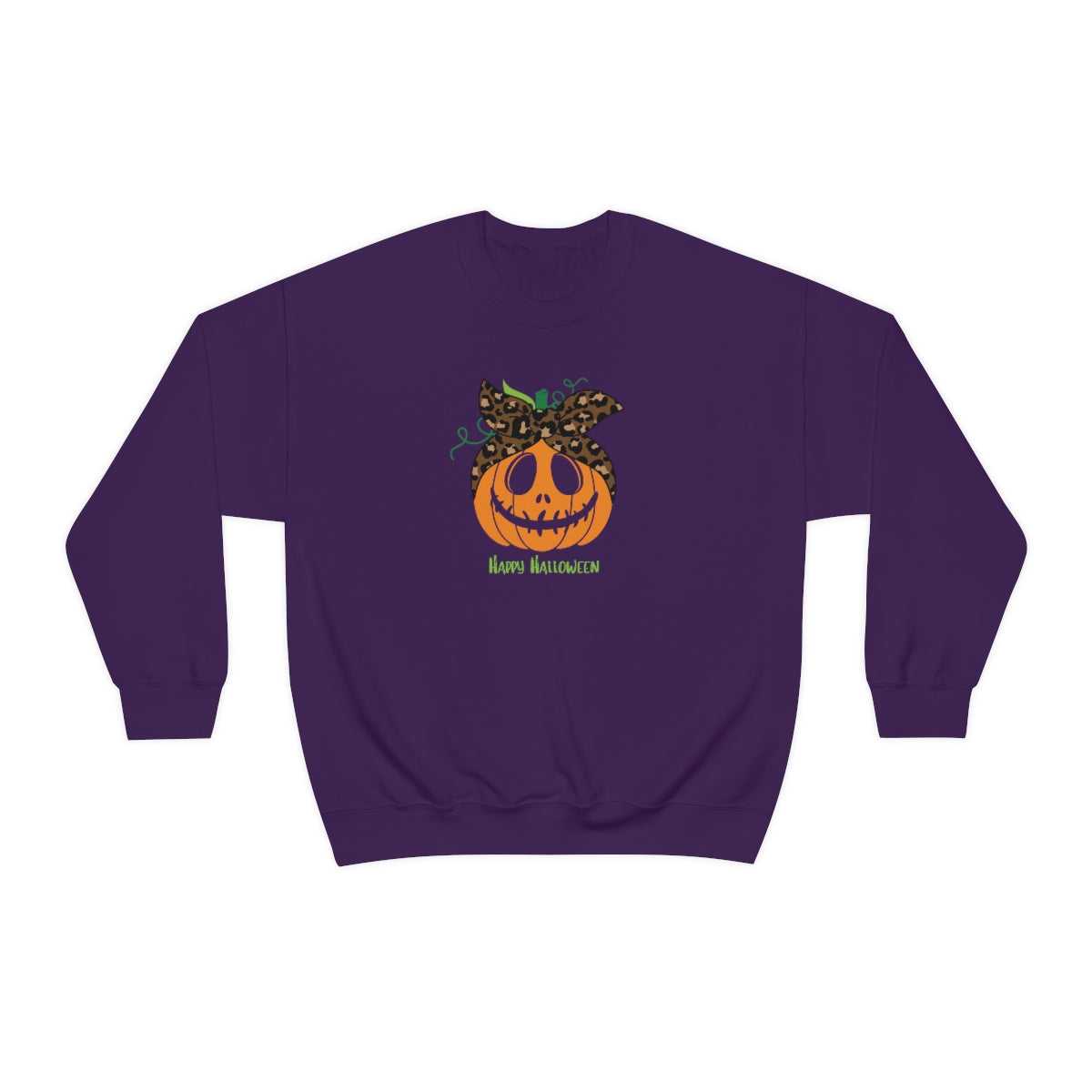 A unisex heavy blend crewneck sweatshirt featuring a pumpkin design. Made of 50% cotton and 50% polyester, with ribbed knit collar and no itchy side seams. Comfortable, loose fit, and true to size.