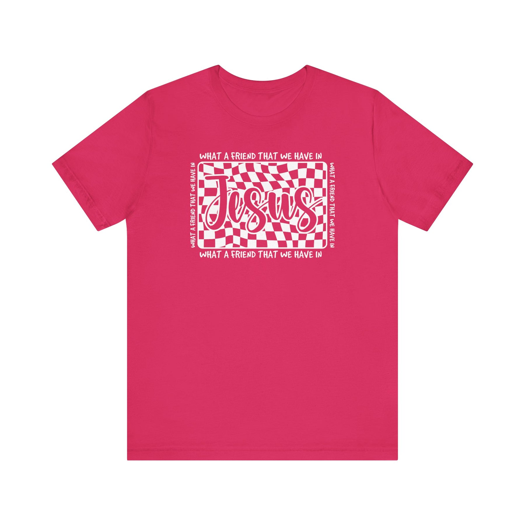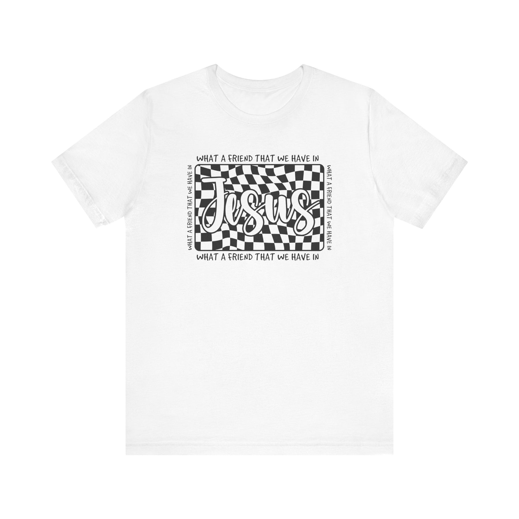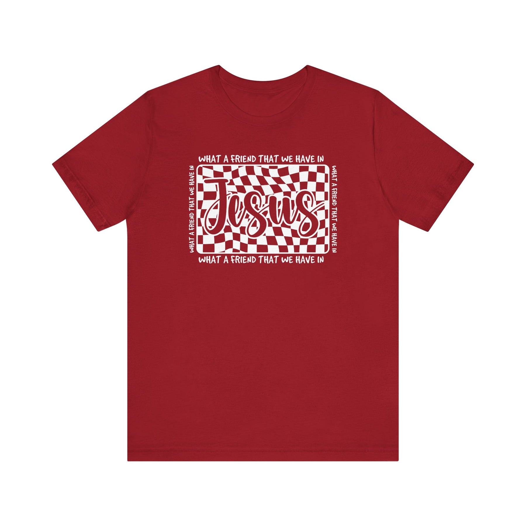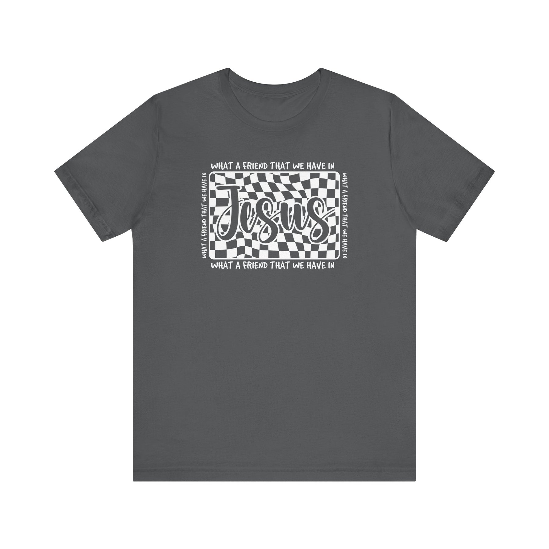 What A Friend We Have in Jesus Tee, a unisex jersey short sleeve shirt with ribbed knit collars and durable dual side seams, offering a soft and comfortable fit.