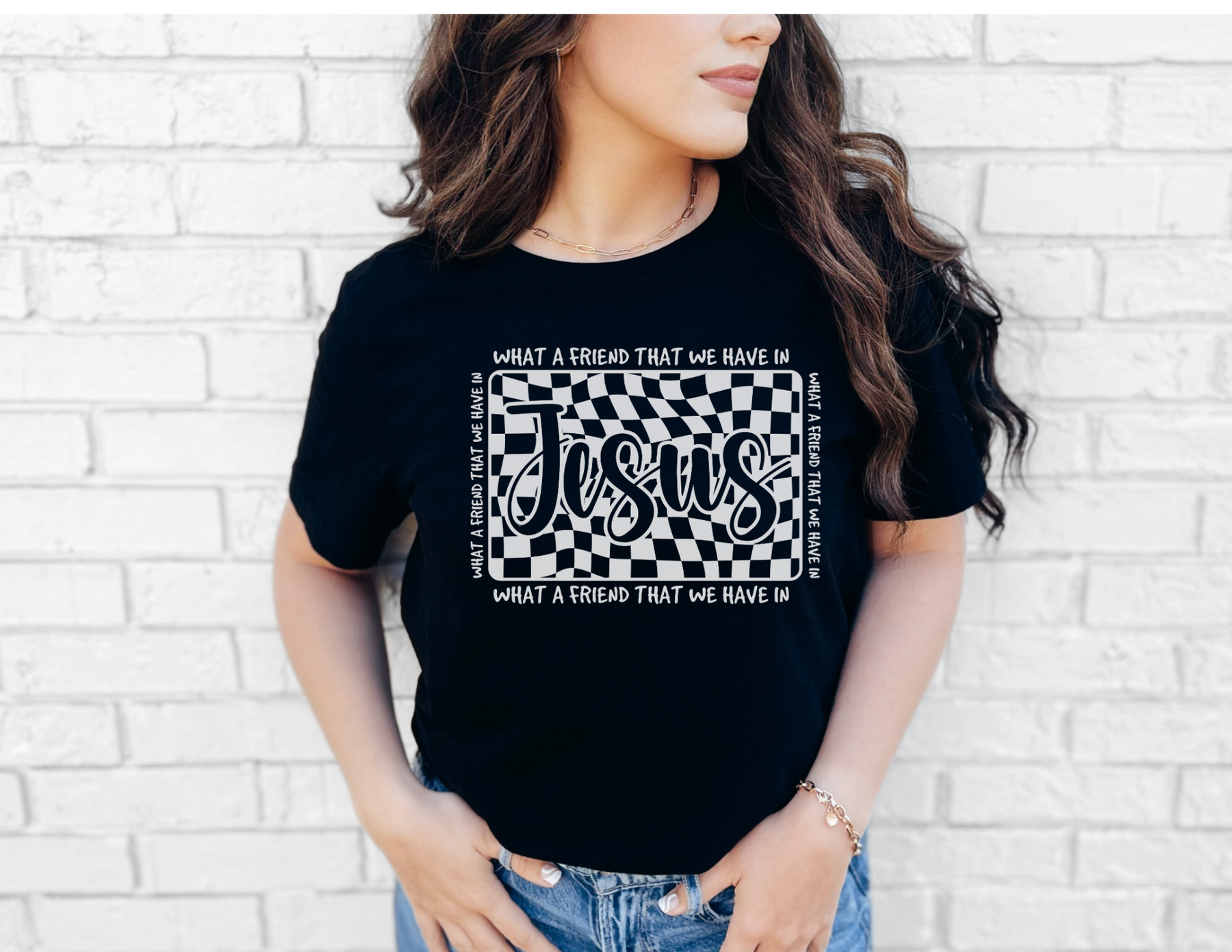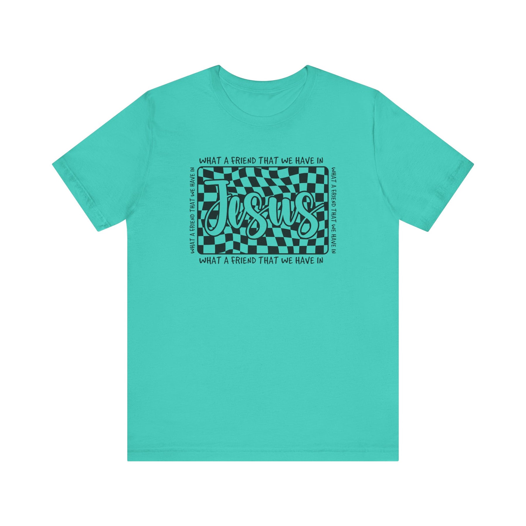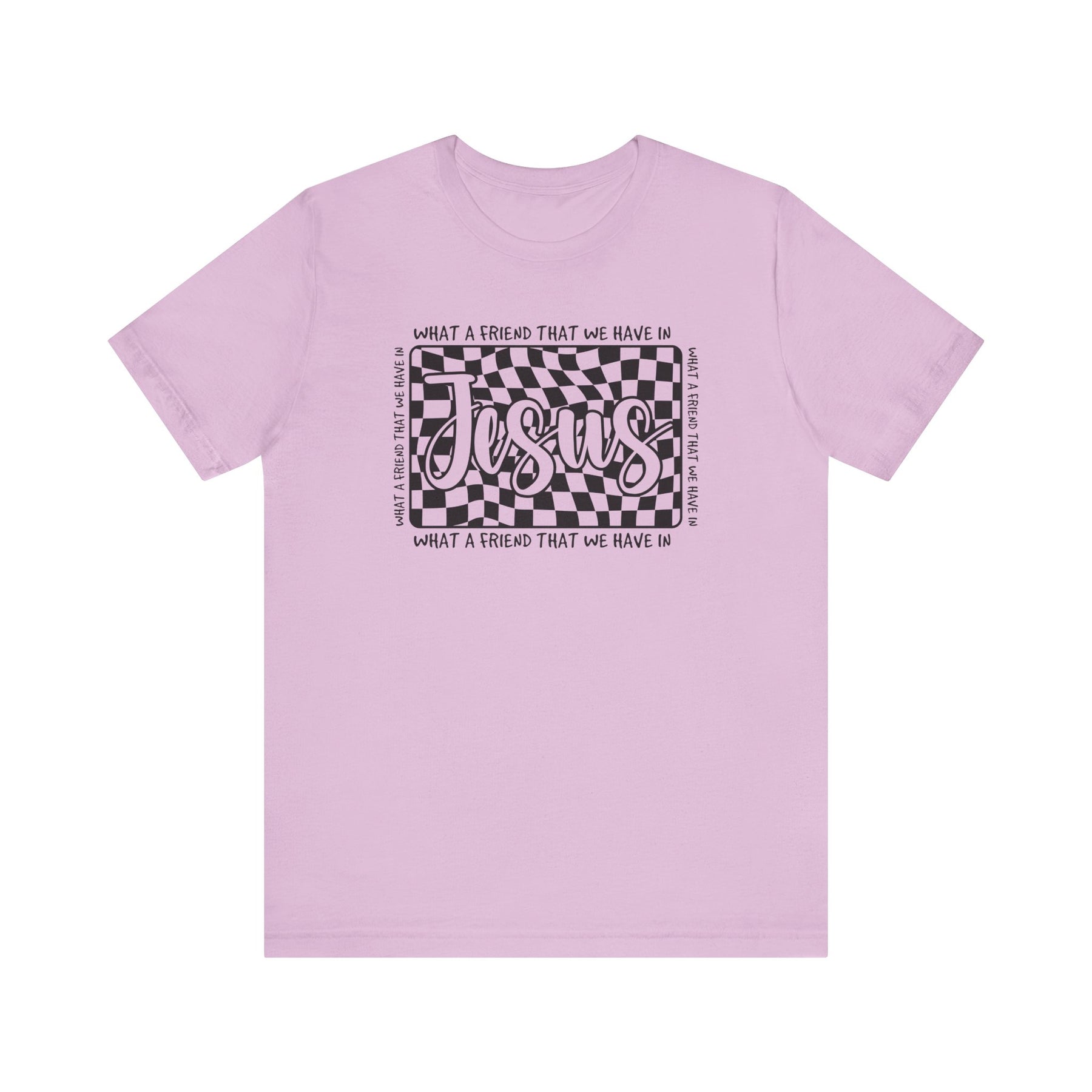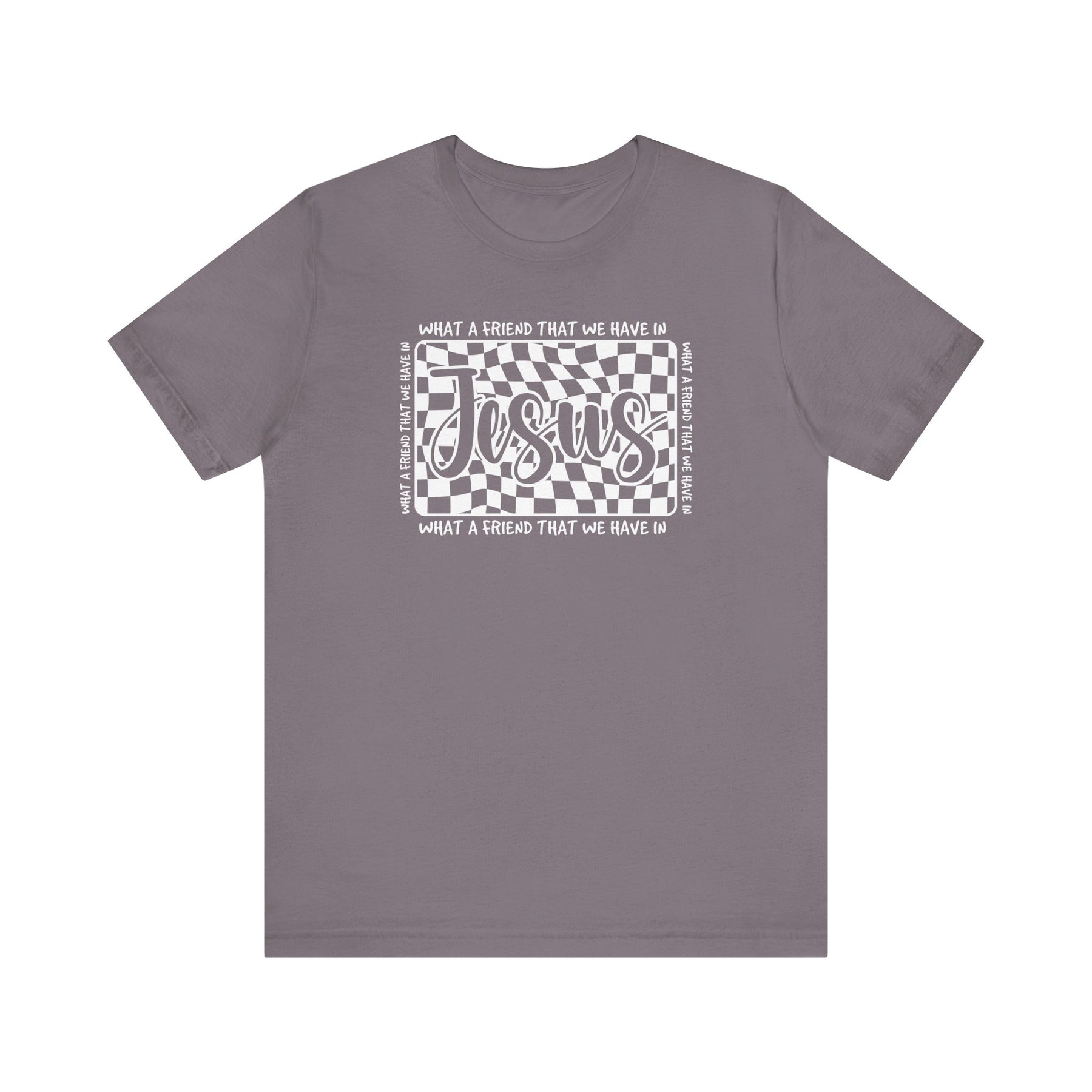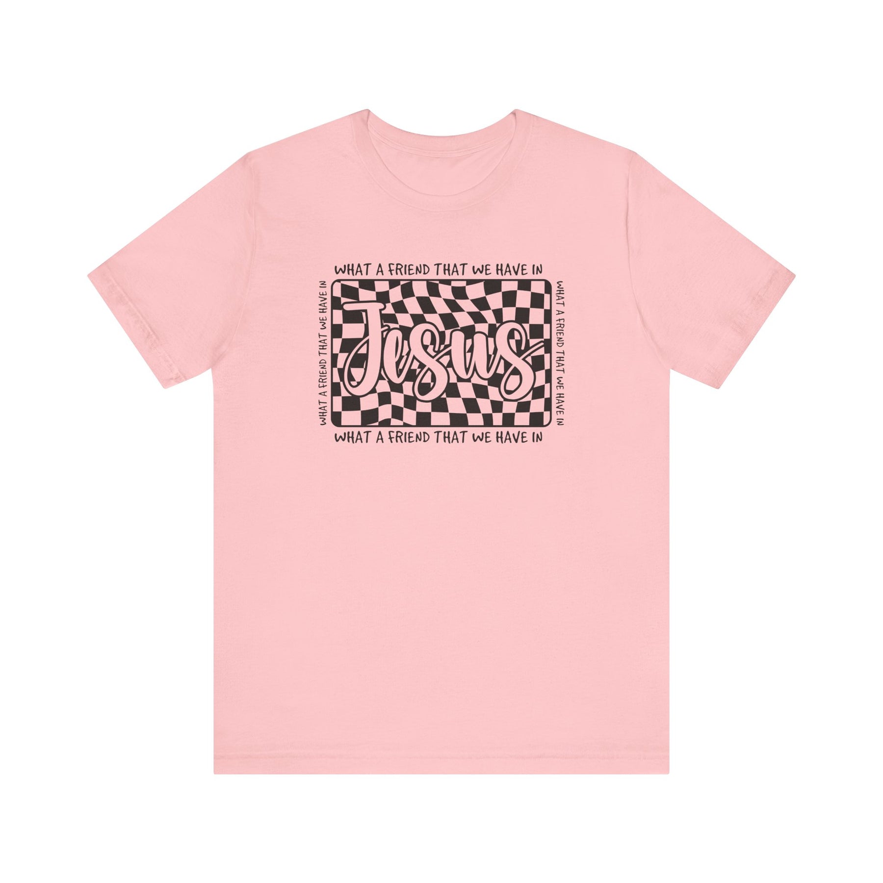 What A Friend We Have in Jesus Tee, a unisex jersey short sleeve shirt with ribbed knit collars and durable dual side seams, offering a soft and comfortable fit.