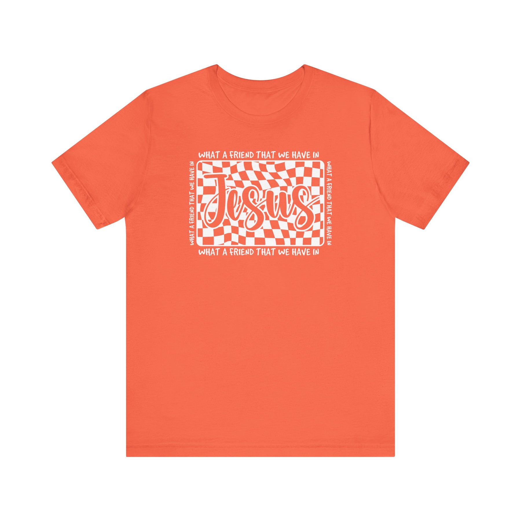 What A Friend We Have in Jesus Tee: Classic unisex short sleeve t-shirt with ribbed knit collars and dual side seams, made from soft, quality cotton for a comfortable fit.