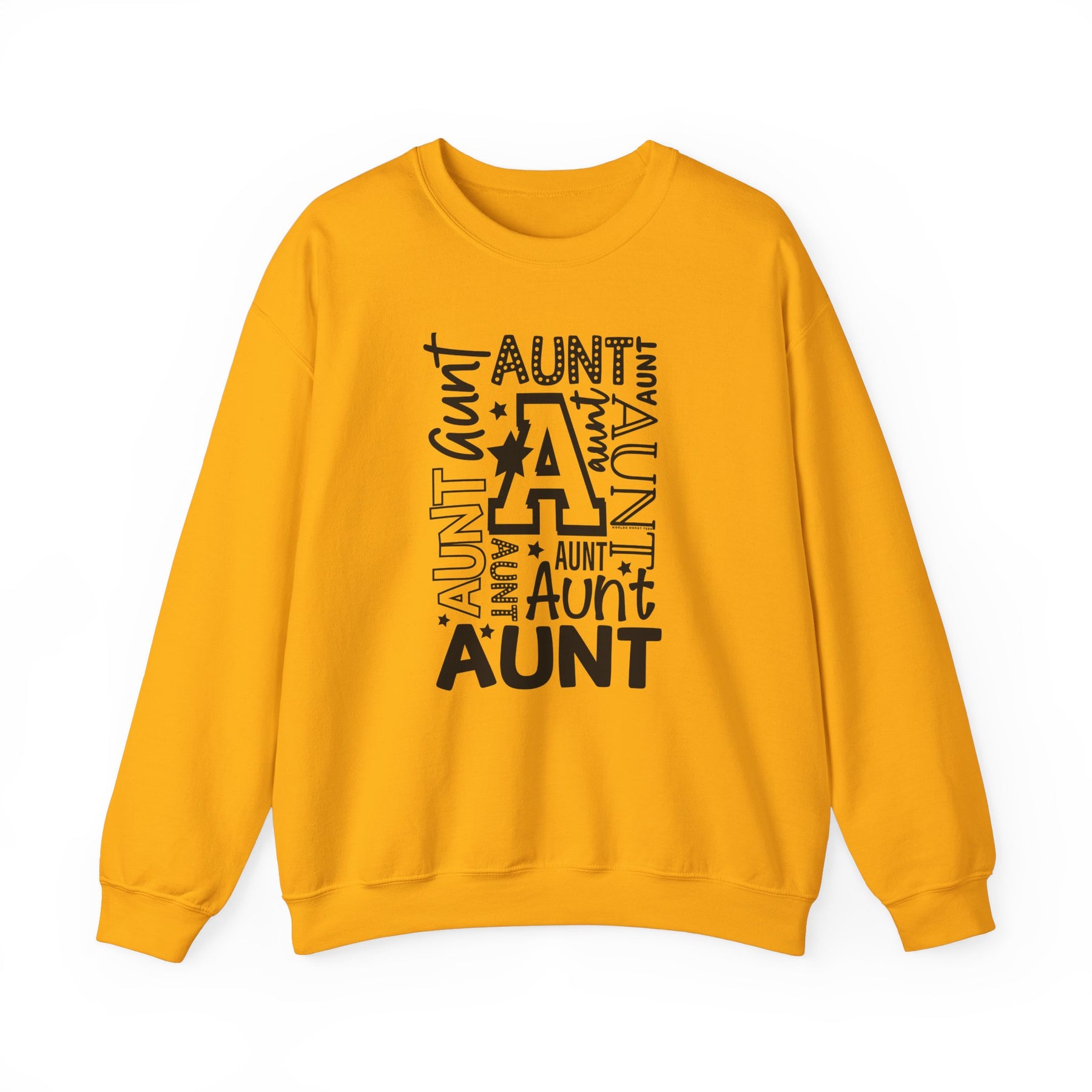 Aunt Crew relaxed fit sweatshirt in yellow with black text. Made of 50% cotton and 50% polyester blend, medium-heavy fabric. Comfortable and stylish for any occasion.