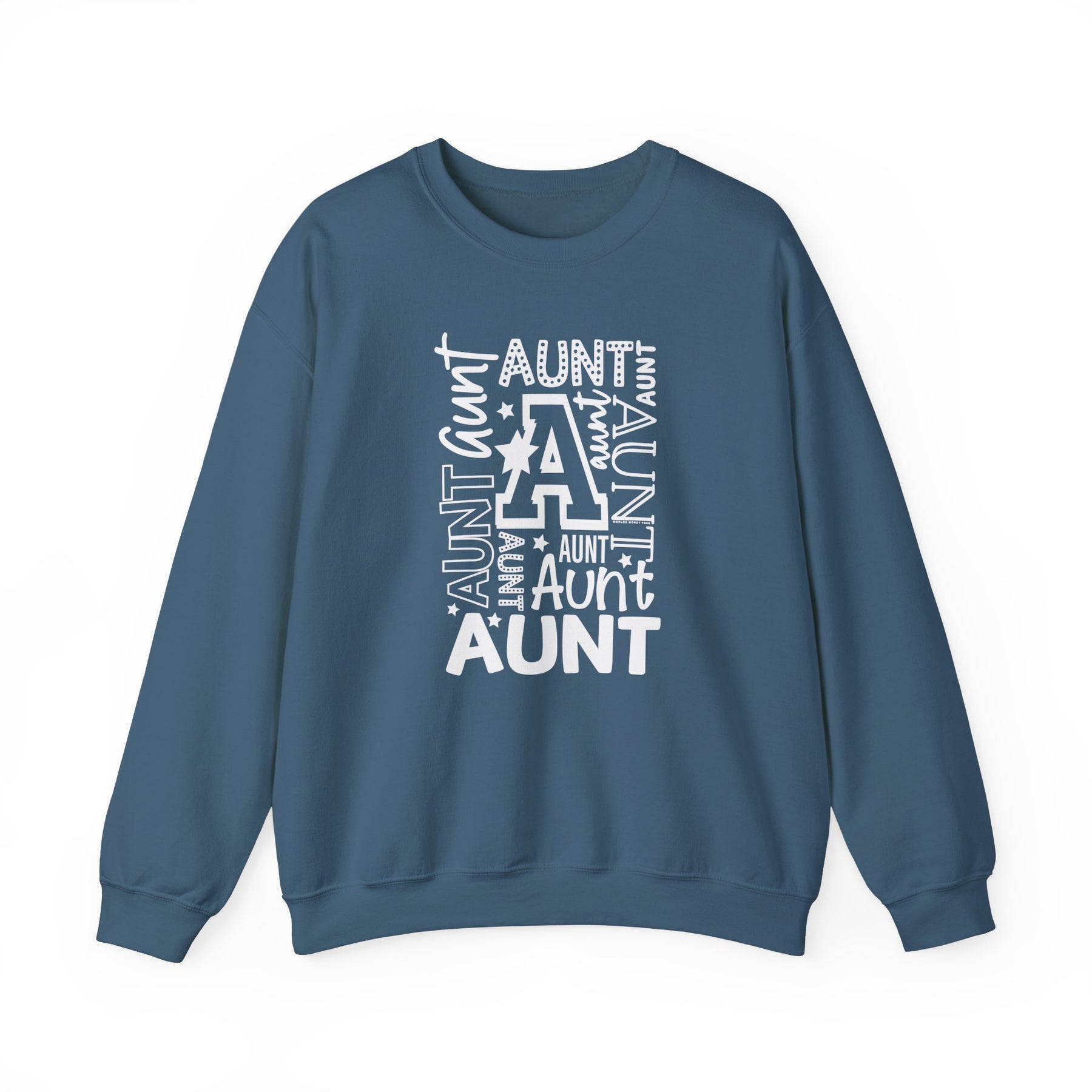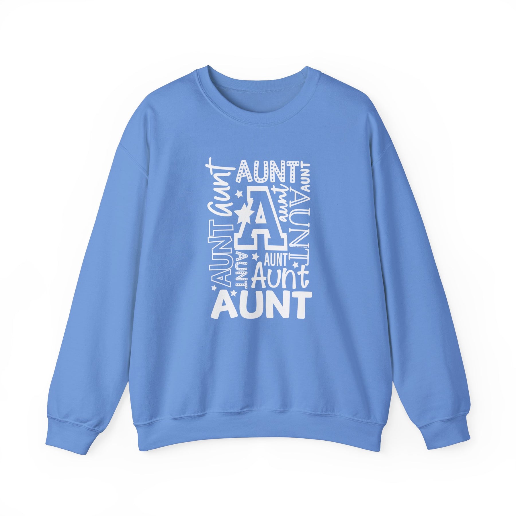 Relaxed fit Aunt Crew sweatshirt in blue with white text. 50% cotton, 50% polyester blend for comfort and style. Medium-heavy fabric, loose fit, true to size. Ideal for effortless cool.