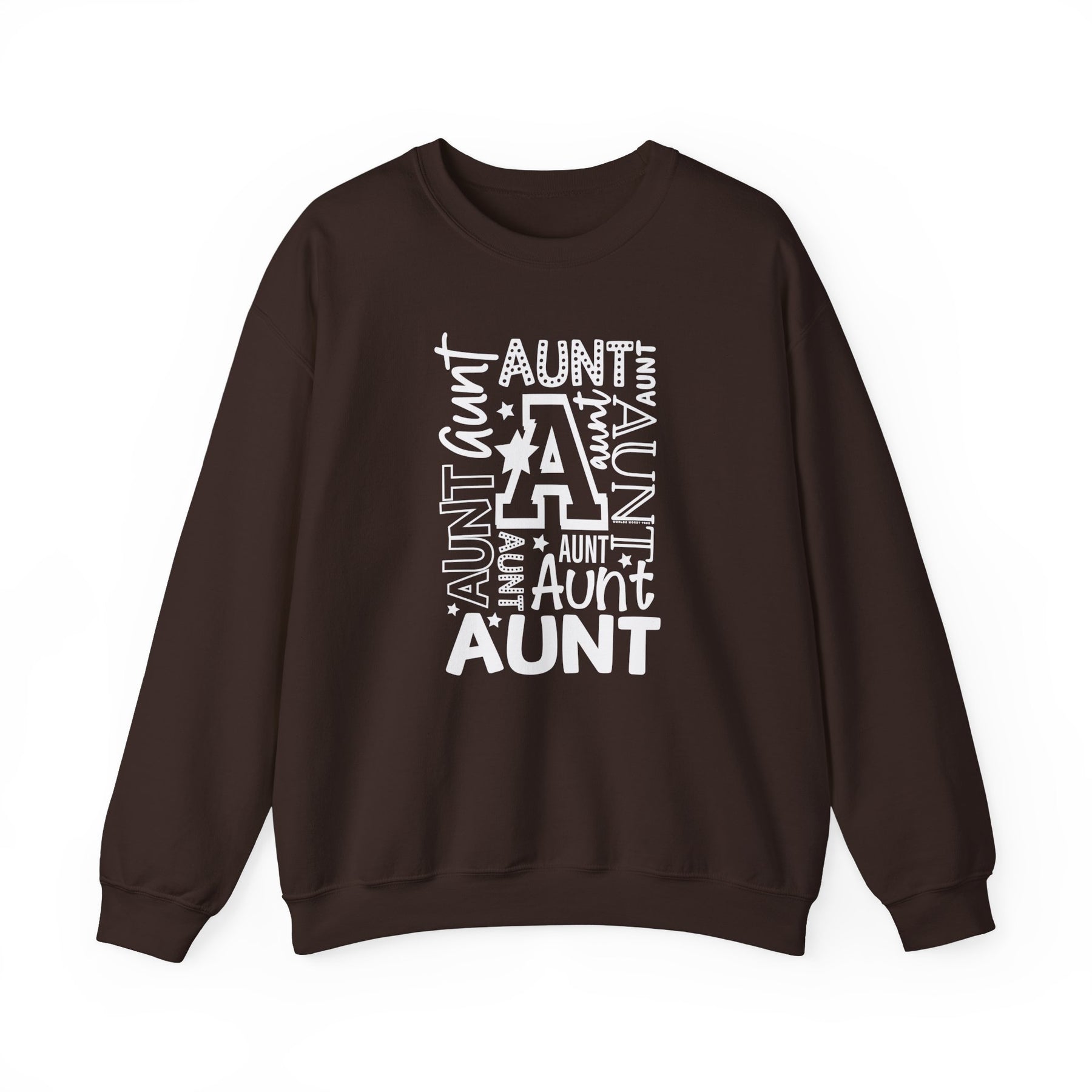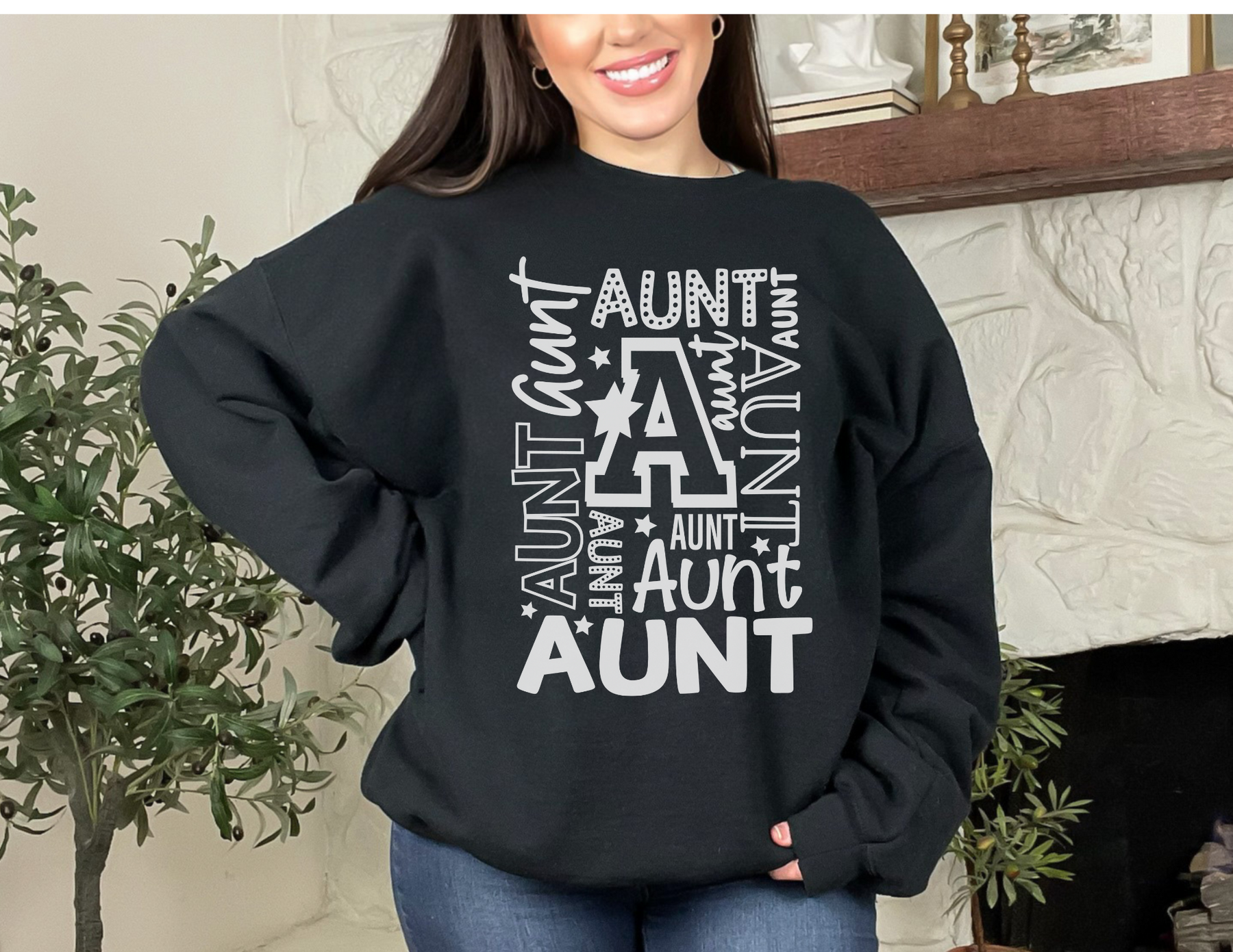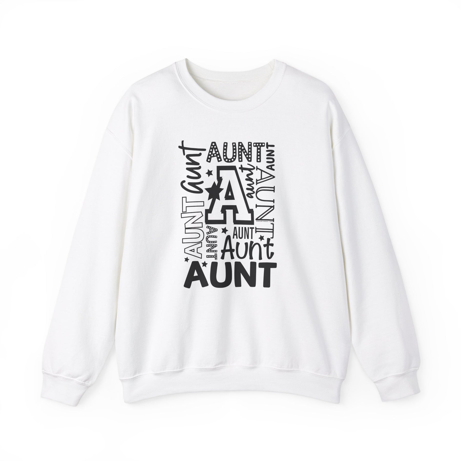 Relaxed fit Aunt Crew sweatshirt in black with white text. Soft 50% cotton, 50% polyester blend, crew neck, medium-heavy fabric, loose fit. Elevate your style effortlessly.