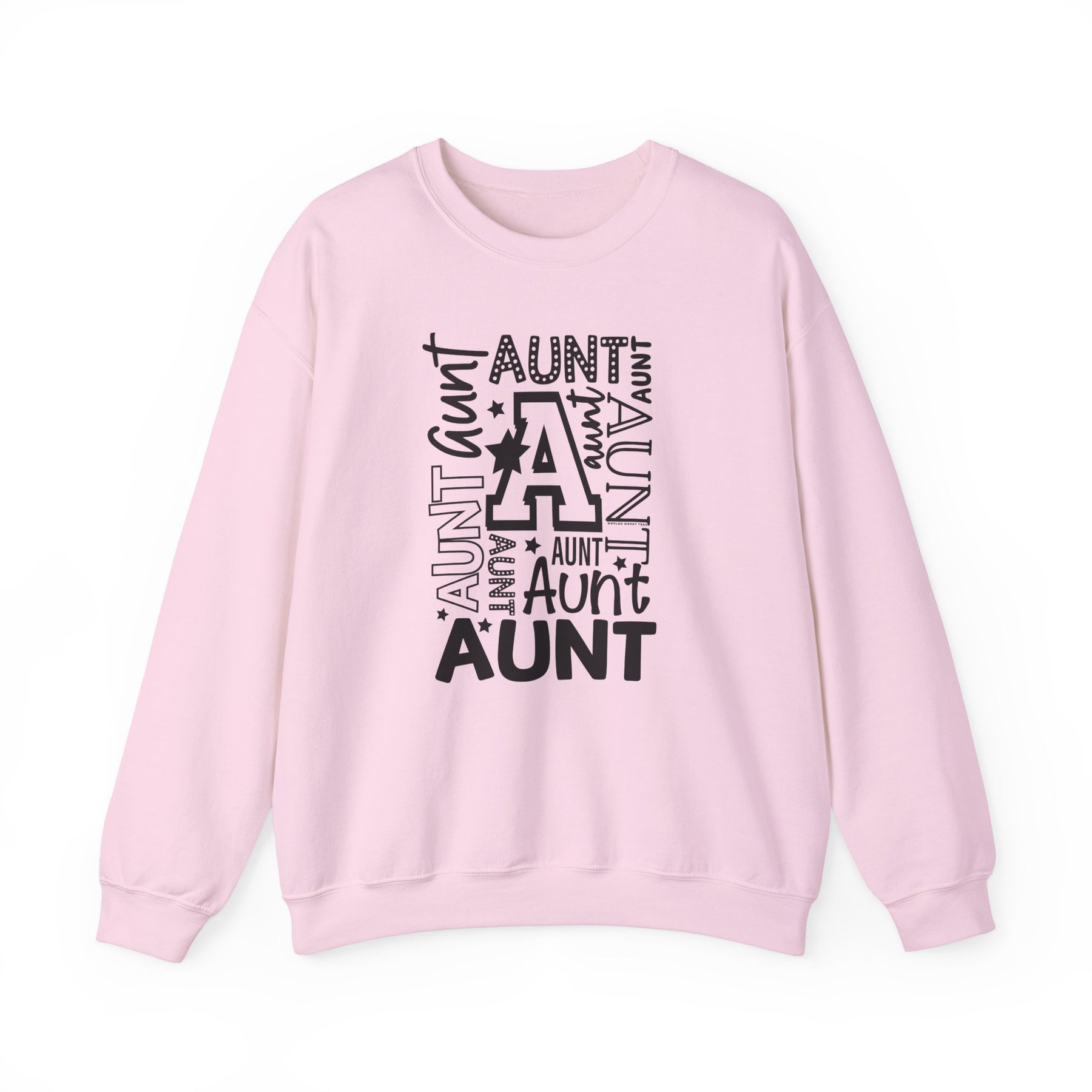 Relaxed fit Aunt Crew sweatshirt in pink with black text. 50% cotton, 50% polyester blend for comfort. Medium-heavy fabric, loose fit, true to size. Ideal for casual style.