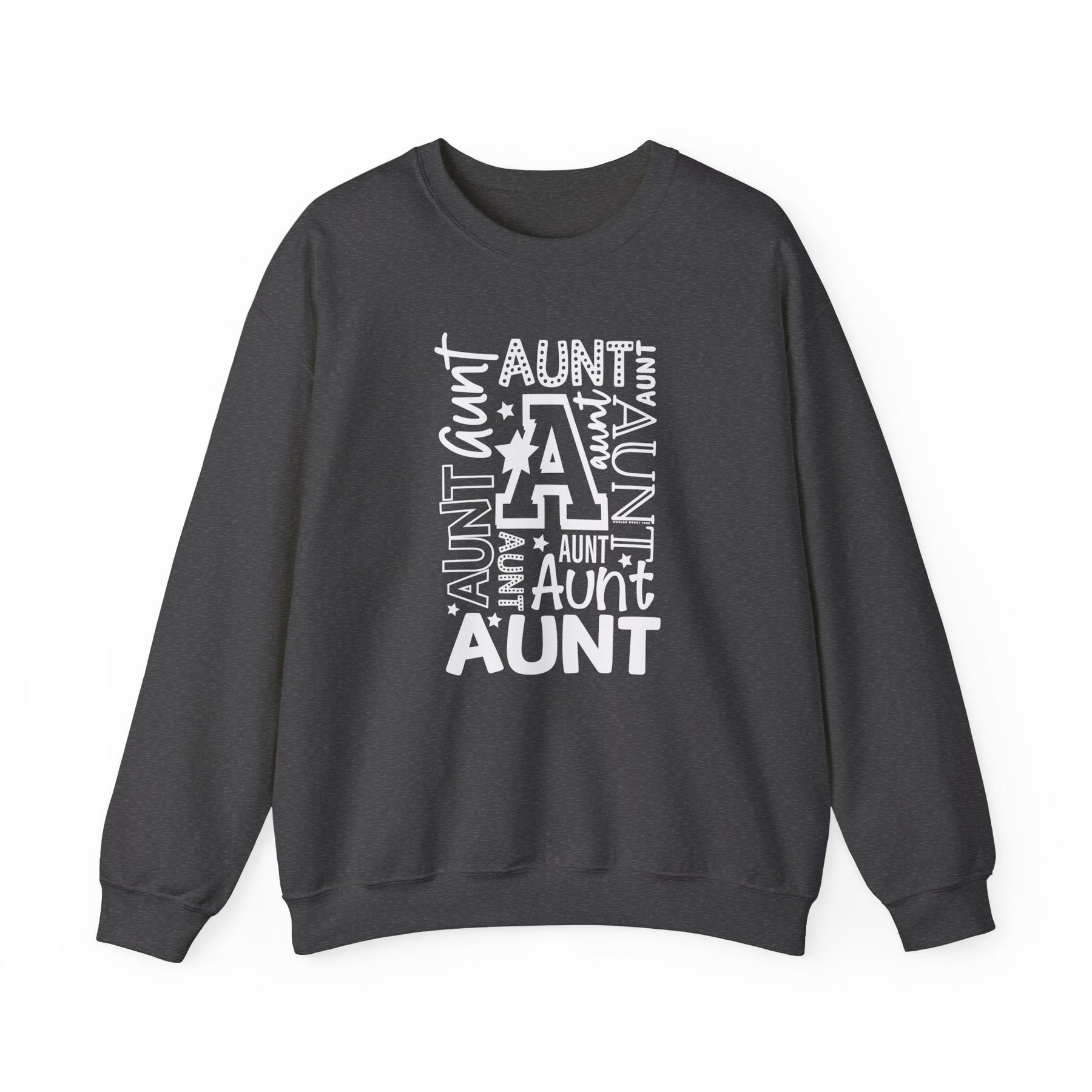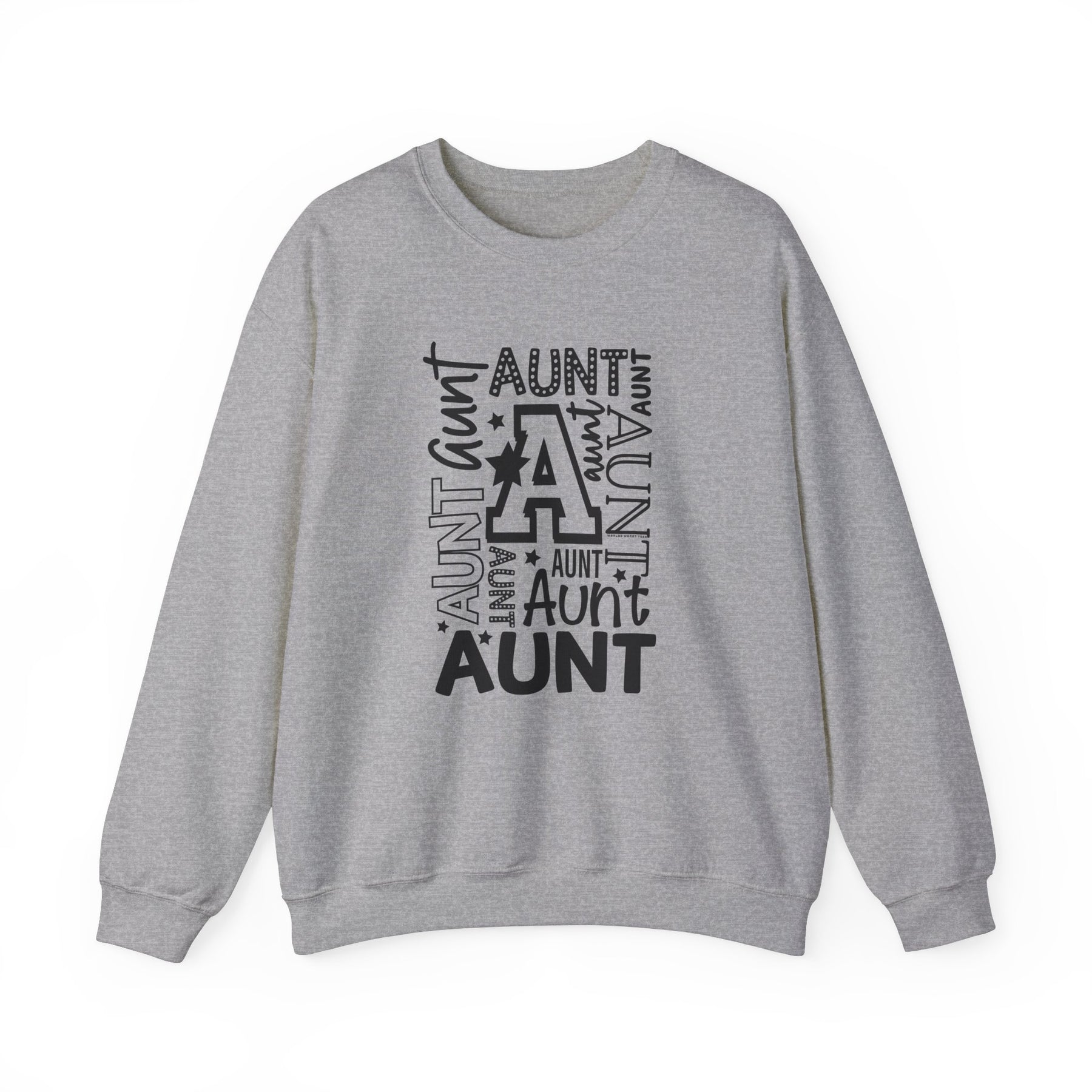 Relaxed fit Aunt Crew sweatshirt in grey with black text. Soft 50% cotton, 50% polyester blend, crew neck, medium-heavy fabric, loose fit. Elevate your style with comfort and cool.