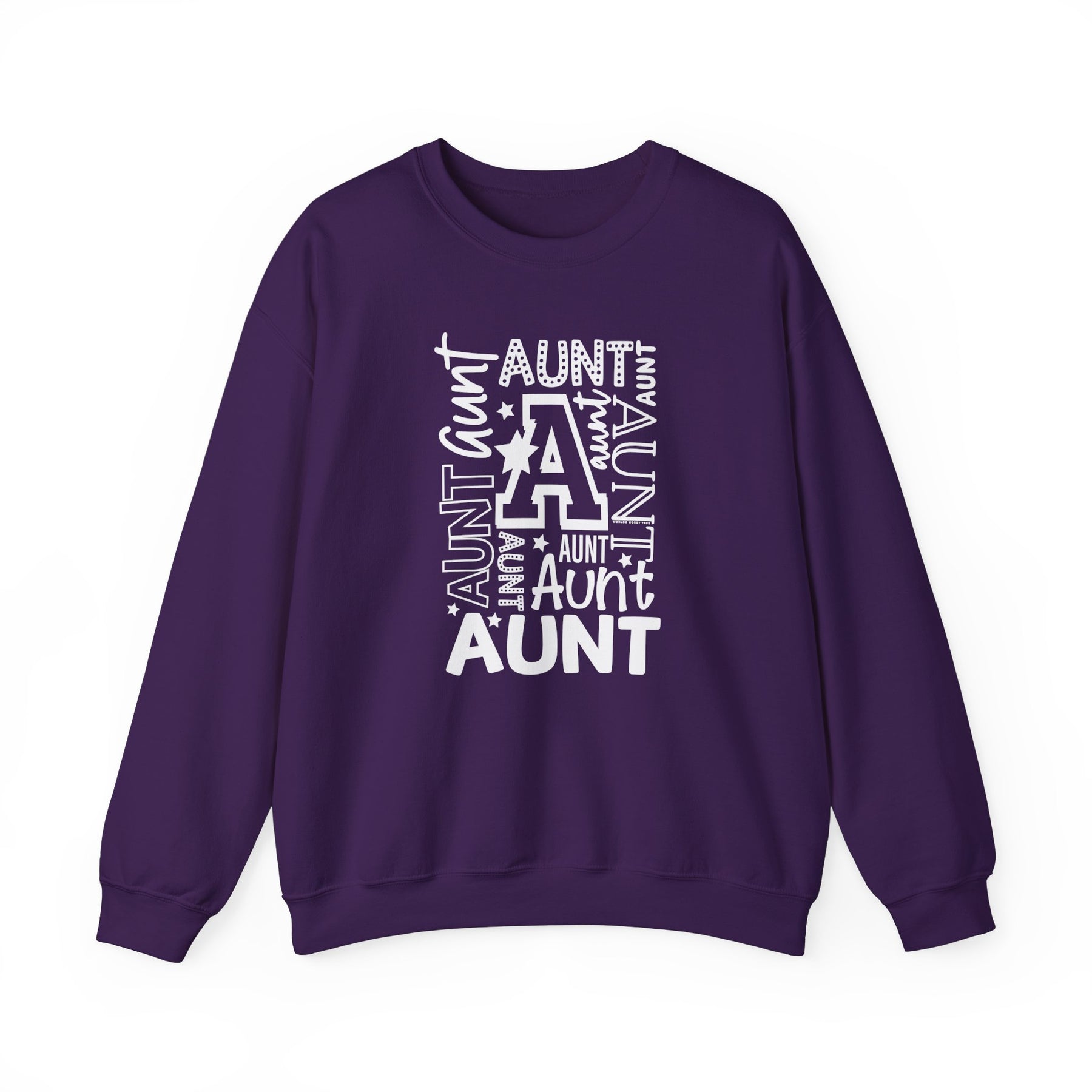 Aunt Crew signature sweatshirt in purple with white text. Relaxed fit, 50% cotton, 50% polyester blend, crew neck, medium-heavy fabric. Elevate your style with comfort and cool.