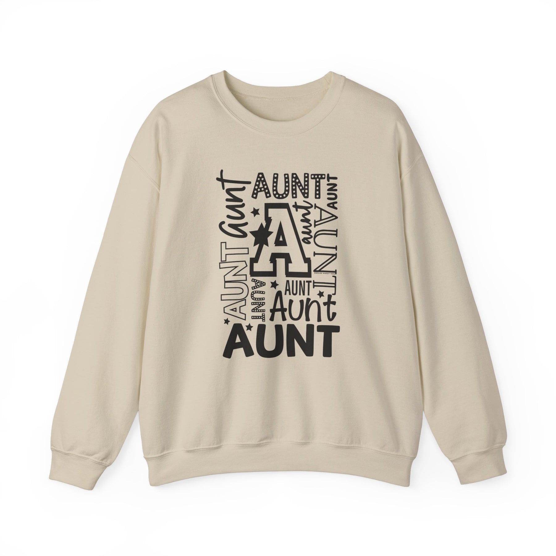 Aunt Crew relaxed fit sweatshirt in tan with black text. Soft 50% cotton, 50% polyester blend, crew neck, medium-heavy fabric, loose fit. Elevate your style effortlessly.