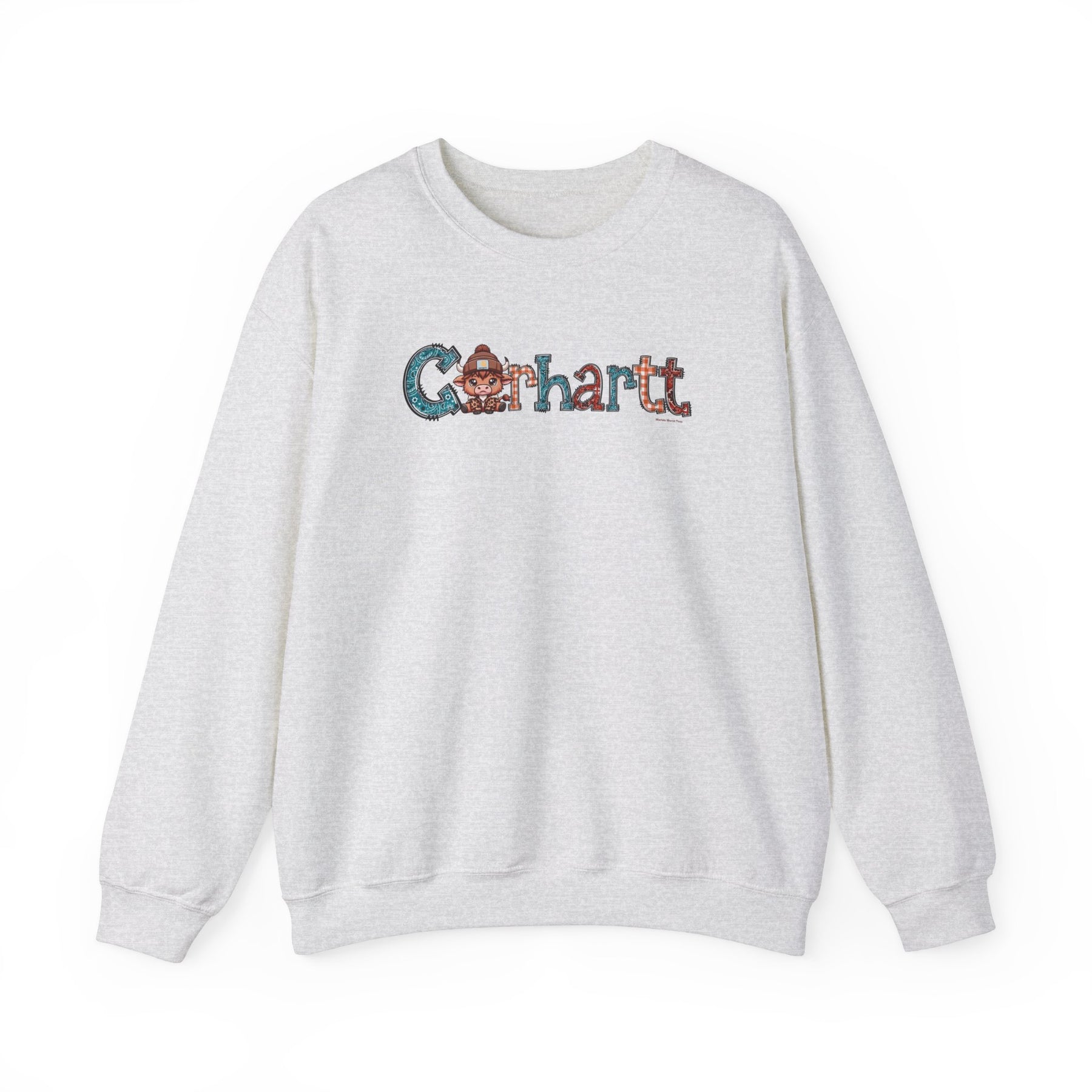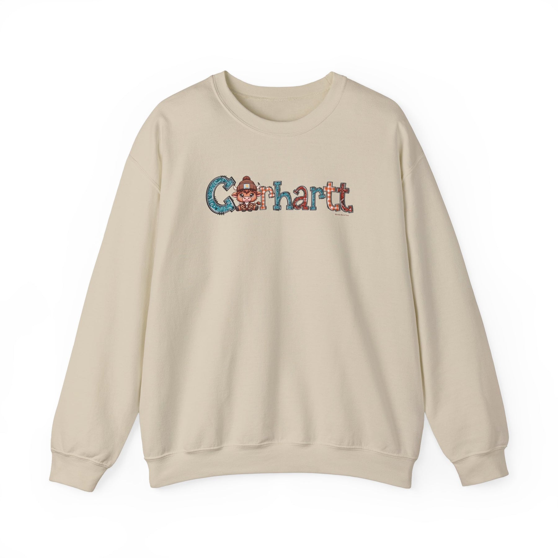 A comfortable unisex Cowhartt Crew sweatshirt with a cartoon cow logo. Made of 50% cotton and 50% polyester, ribbed knit collar, and no itchy side seams. Medium-heavy fabric, loose fit, true to size.