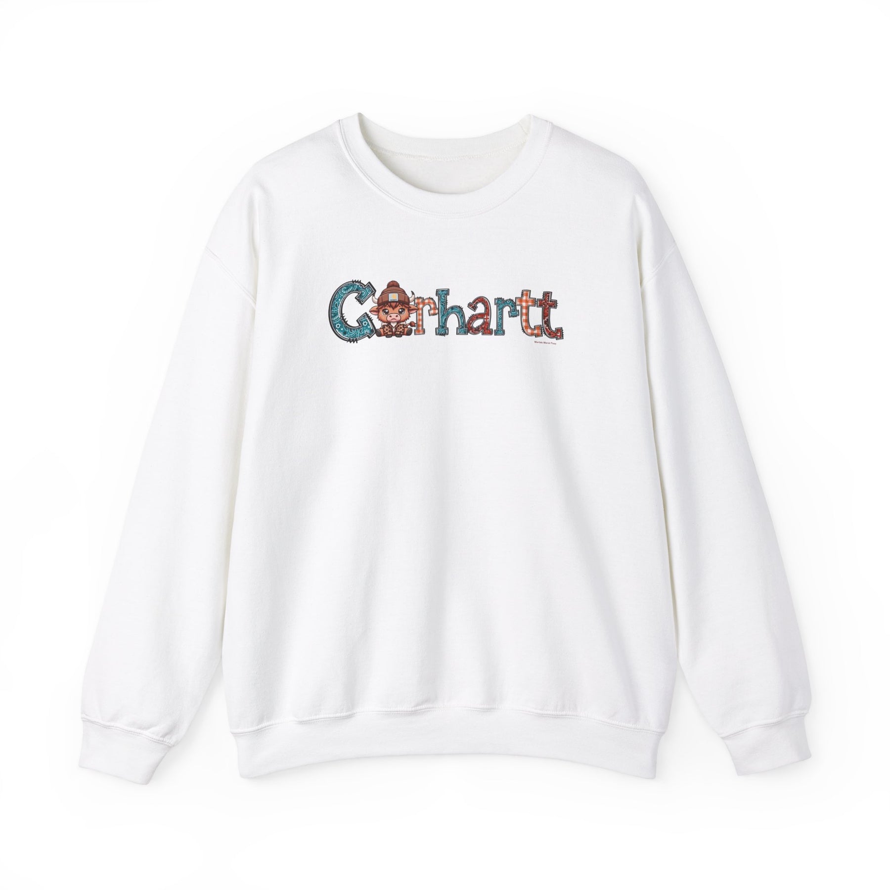 A white Cowhartt Crew unisex heavy blend crewneck sweatshirt featuring a cartoon cow with horns and a hat. Made of 50% cotton, 50% polyester, ribbed knit collar, and no itchy side seams.