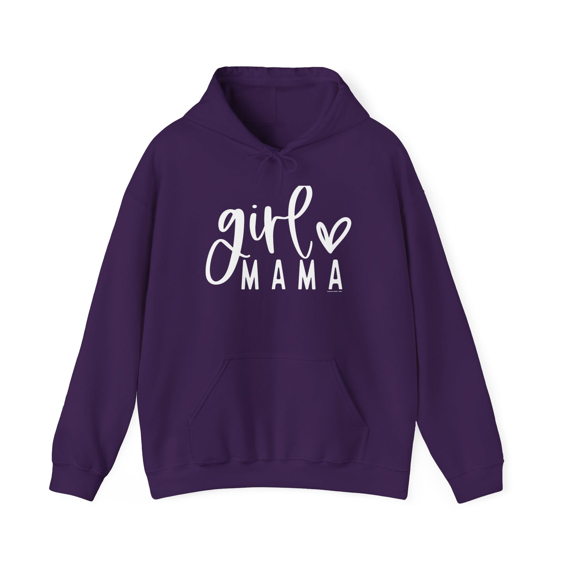 Unisex Girl Mama Hoodie: A cozy purple sweatshirt with white text, featuring a kangaroo pocket and matching drawstring hood. Made of 50% cotton and 50% polyester for warmth and comfort. Classic fit, medium-heavy fabric.