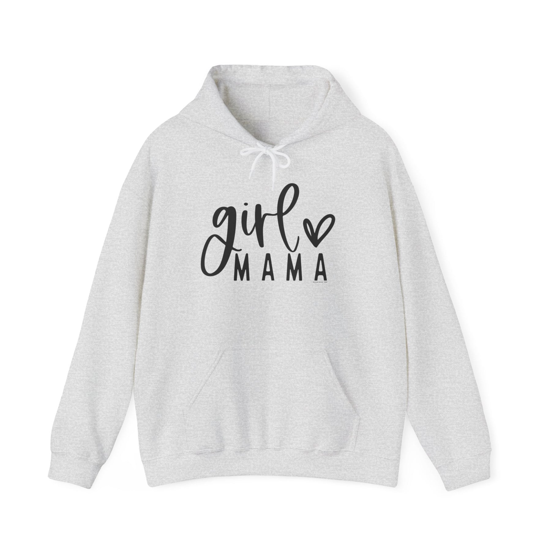A cozy Girl Mama Hoodie in grey, featuring black text, a kangaroo pocket, and a matching drawstring. Unisex, cotton-polyester blend, medium-heavy fabric for warmth and comfort. Perfect for chilly days.