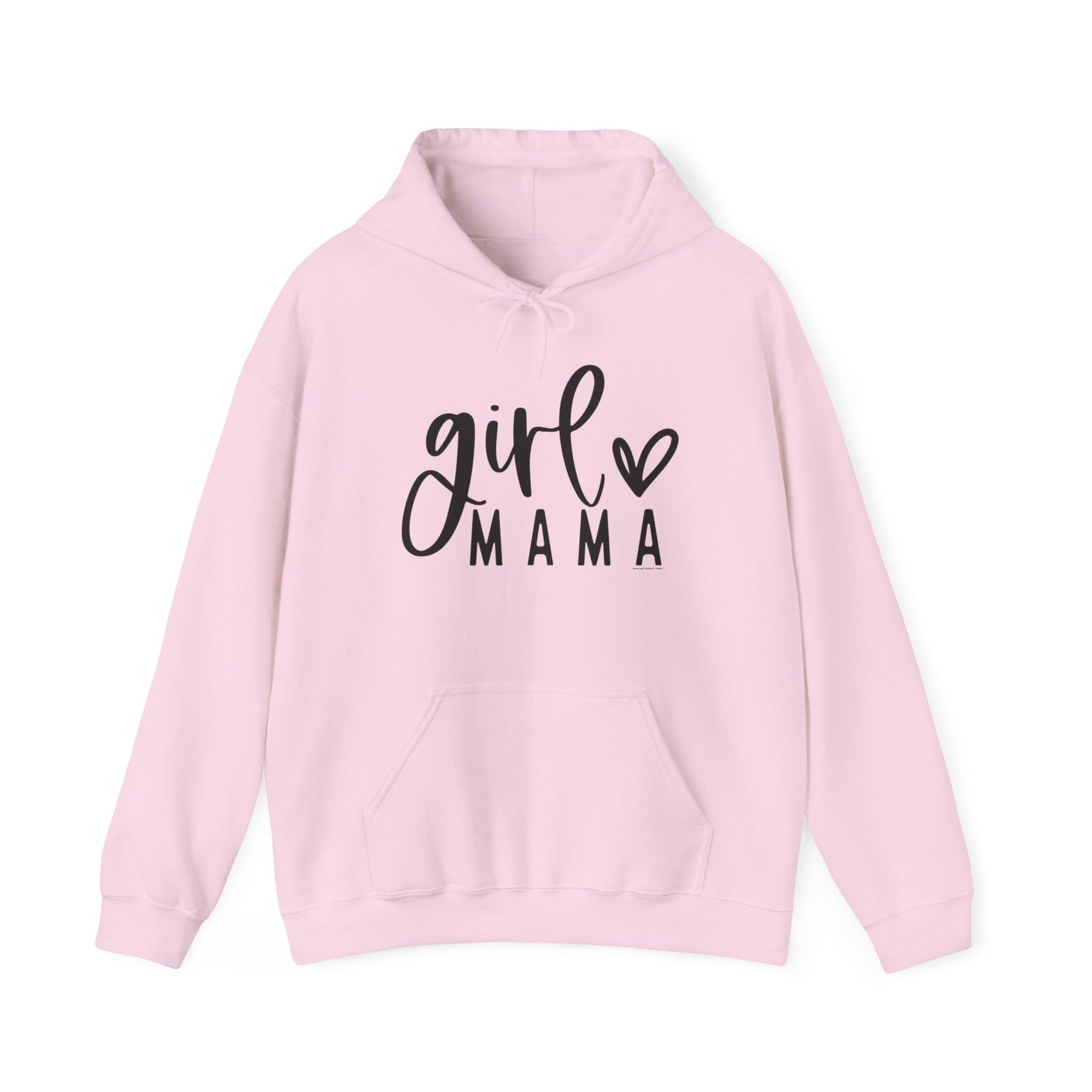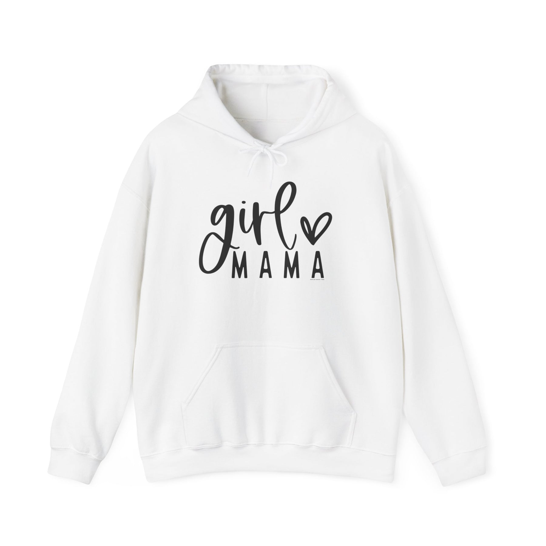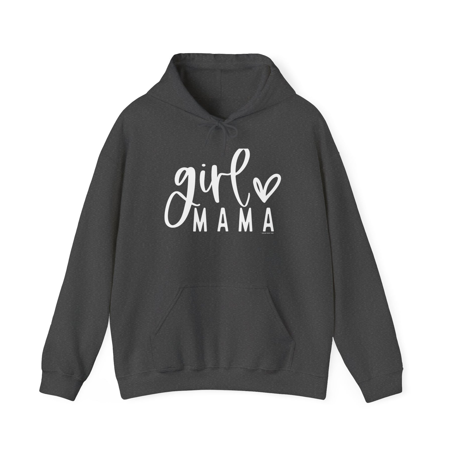 A cozy Girl Mama Hoodie in black, featuring white text. Unisex heavy blend with kangaroo pocket, drawstring hood, and cotton-polyester fabric for warmth and comfort. Ideal for chilly days.