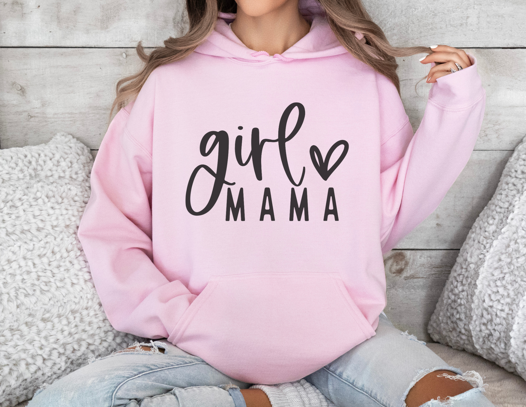 Girl Mama Hoodie: Pink sweatshirt with black text, kangaroo pocket, and matching drawstring. Unisex heavy blend for warmth and comfort. Ideal for cold days. Classic fit, tear-away label, true to size.