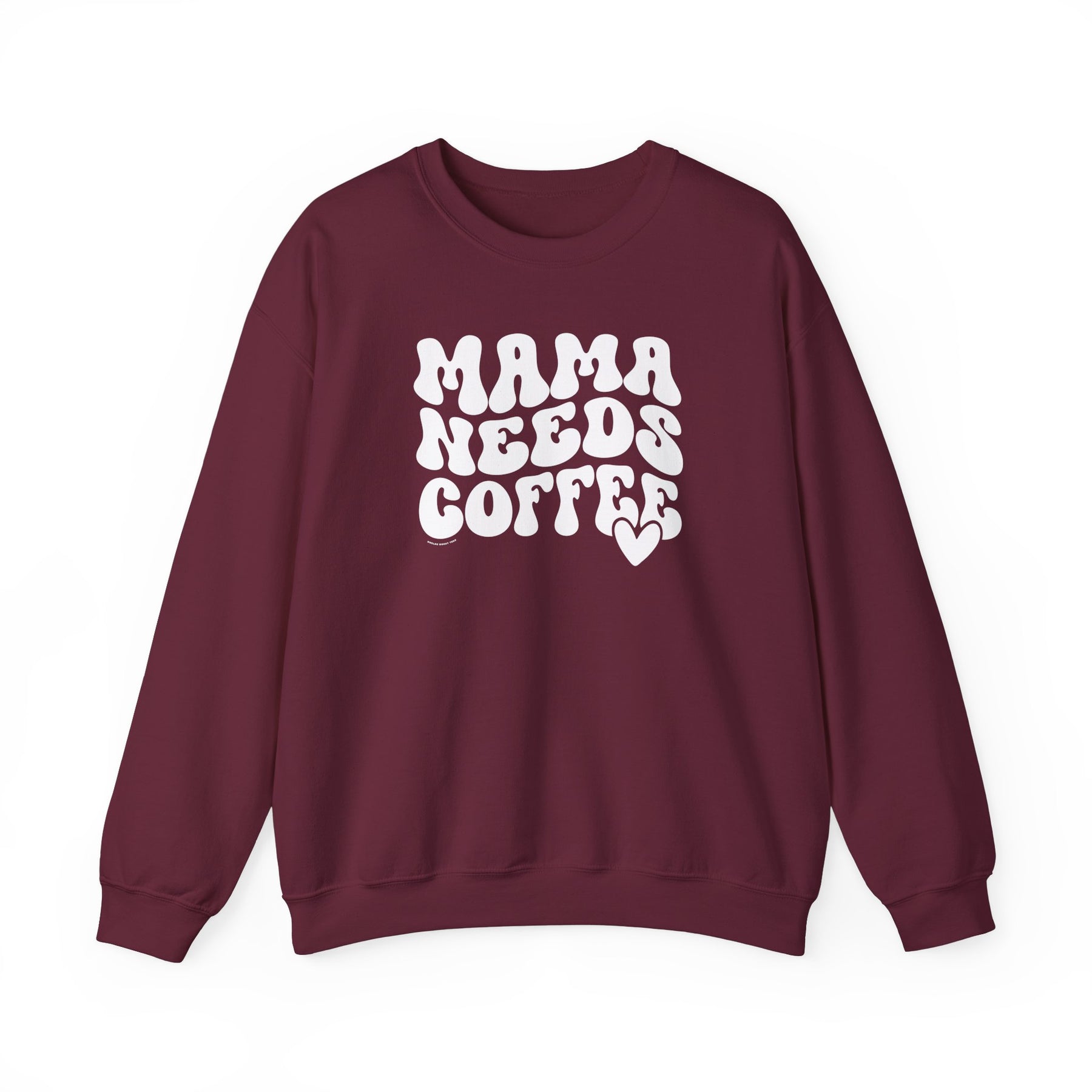 Unisex Mama Needs Coffee Crew sweatshirt, maroon with white text. Heavy blend fabric, ribbed knit collar, no itchy seams. 50% cotton, 50% polyester, loose fit, true to size. Sizes S-5XL.
