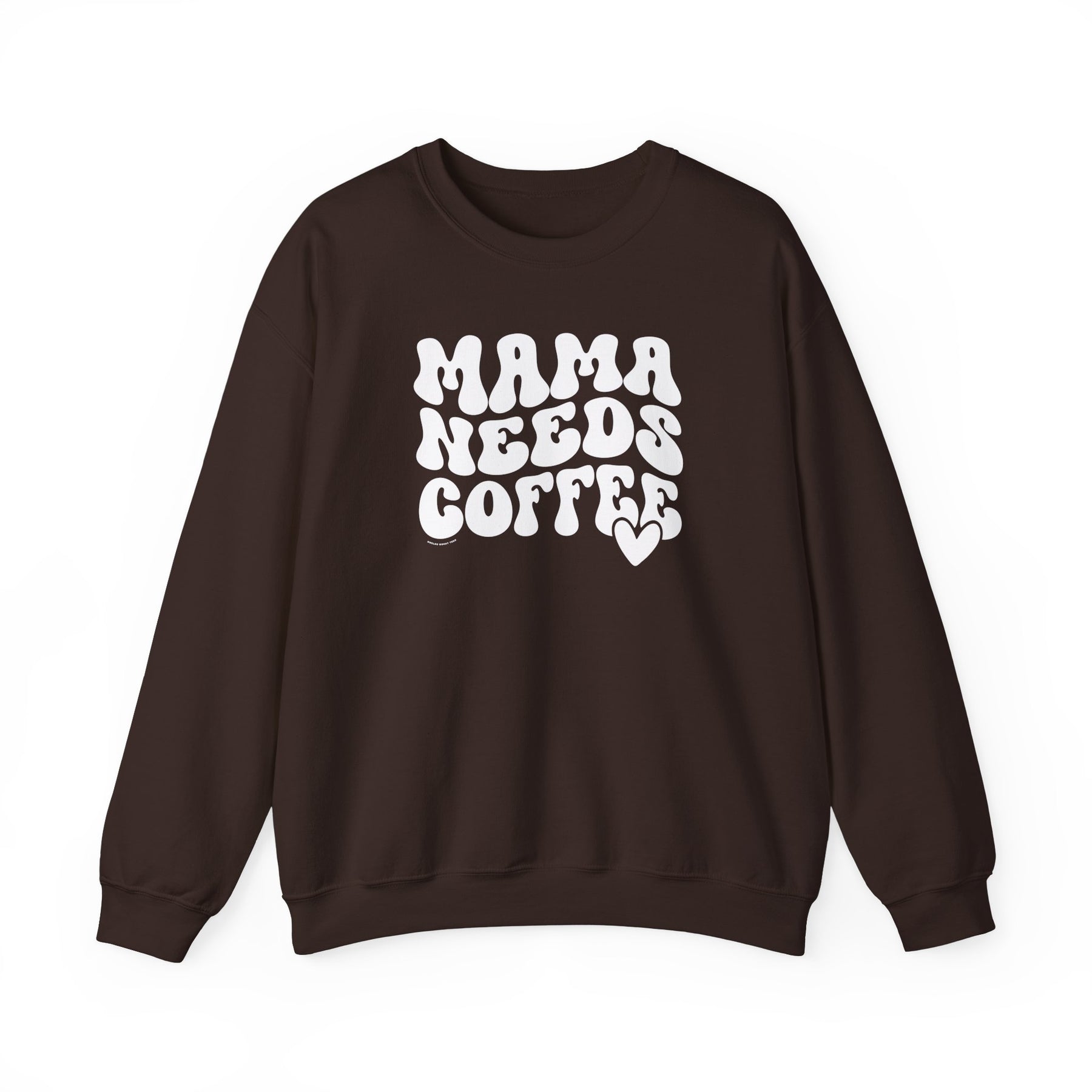 A Mama Needs Coffee Crew unisex sweatshirt in brown with white text. Heavy blend fabric, ribbed knit collar, no itchy seams. Ideal for comfort, loose fit, true to size.