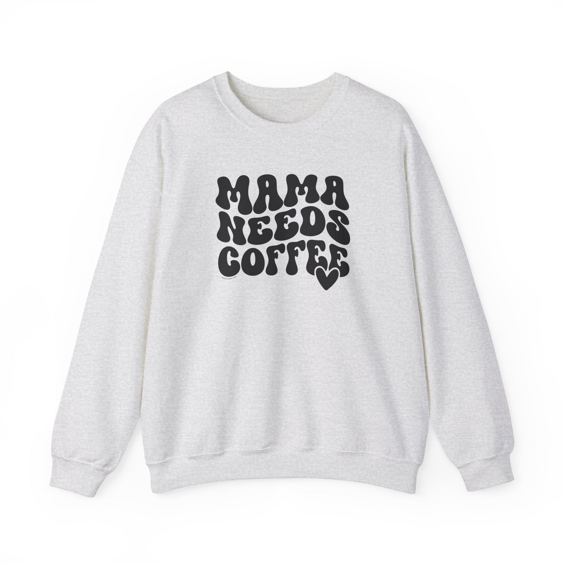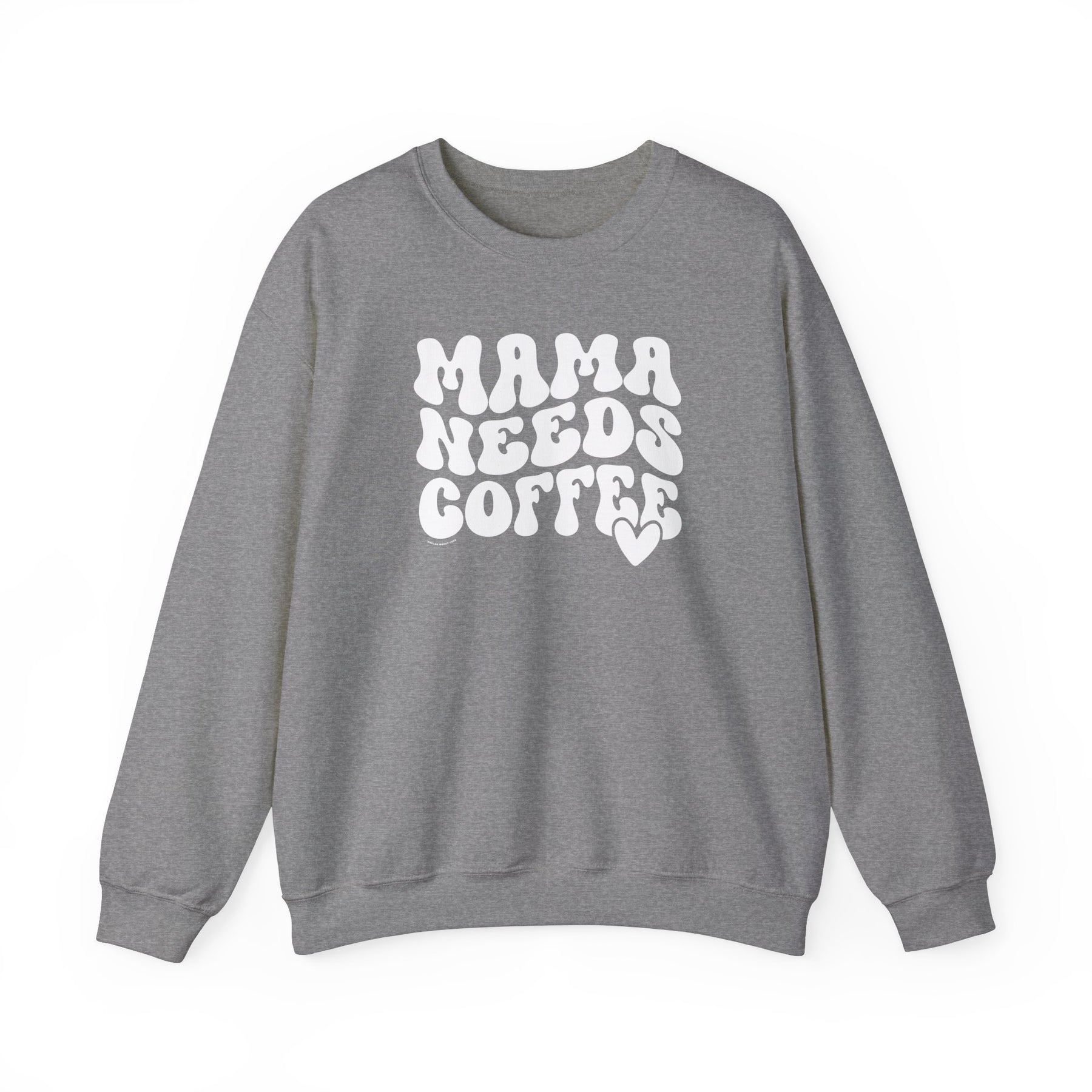 A cozy Mama Needs Coffee Crew sweatshirt in grey with white text. Unisex heavy blend fabric, ribbed knit collar, no itchy seams. Ideal for comfort, featuring 50% cotton, 50% polyester.