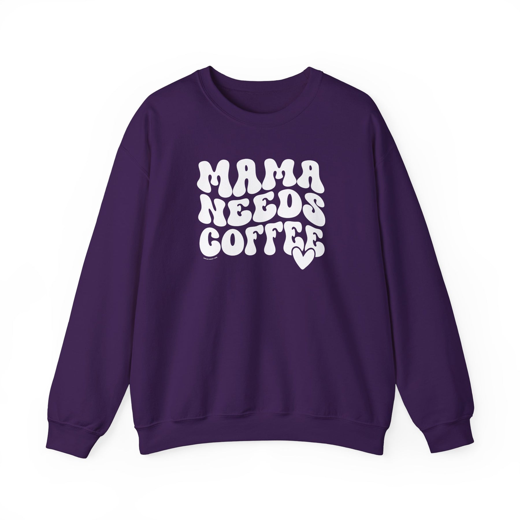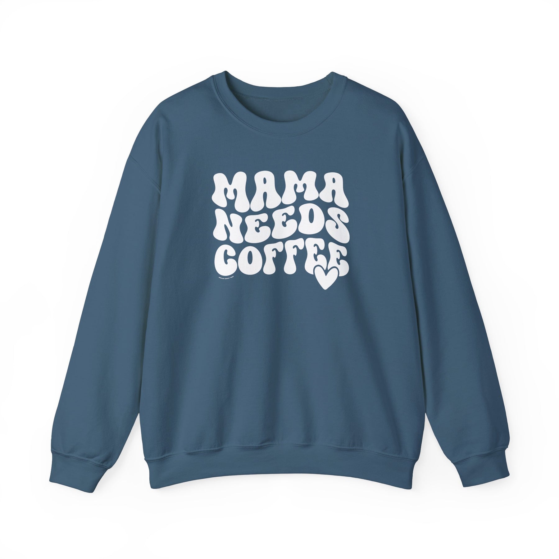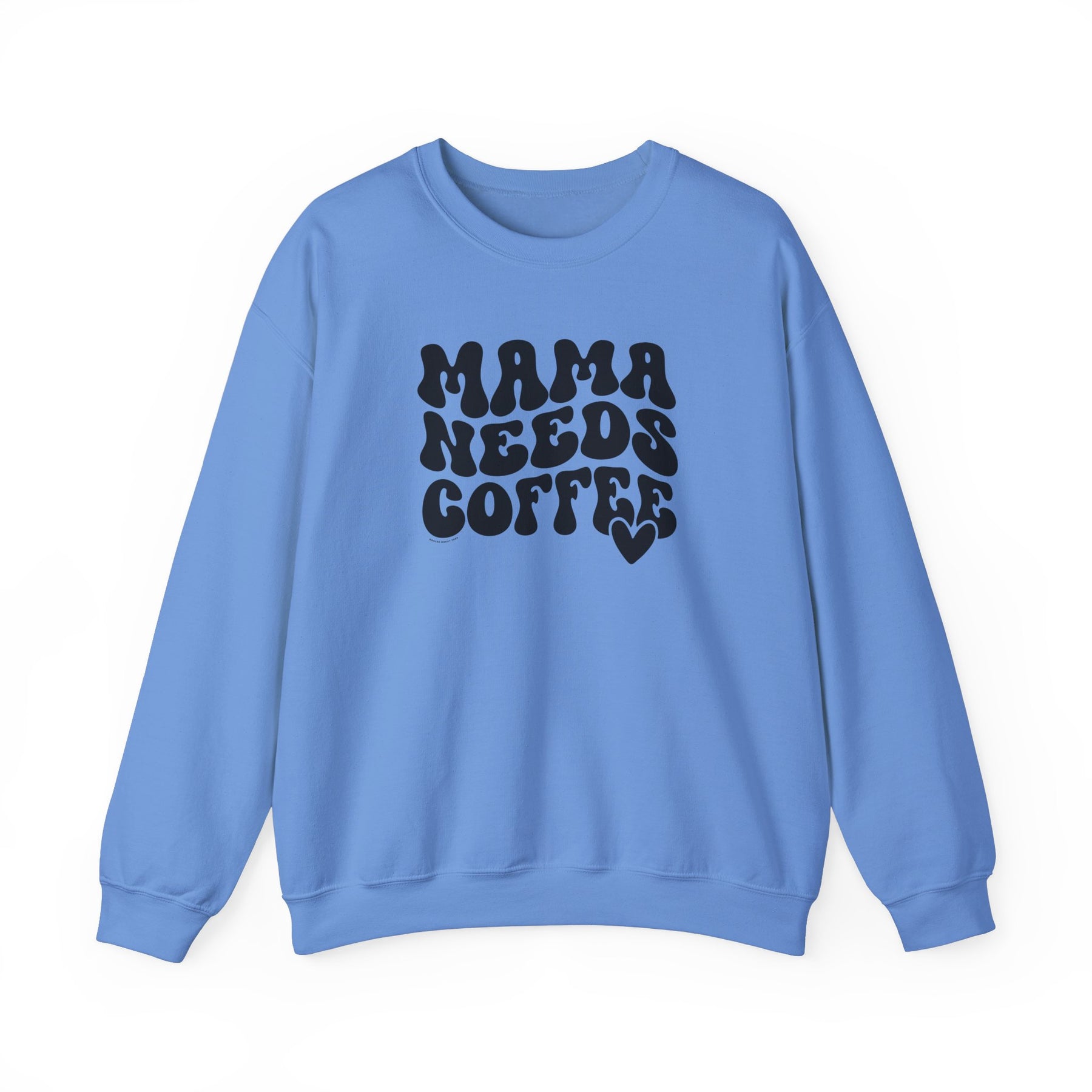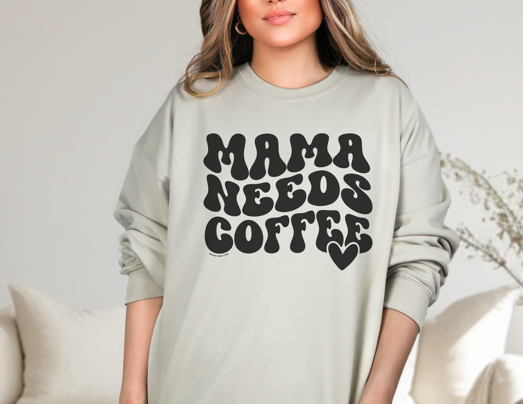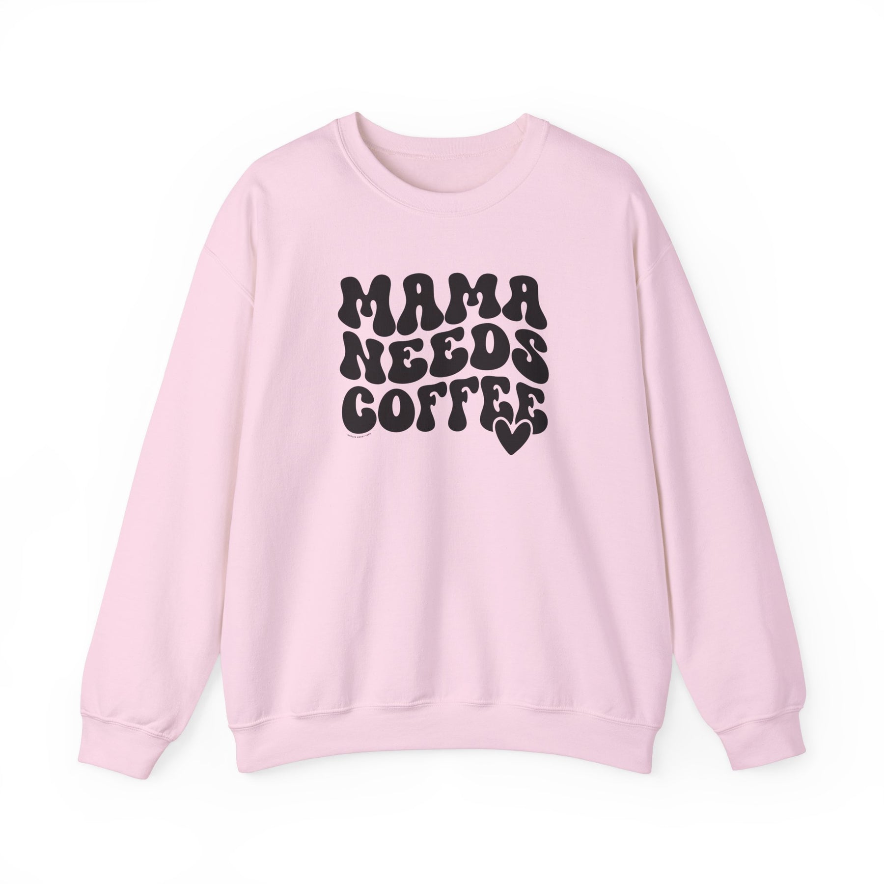A cozy Mama Needs Coffee Crew unisex sweatshirt with ribbed knit collar, no itchy seams, and a loose fit. 50% cotton, 50% polyester blend, medium-heavy fabric. Sizes S-5XL.