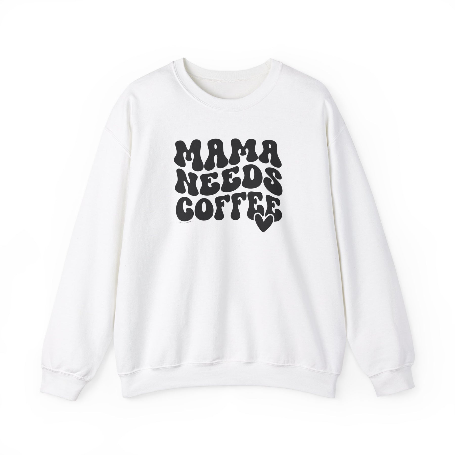 Unisex Mama Needs Coffee Crew sweatshirt, white with black text. Heavy blend fabric, ribbed knit collar, no itchy side seams. 50% cotton, 50% polyester. Loose fit, true to size.