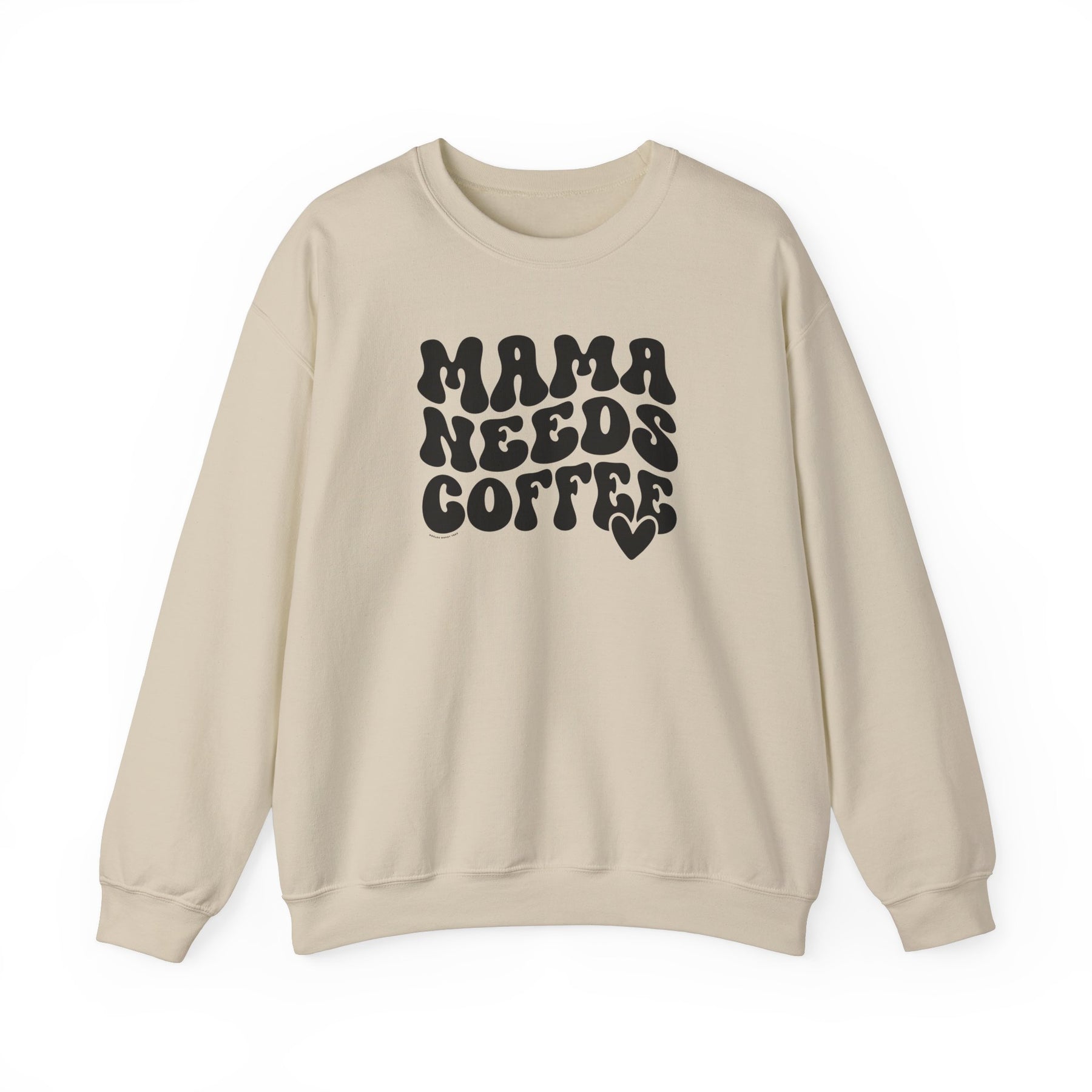 A unisex heavy blend crewneck sweatshirt titled Mama Needs Coffee Crew in beige with black text. Made of 50% cotton, 50% polyester, ribbed knit collar, no itchy side seams, loose fit, medium-heavy fabric.