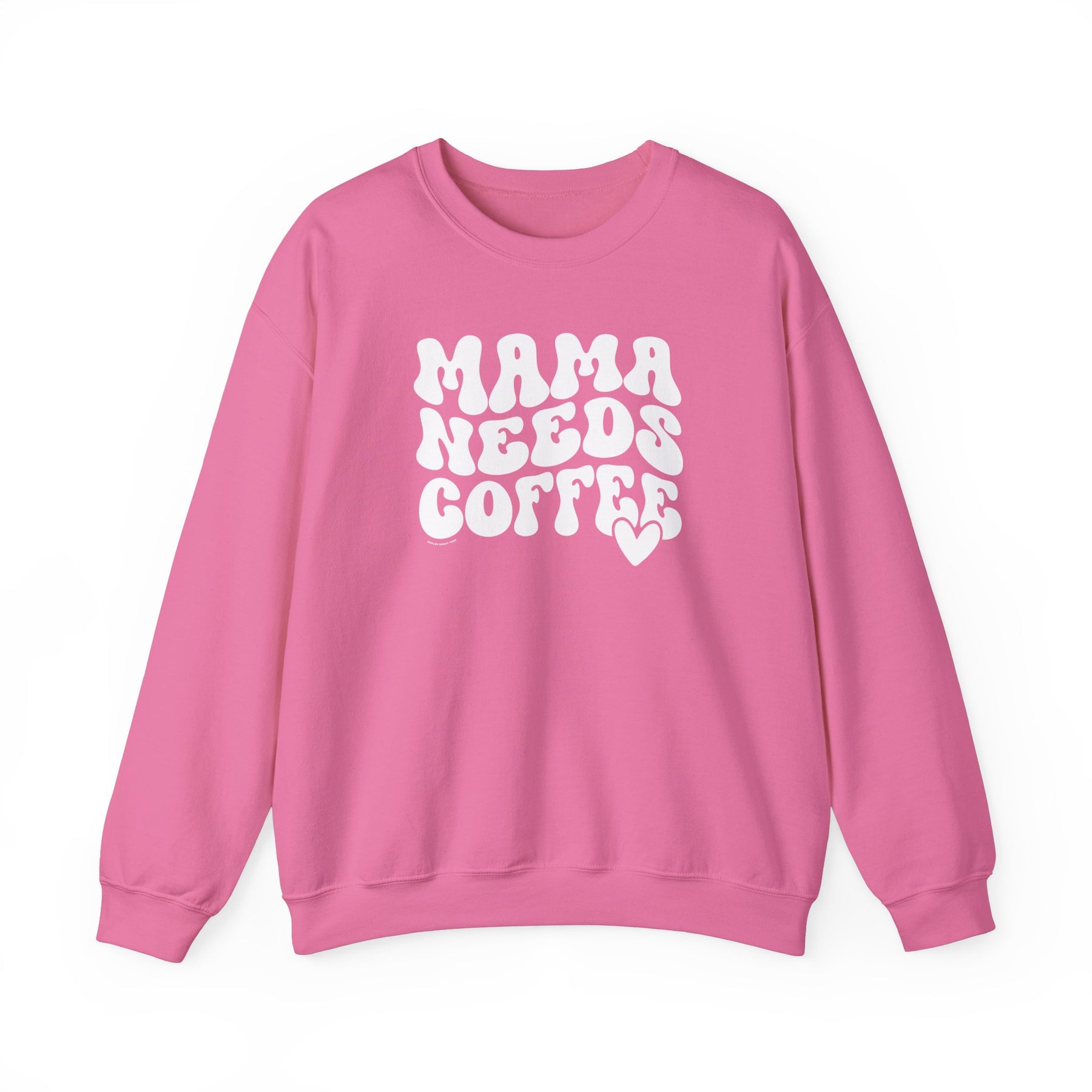 A cozy Mama Needs Coffee Crew sweatshirt in pink with white text, a comfy blend of polyester and cotton. Ribbed knit collar, no itchy seams, loose fit. Ideal for comfort in a medium-heavy fabric.