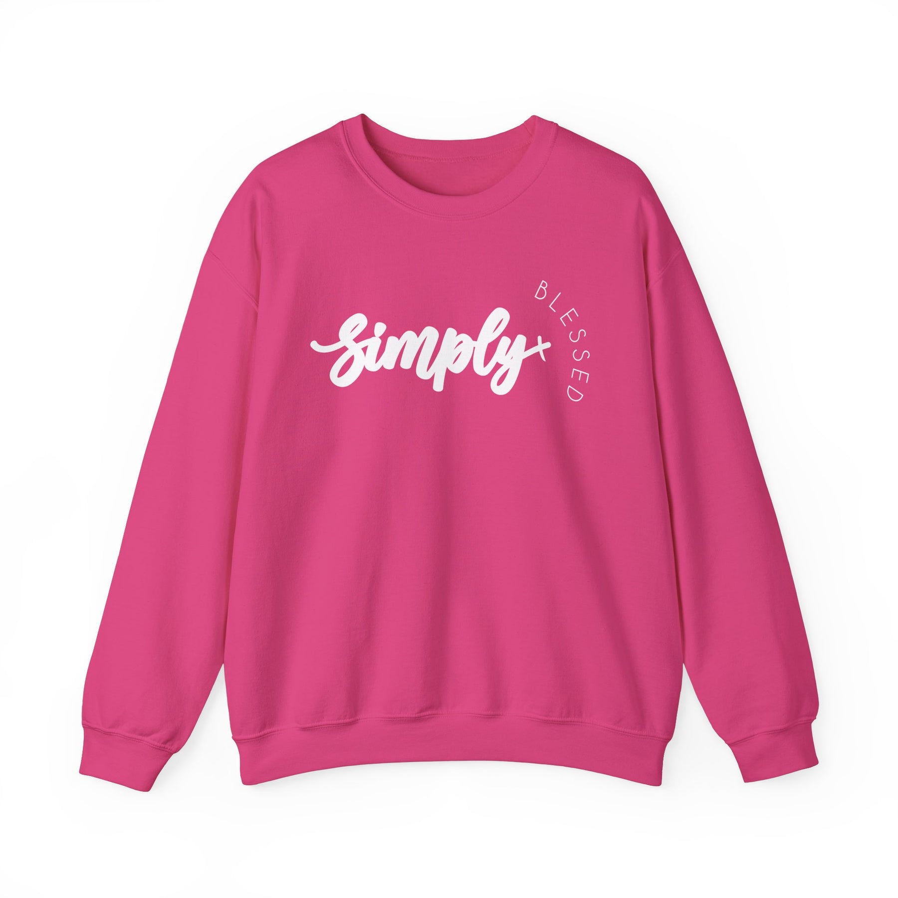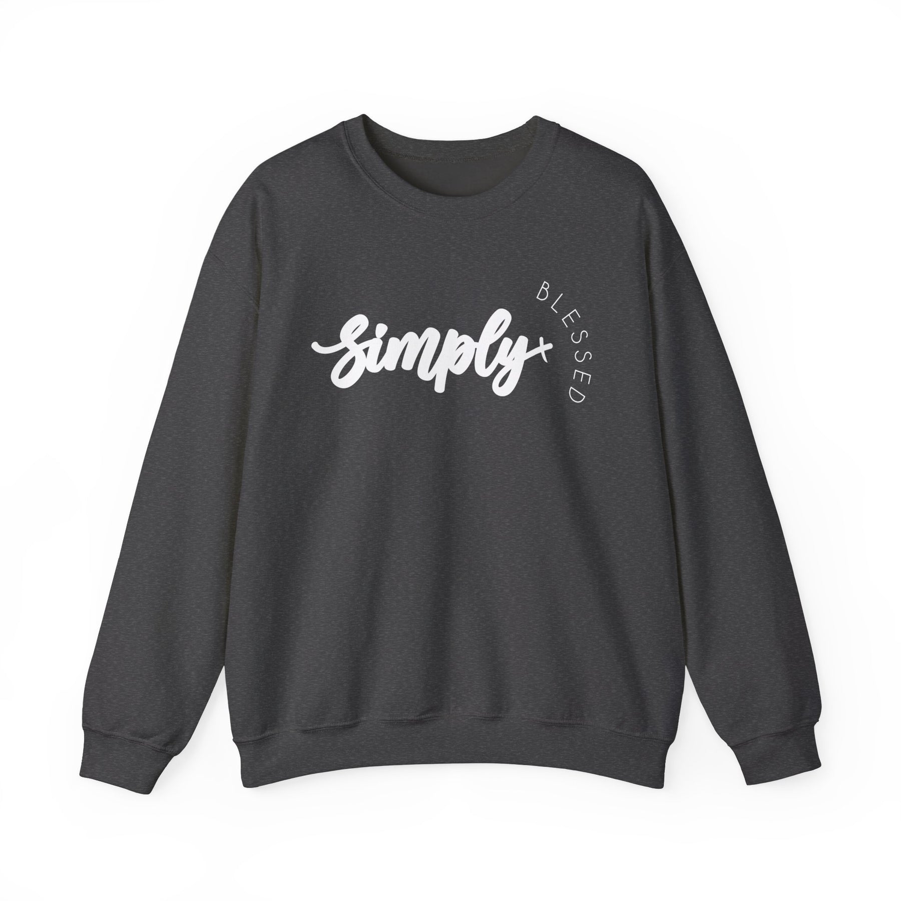 Simply Blessed Crew sweatshirt, unisex heavy blend, featuring ribbed knit collar and seamless sides for comfort and fit, available in multiple sizes.