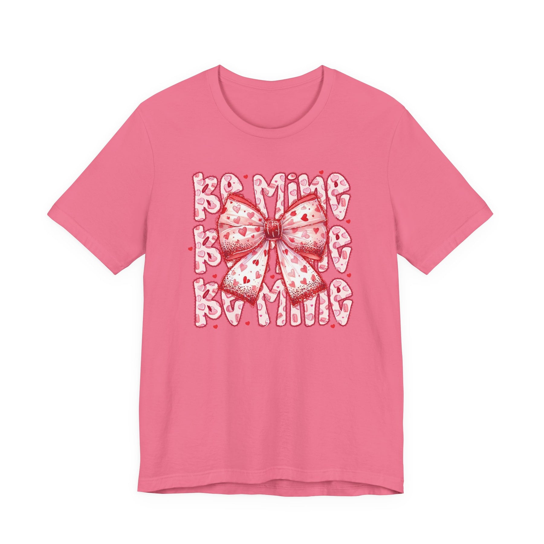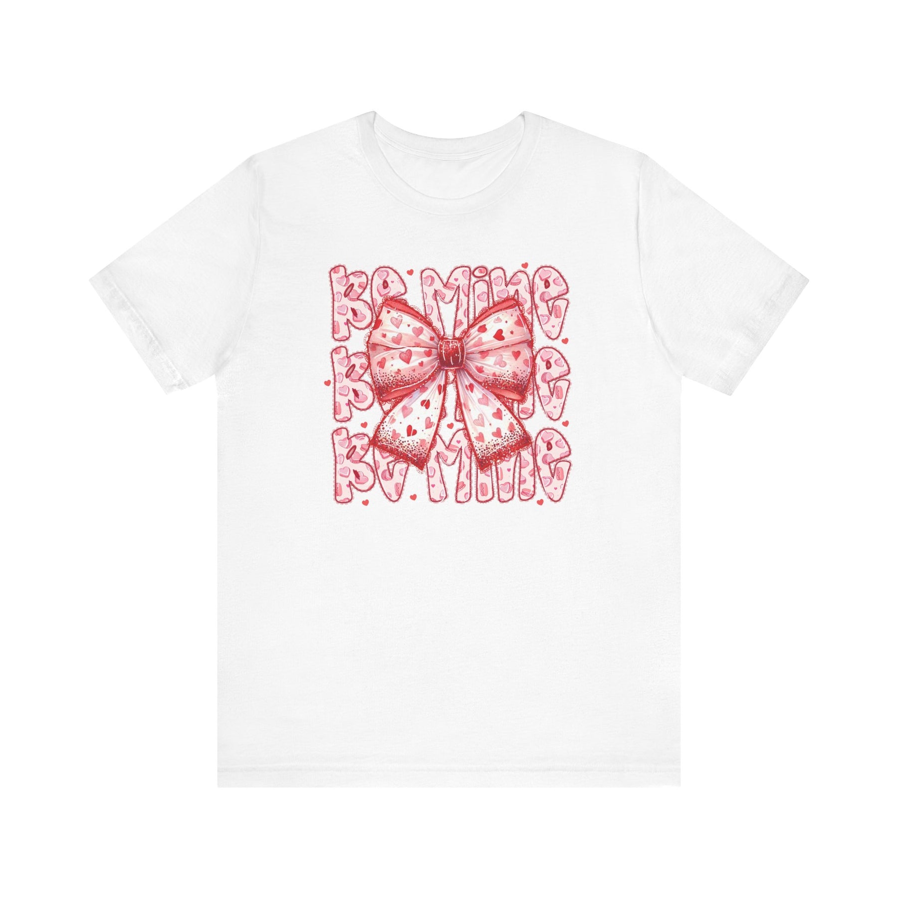 Be Mine Tee with heart-spattered bow and BE MINE text, perfect for Valentine's Day. Classic unisex fit, soft cotton, ribbed collar, and durable stitching.