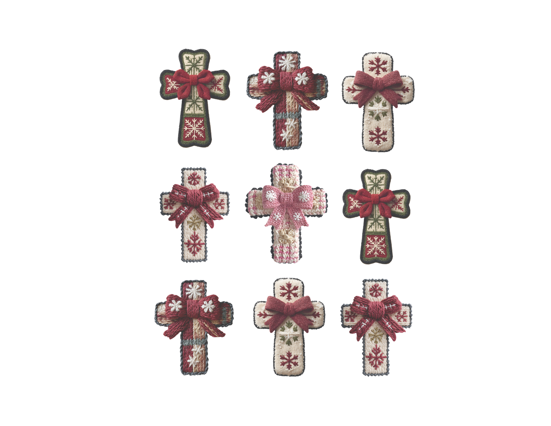 Nine handcrafted, Christmas-themed cross-shaped ornaments with snowflake motifs and yarn bows, showcasing Faith Family Designs' unique textile decorations.
