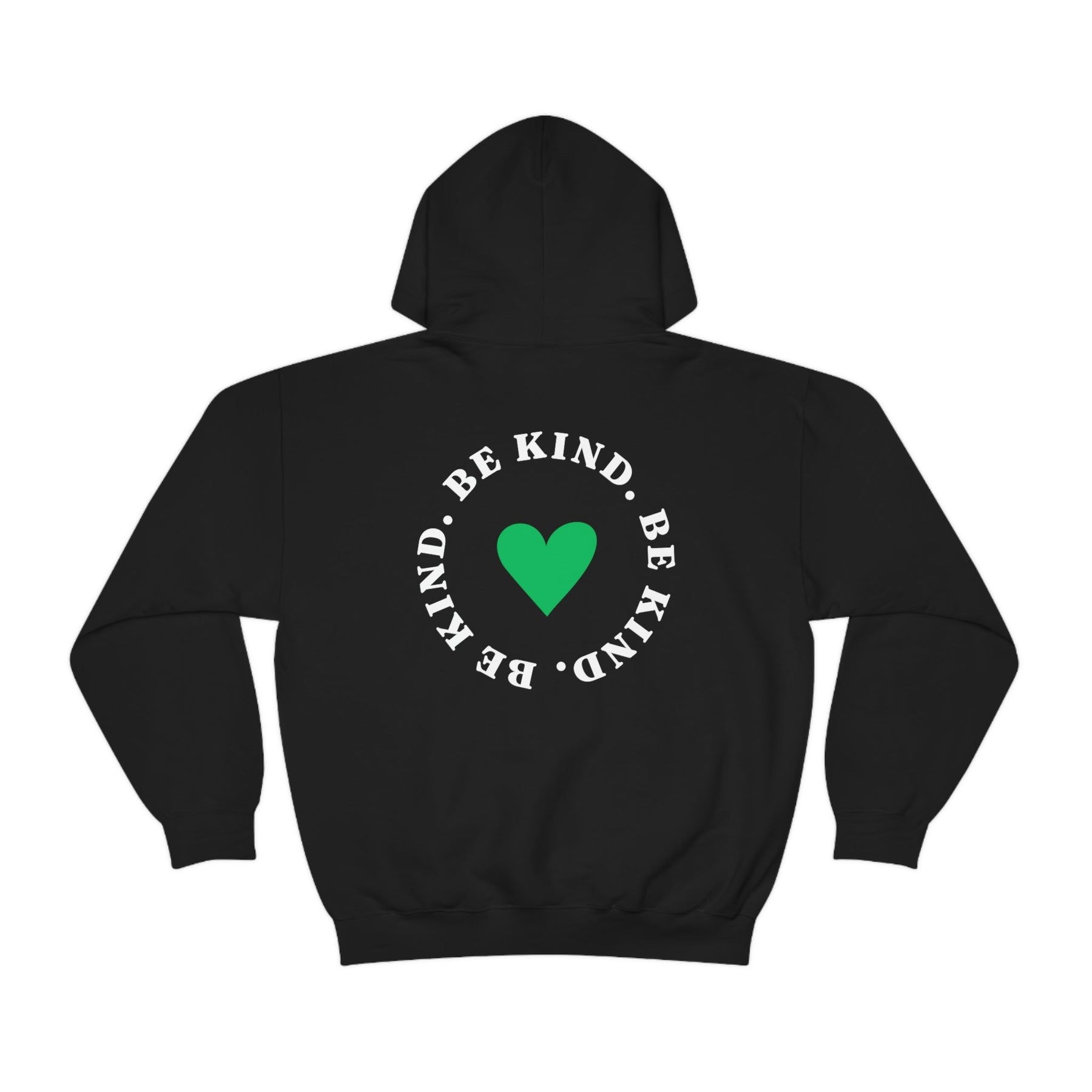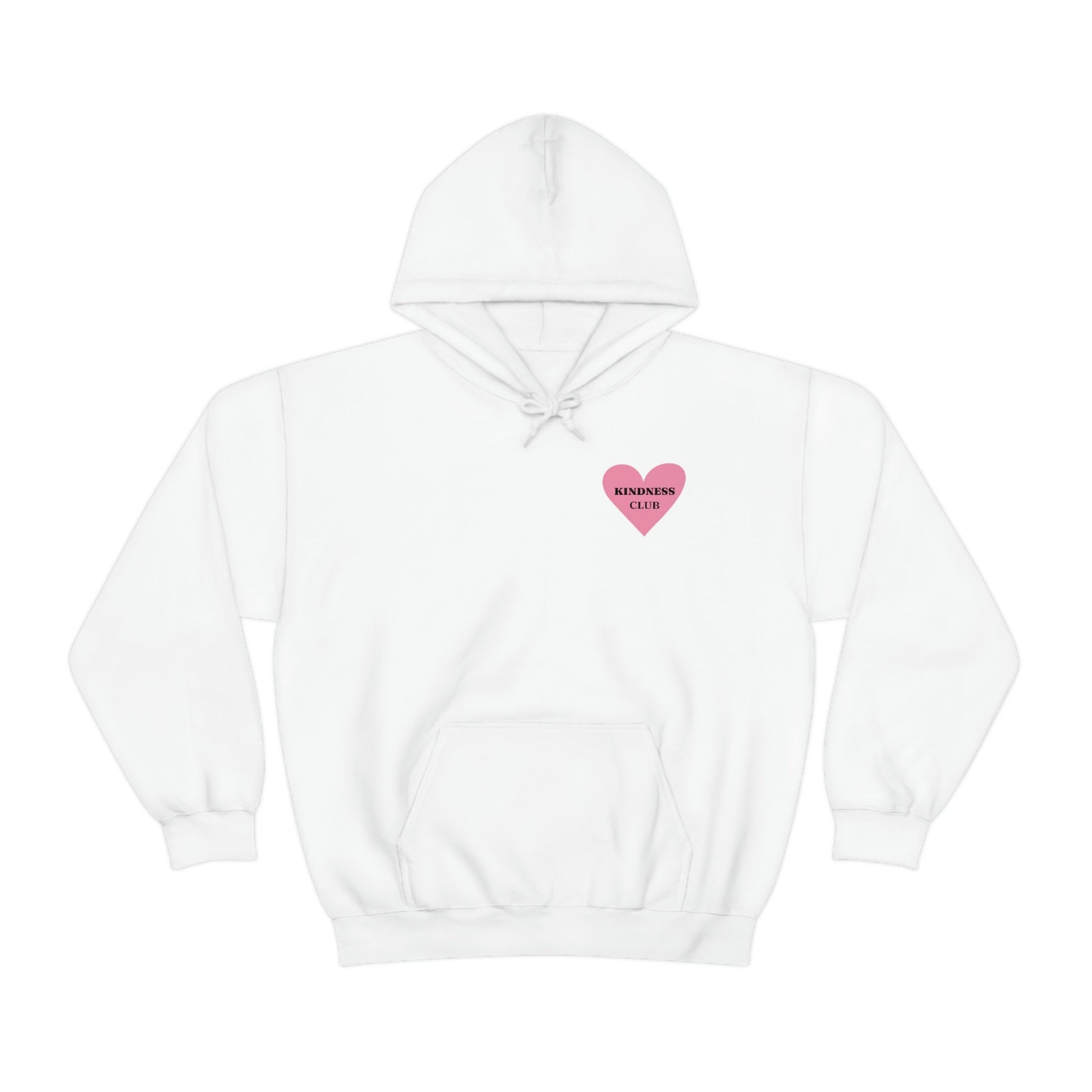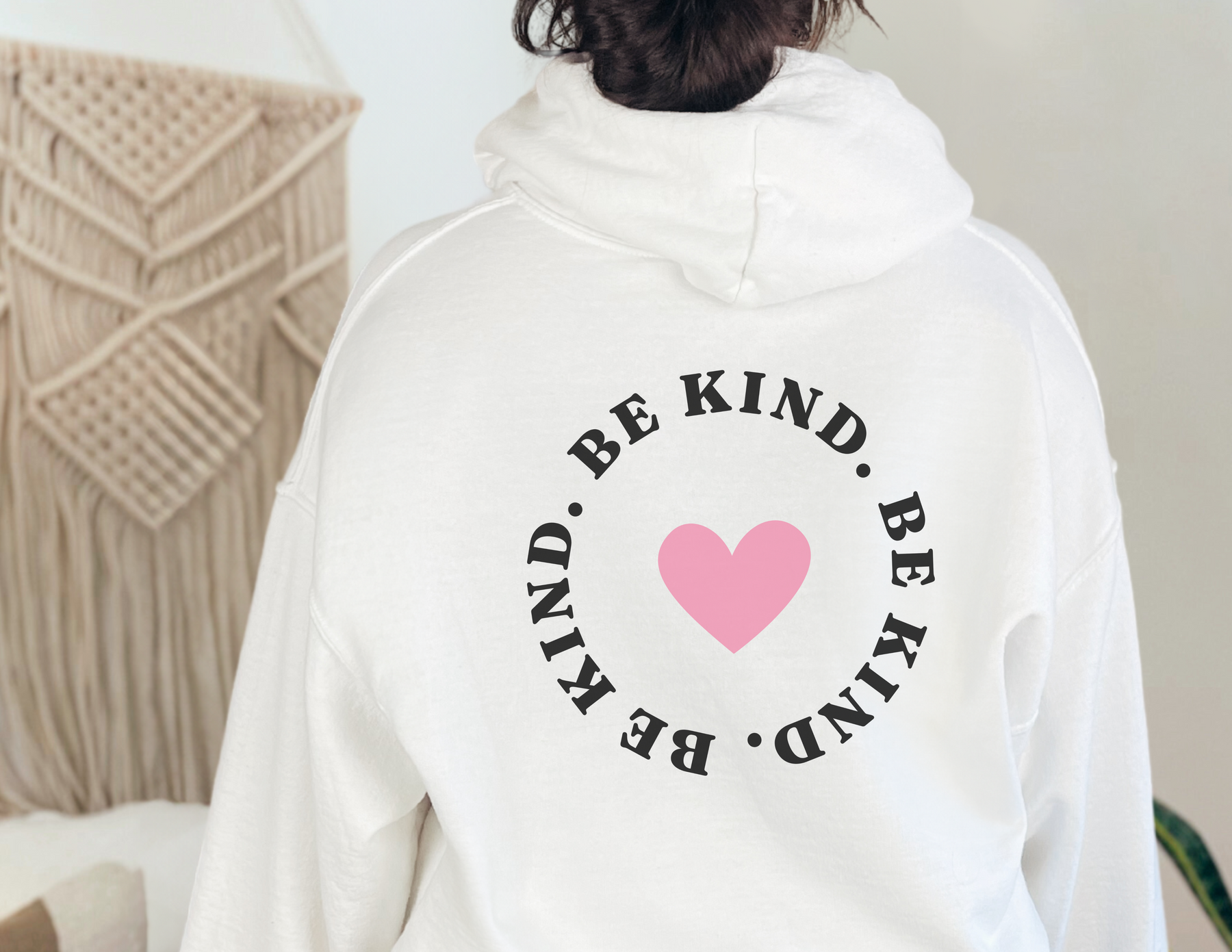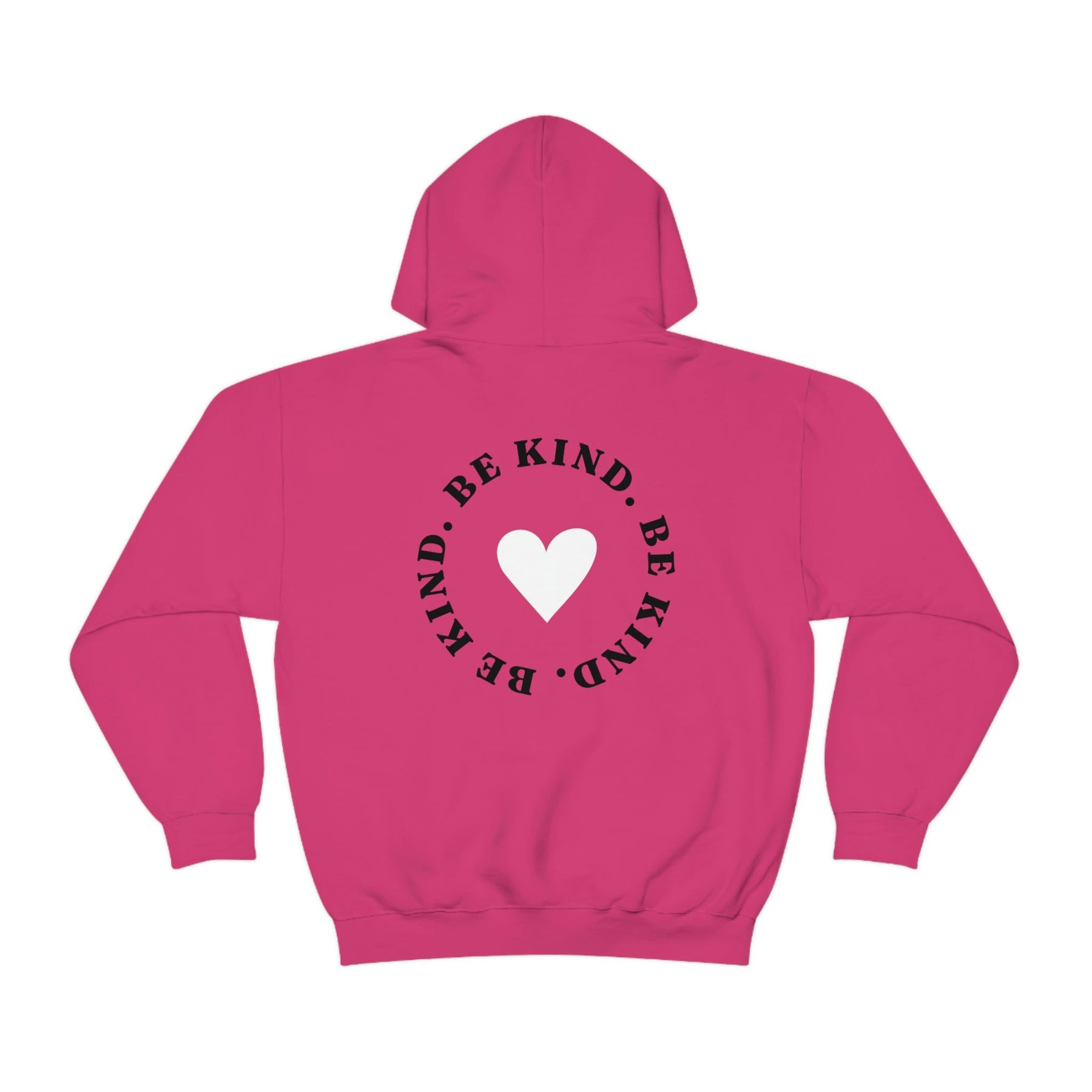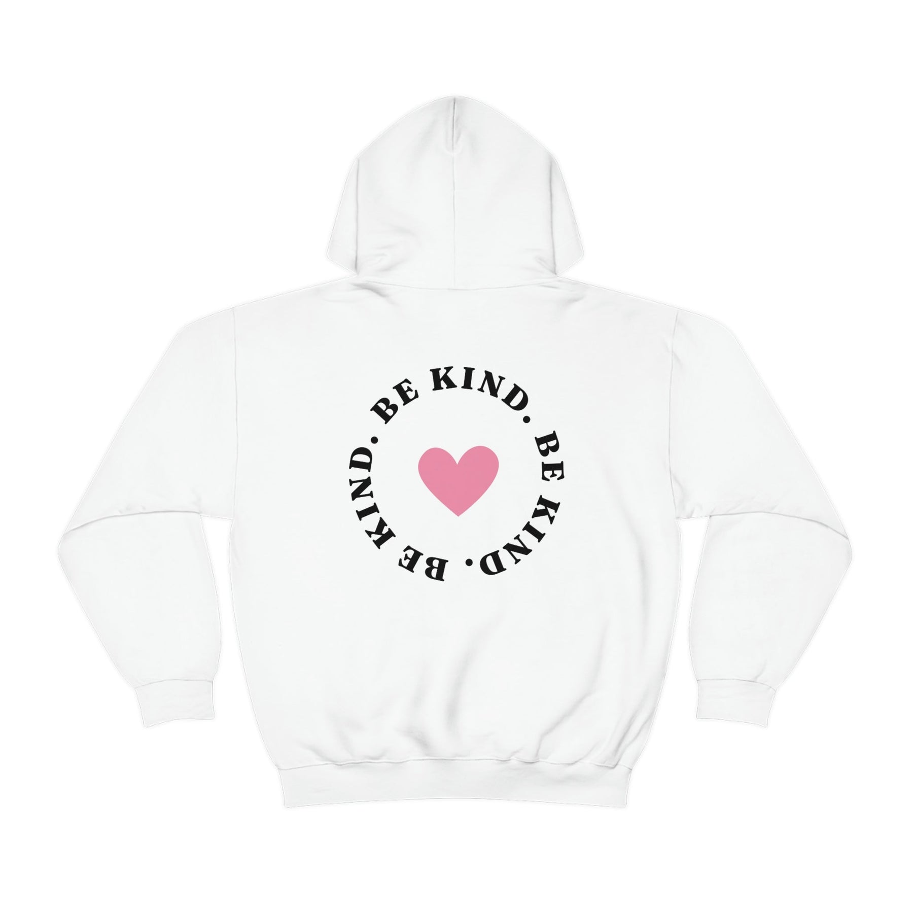 Unisex BE KIND Sweatshirt: White with pink heart design. Heavy blend fabric, kangaroo pocket, matching drawstring hood. Cozy, stylish, perfect for cold days. Classic fit, tear-away label, true to size.