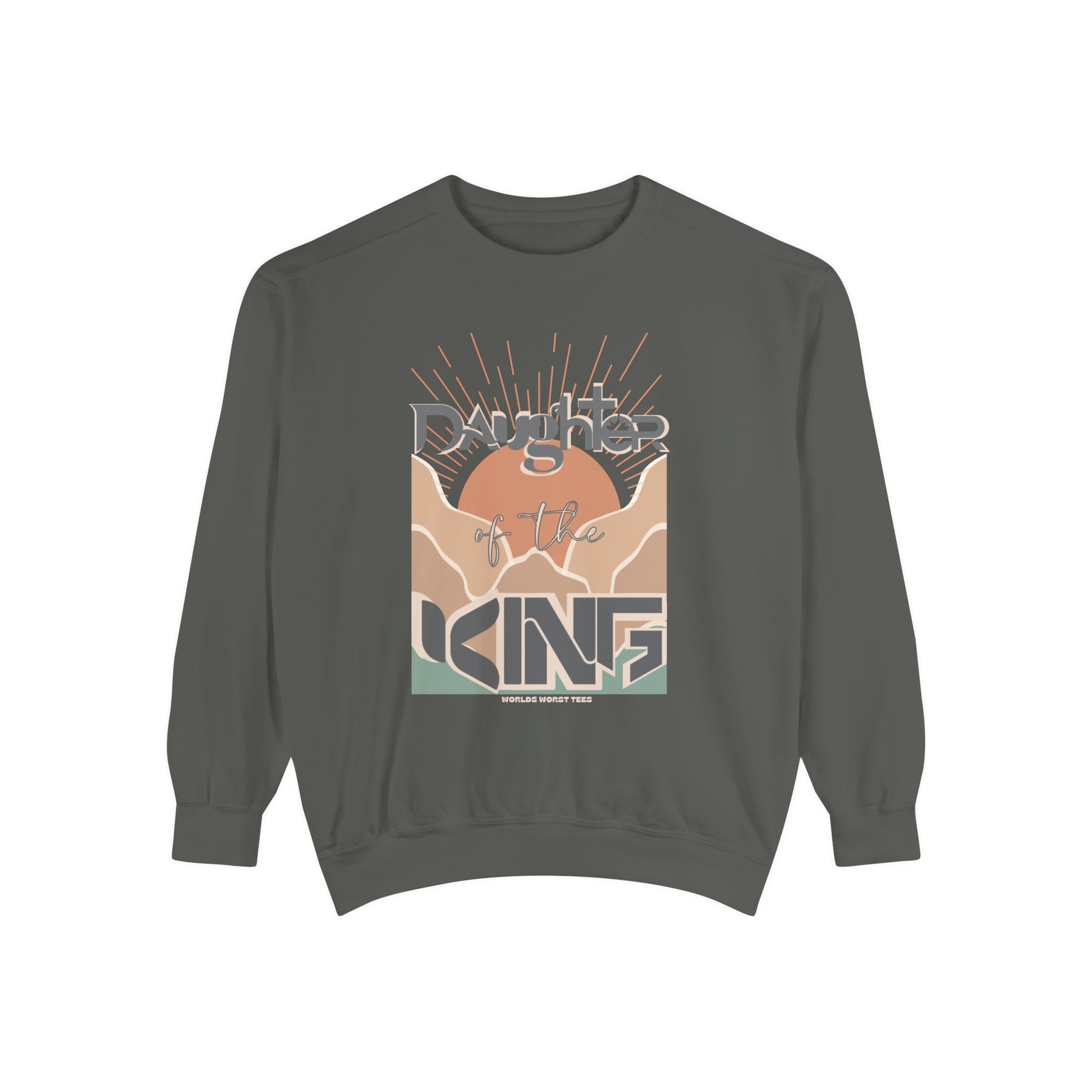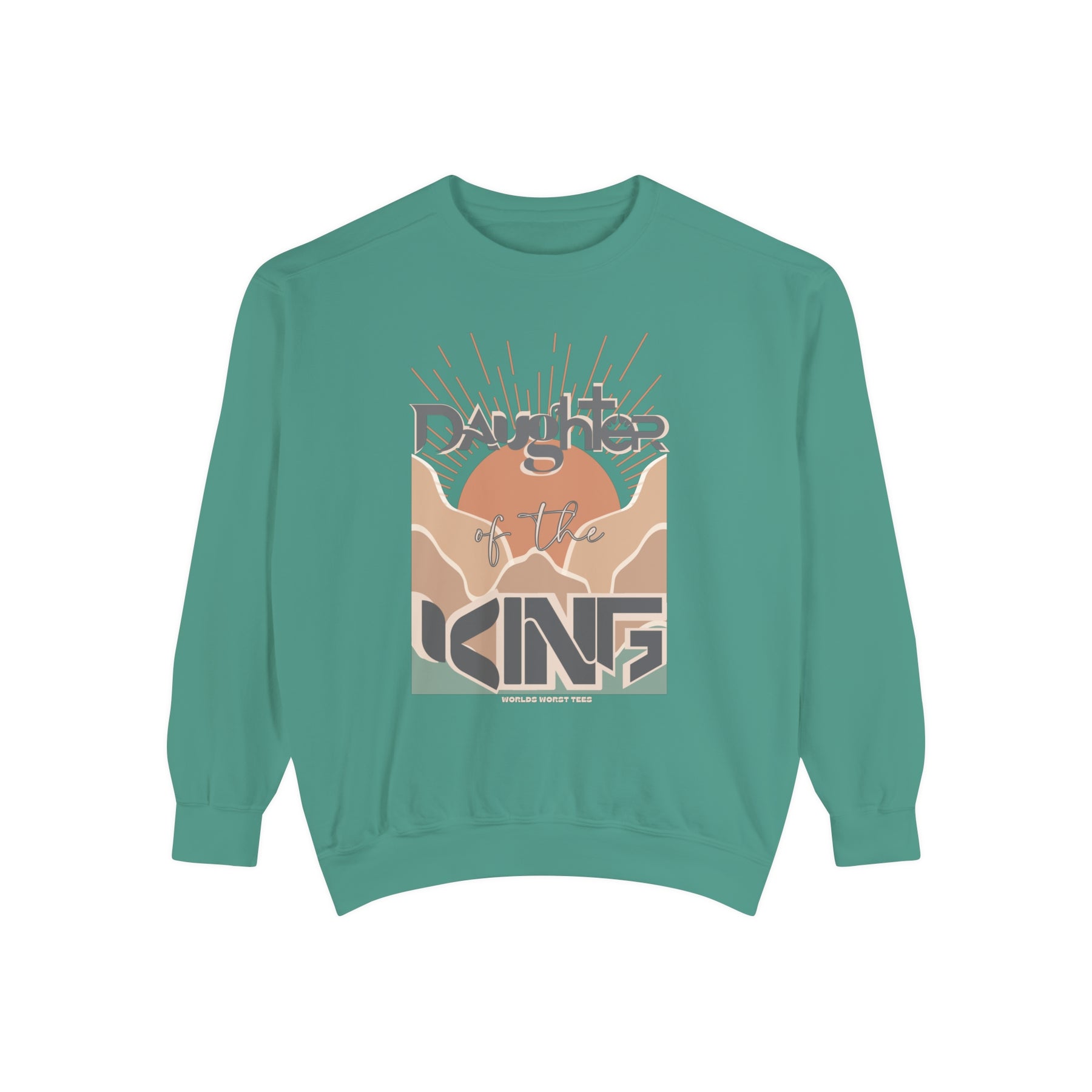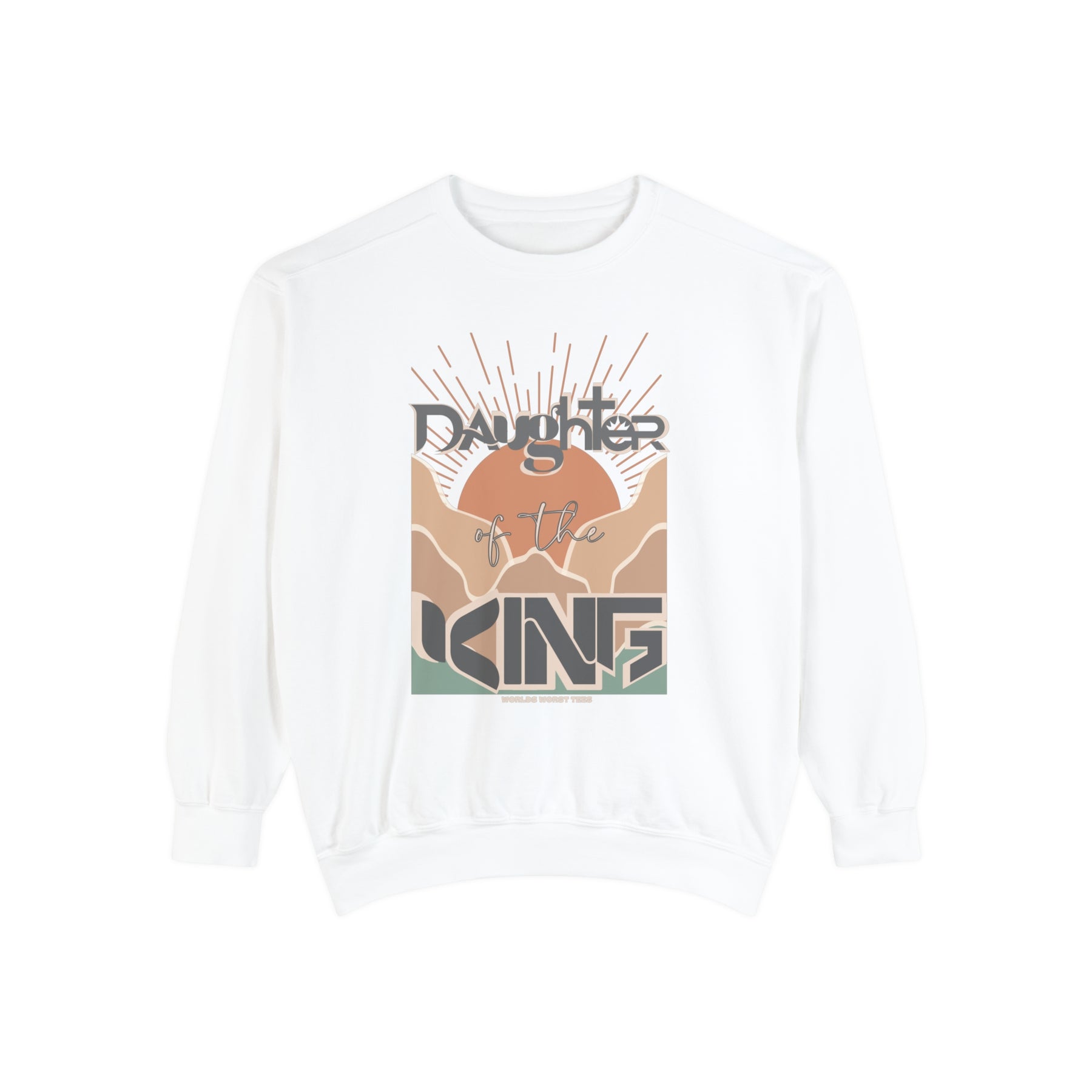 Unisex Daughter of the King Crew sweatshirt, garment-dyed with 80% ring-spun cotton and 20% polyester. Features relaxed fit, rolled-forward shoulder, and back neck patch. Medium-heavy fabric.