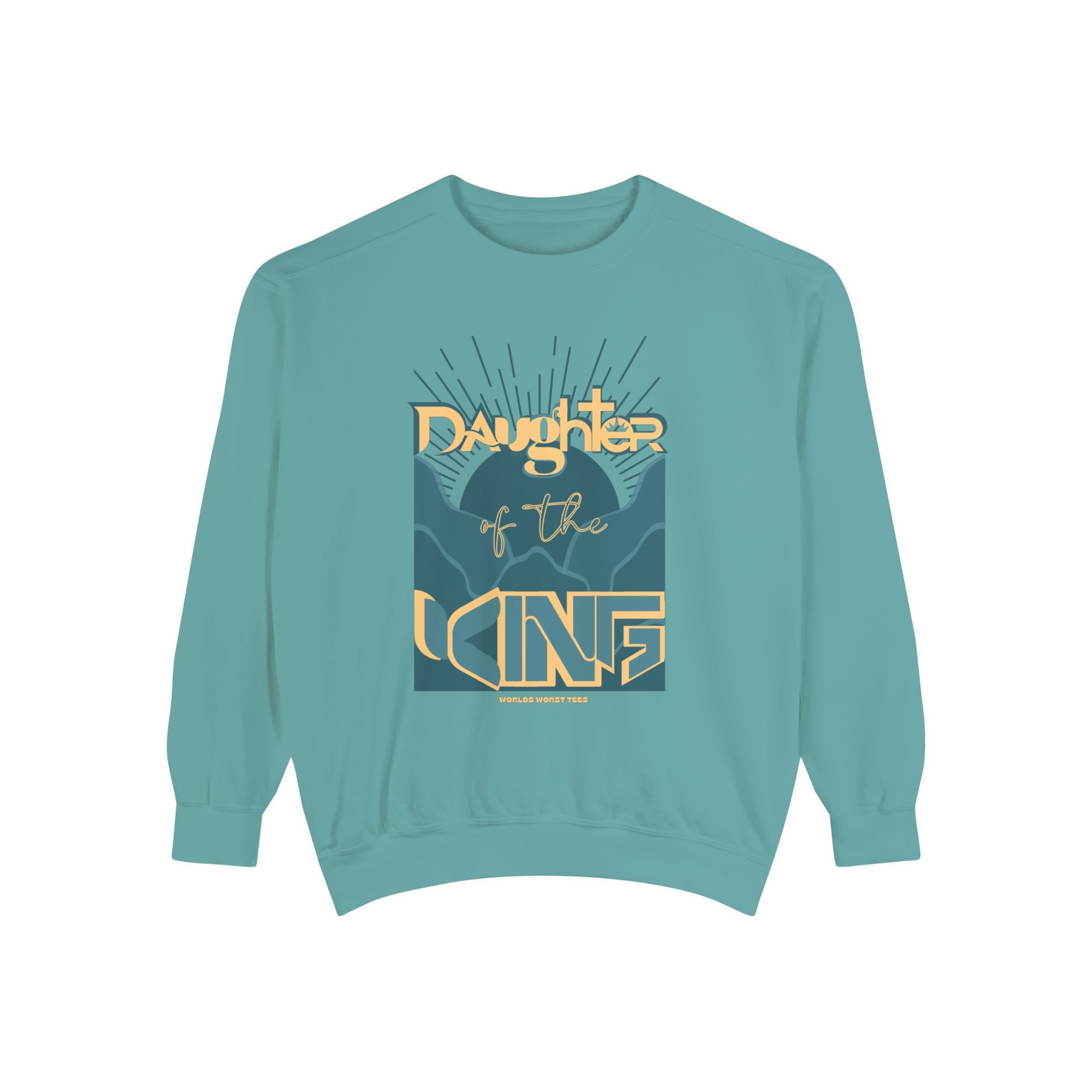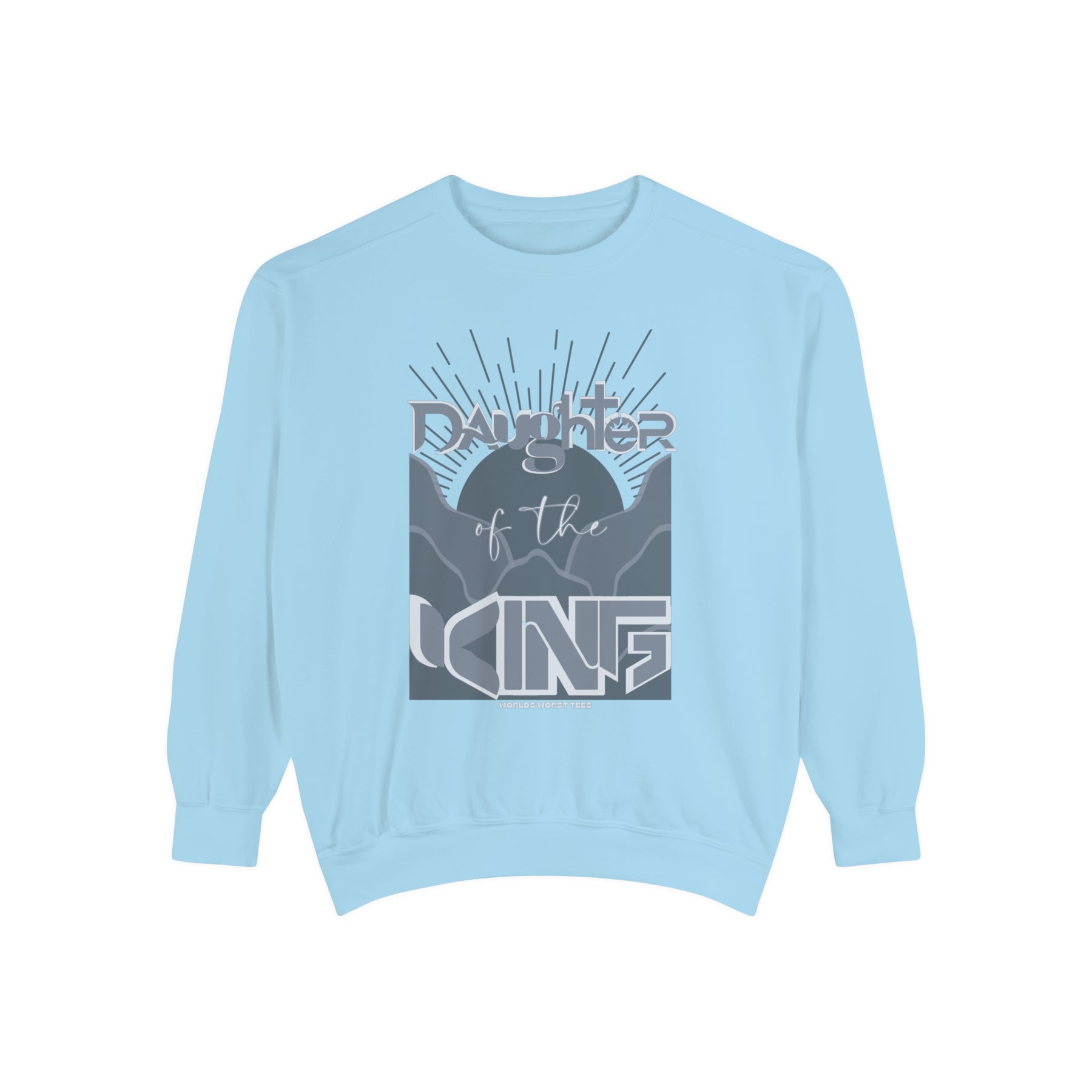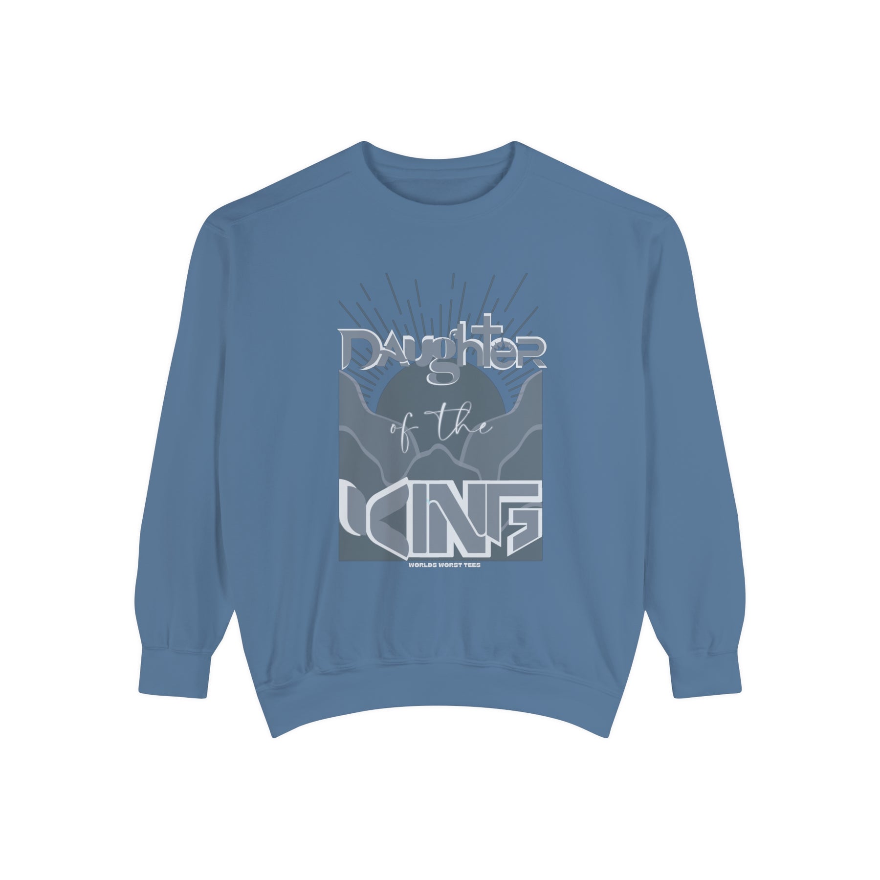Daughter of the King Crew unisex sweatshirt in blue with graphic design. Luxurious 80% ring-spun cotton, 20% polyester fabric, relaxed fit, rolled-forward shoulder, and back neck patch. From Worlds Worst Tees.