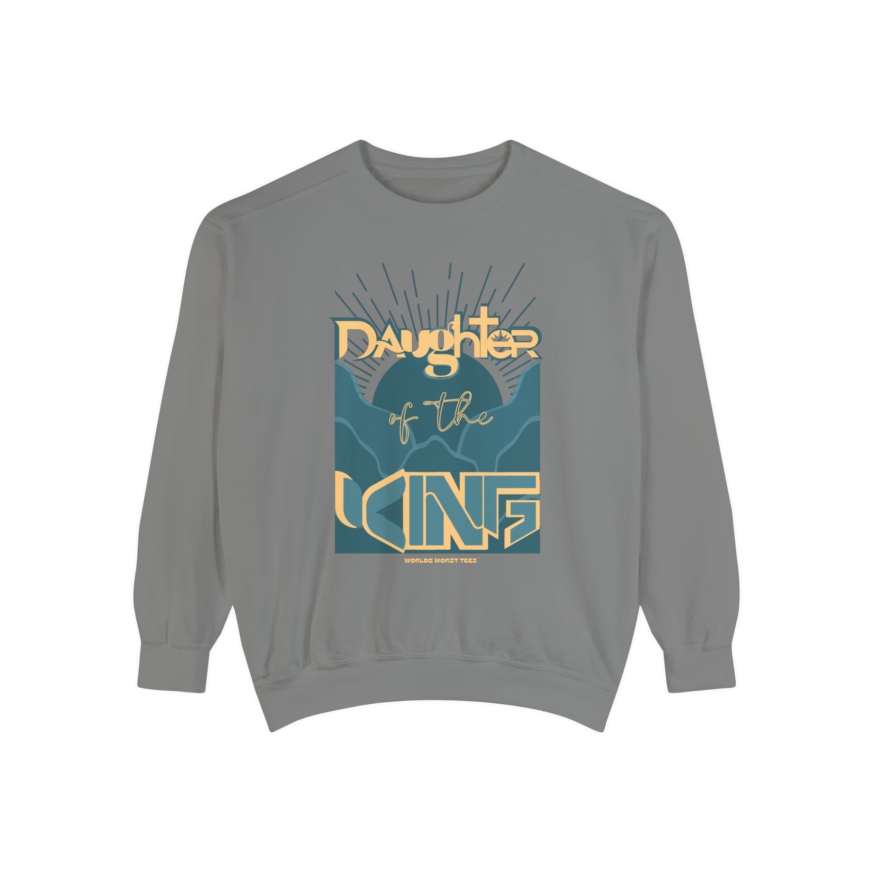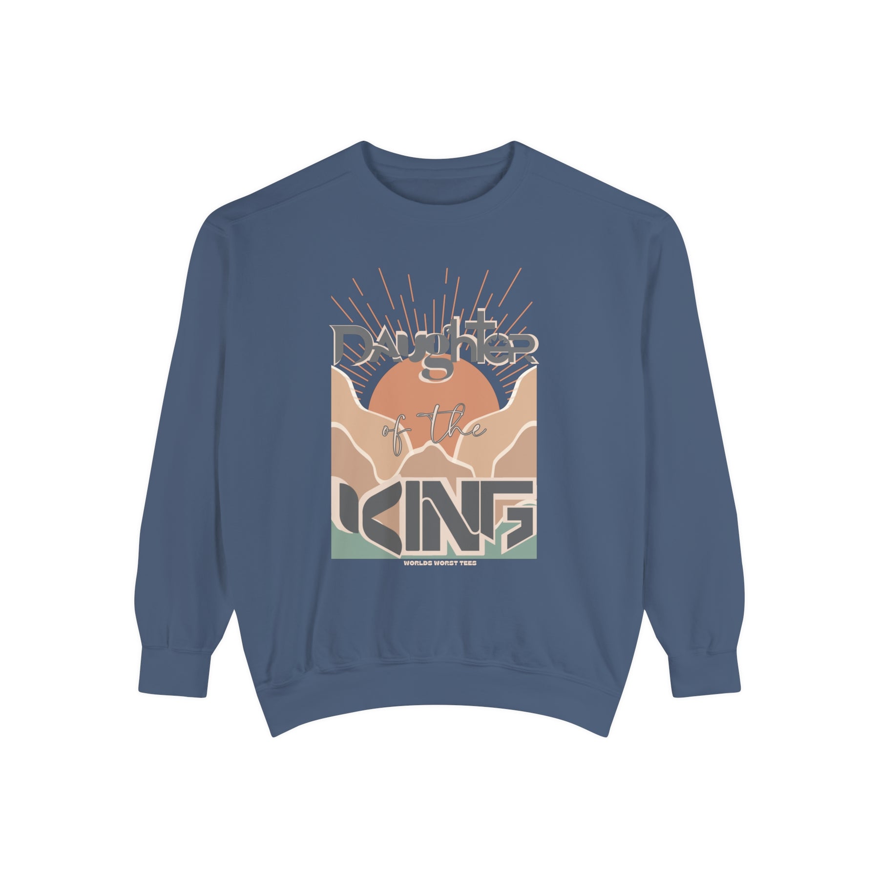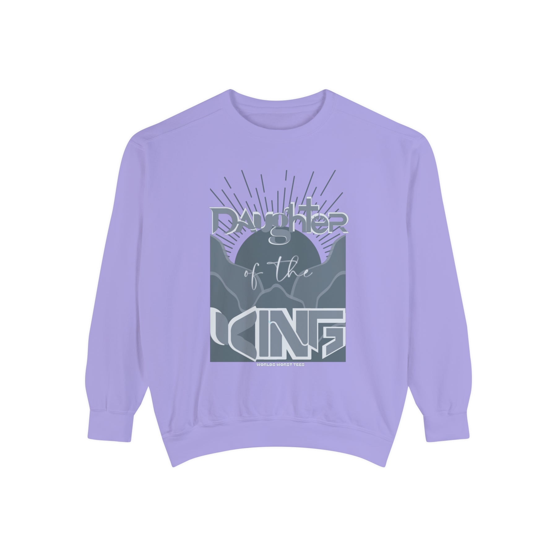 Daughter of the King Crew unisex sweatshirt in blue with graphic design. Luxurious 80% ring-spun cotton, 20% polyester fabric, relaxed fit, rolled-forward shoulder, and back neck patch. From Worlds Worst Tees.