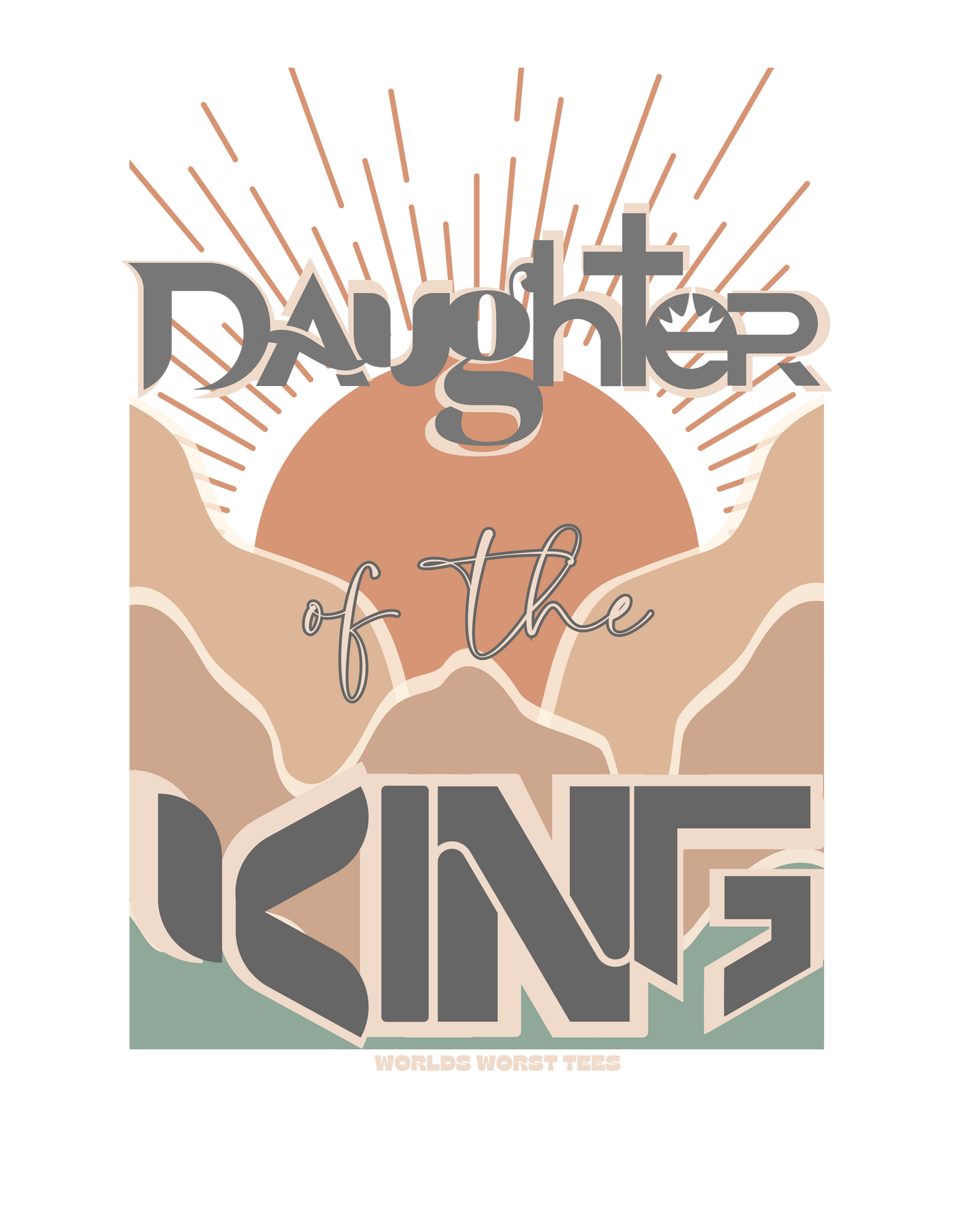 Daughter of the King Crew unisex sweatshirt with a graphic design of a sun and mountains, 80% ring-spun cotton, 20% polyester, relaxed fit, rolled-forward shoulder, medium-heavy fabric.