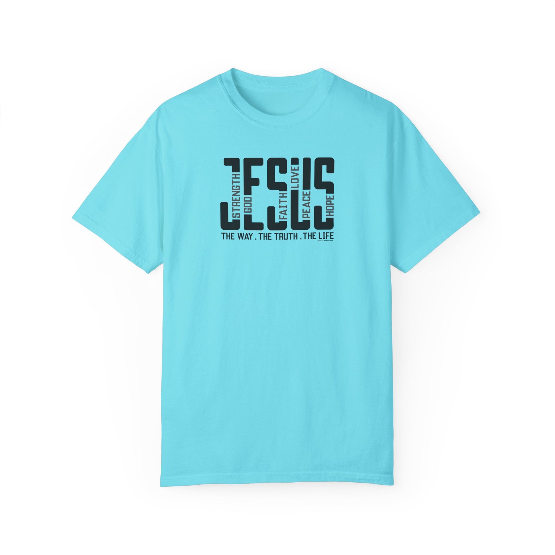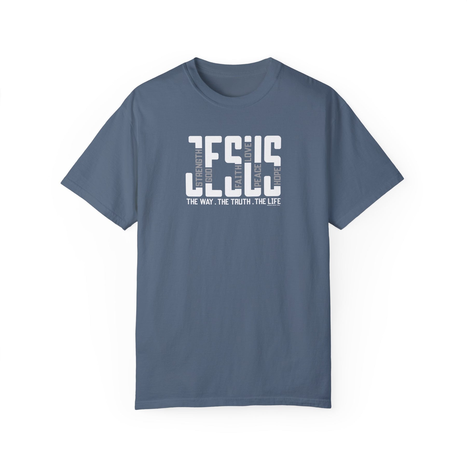 Relaxed fit Jesus Tee in blue with black text. 100% ring-spun cotton, garment-dyed for coziness. Double-needle stitching for durability, tubular shape retention. Ideal for daily wear.