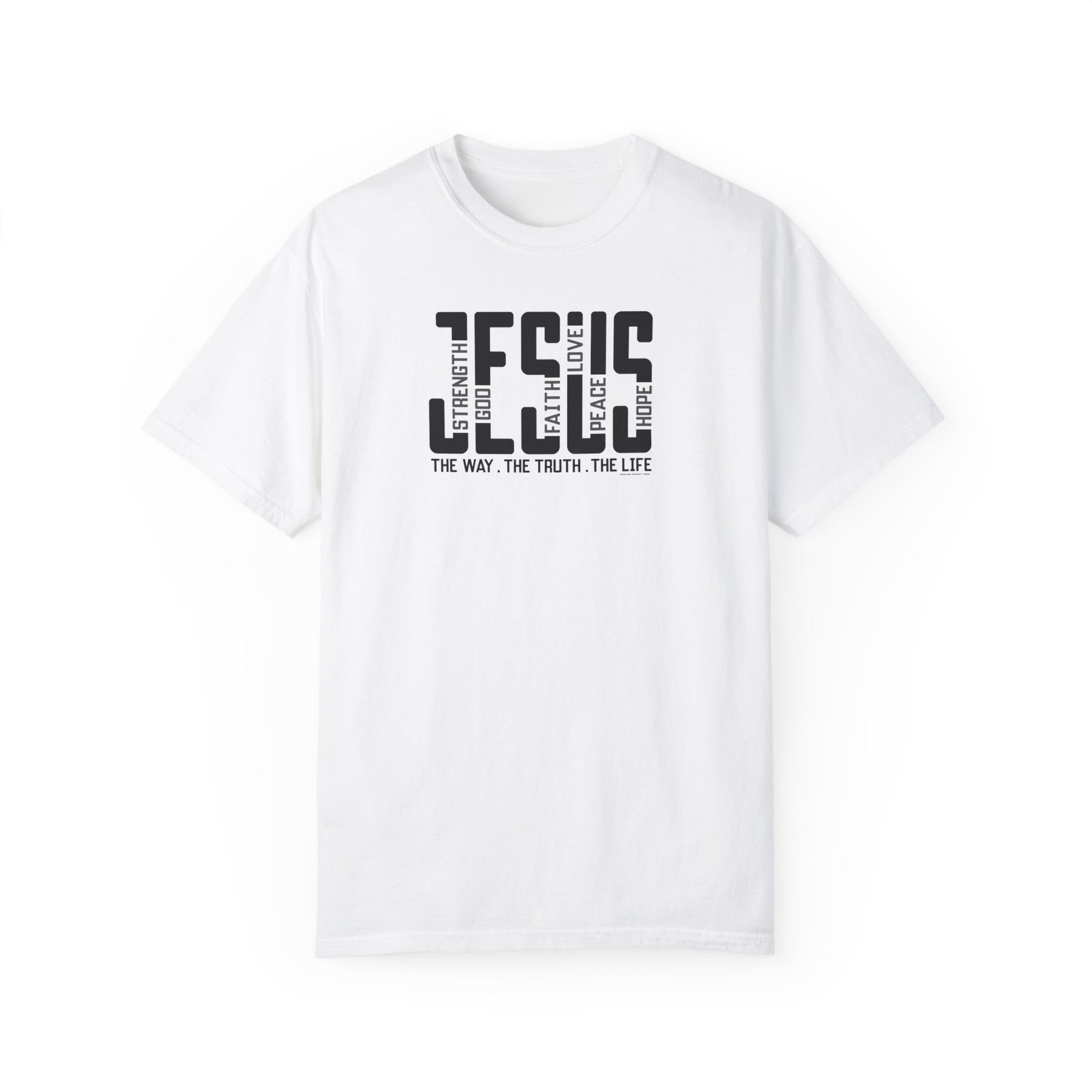 Relaxed fit Jesus Tee, a ring-spun cotton t-shirt with double-needle stitching for durability. Soft-washed, garment-dyed fabric for coziness. No side-seams for a tubular shape. Sizes S-4XL.