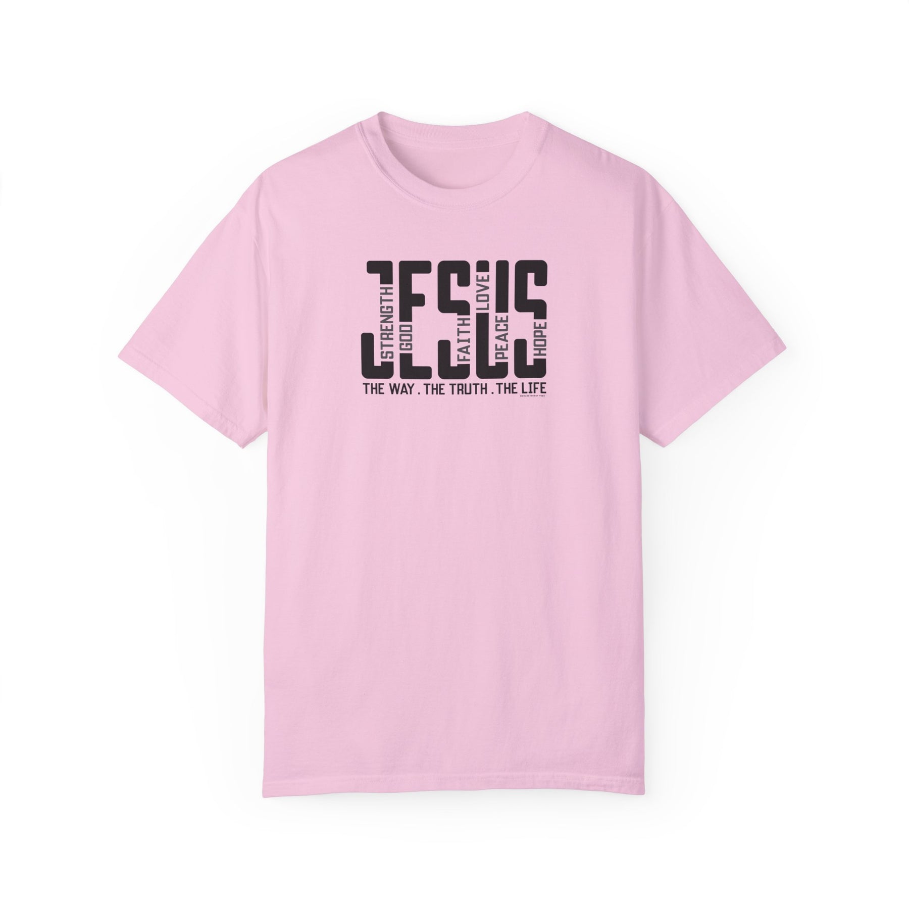 A relaxed fit Jesus Tee in pink with black text, made of 100% ring-spun cotton. Garment-dyed for extra coziness, double-needle stitching for durability, and no side-seams for shape retention.