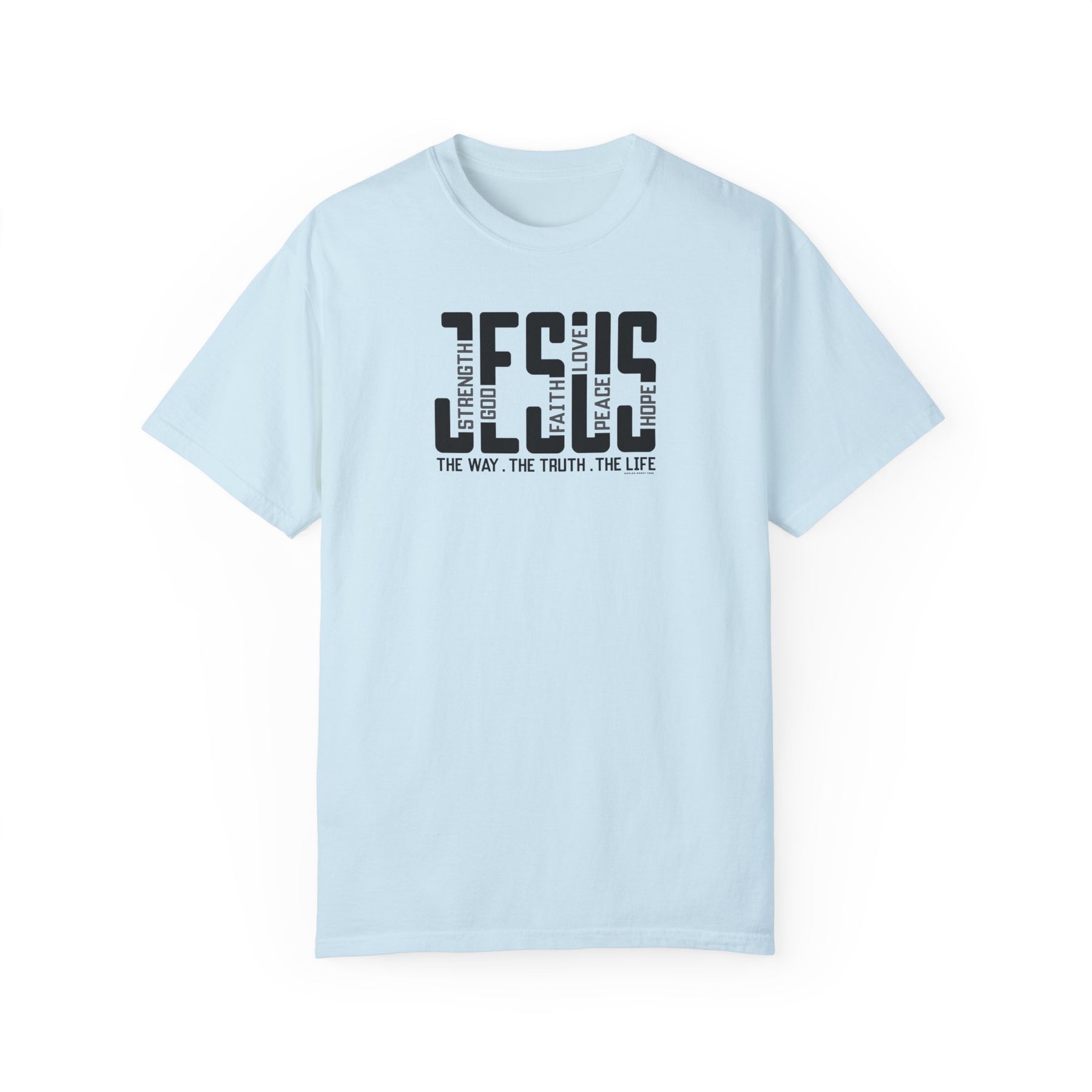 Jesus Tee: Light blue t-shirt with black text. 100% ring-spun cotton, garment-dyed for coziness. Relaxed fit, durable double-needle stitching, seamless design. From Worlds Worst Tees.