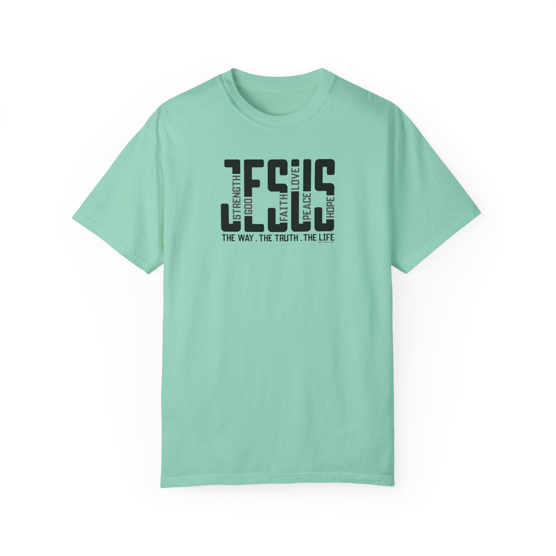 A Jesus Tee in green with white text, made of 100% ring-spun cotton. Garment-dyed for extra coziness, featuring a relaxed fit, double-needle stitching, and no side-seams for durability and shape retention.