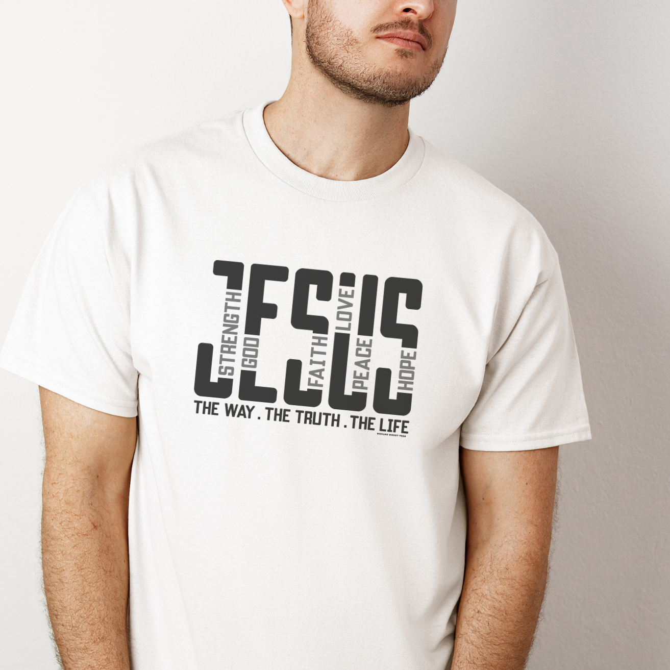Relaxed fit Jesus Tee, white t-shirt with black text. 100% ring-spun cotton, soft-washed, durable double-needle stitching, tubular shape. Ideal for daily wear.